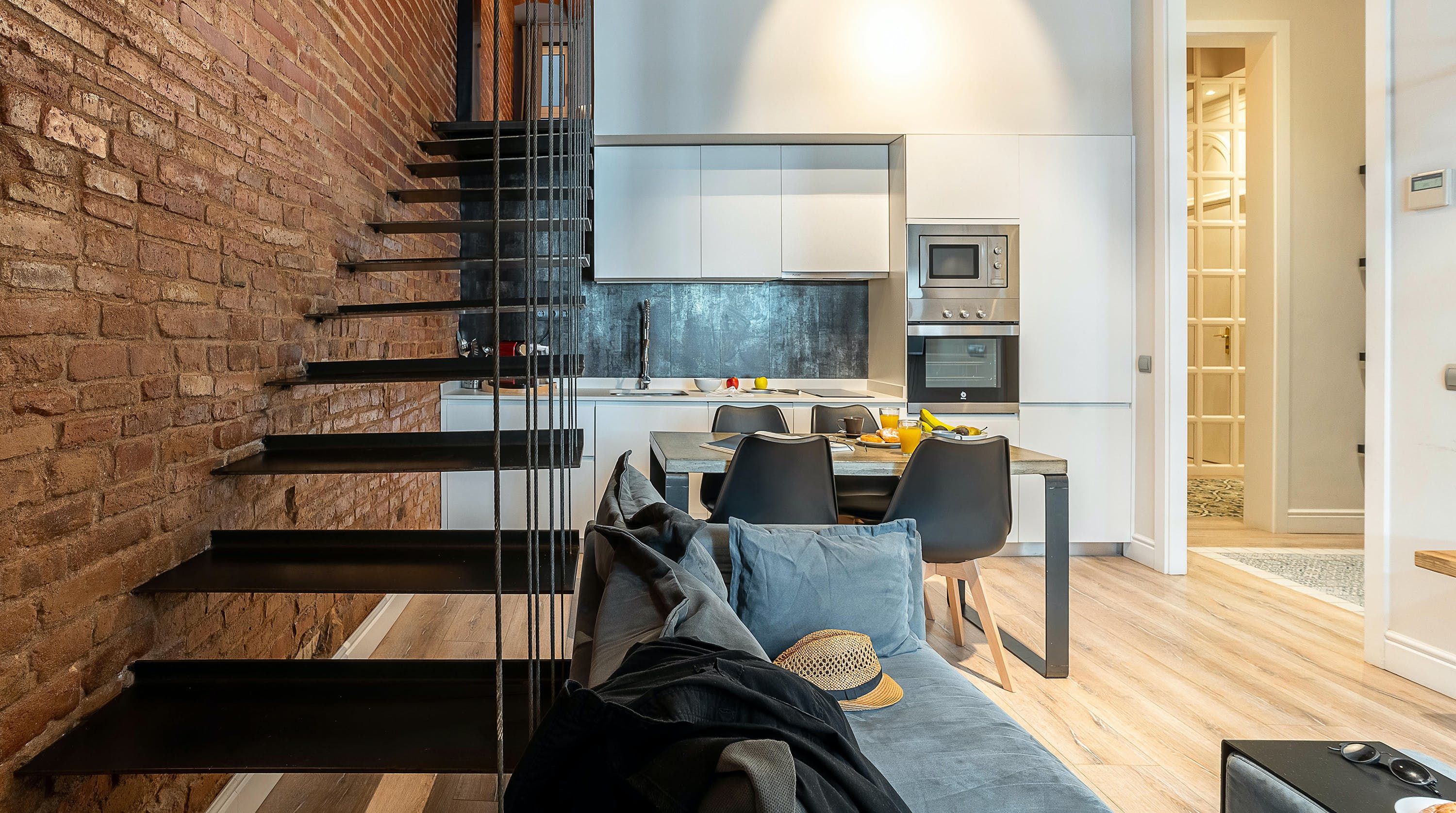 This home is housed in a grand period building. We love the open plan living space with its high ceilings, exposed brick walls and stunning steel, open-tread staircase – this place has a cool, warehouse vibe. Elsewhere in the apartment, you’ll find traditional features such as barrel-vaulted ceilings and Spanish tiles. Open the French doors onto the balcony with its views over the neighbourhood, whip up a fideuà in the modern kitchen and enjoy a Catalan feast at your dining table. This apartment is perfect for a group of friends, a family or professionals on business in this vibrant city.