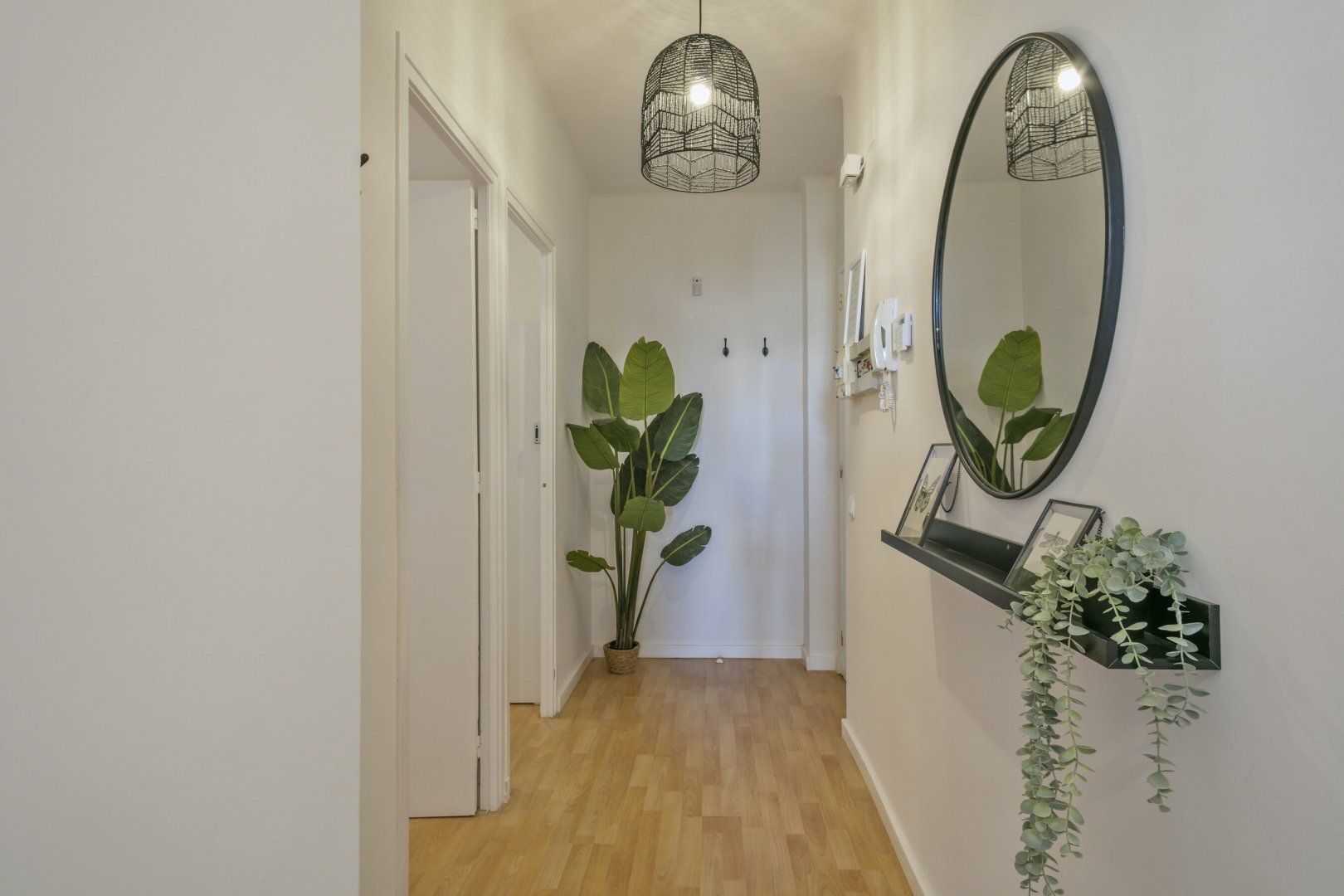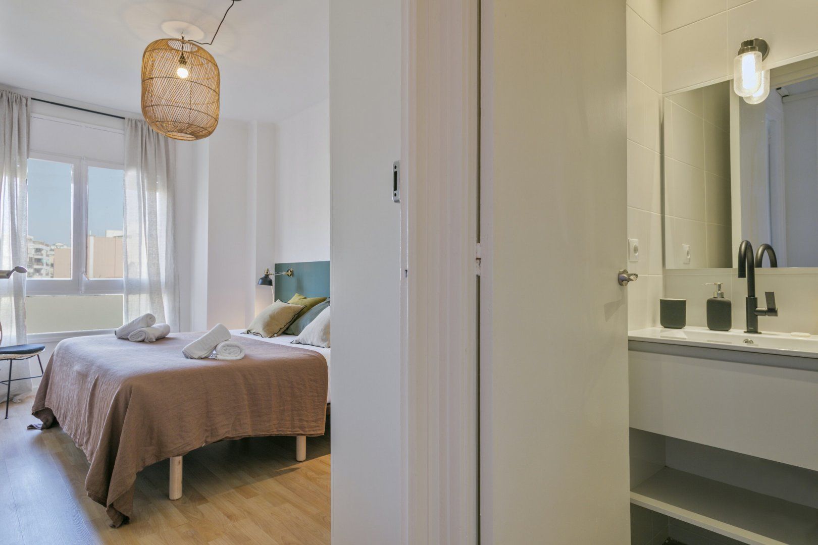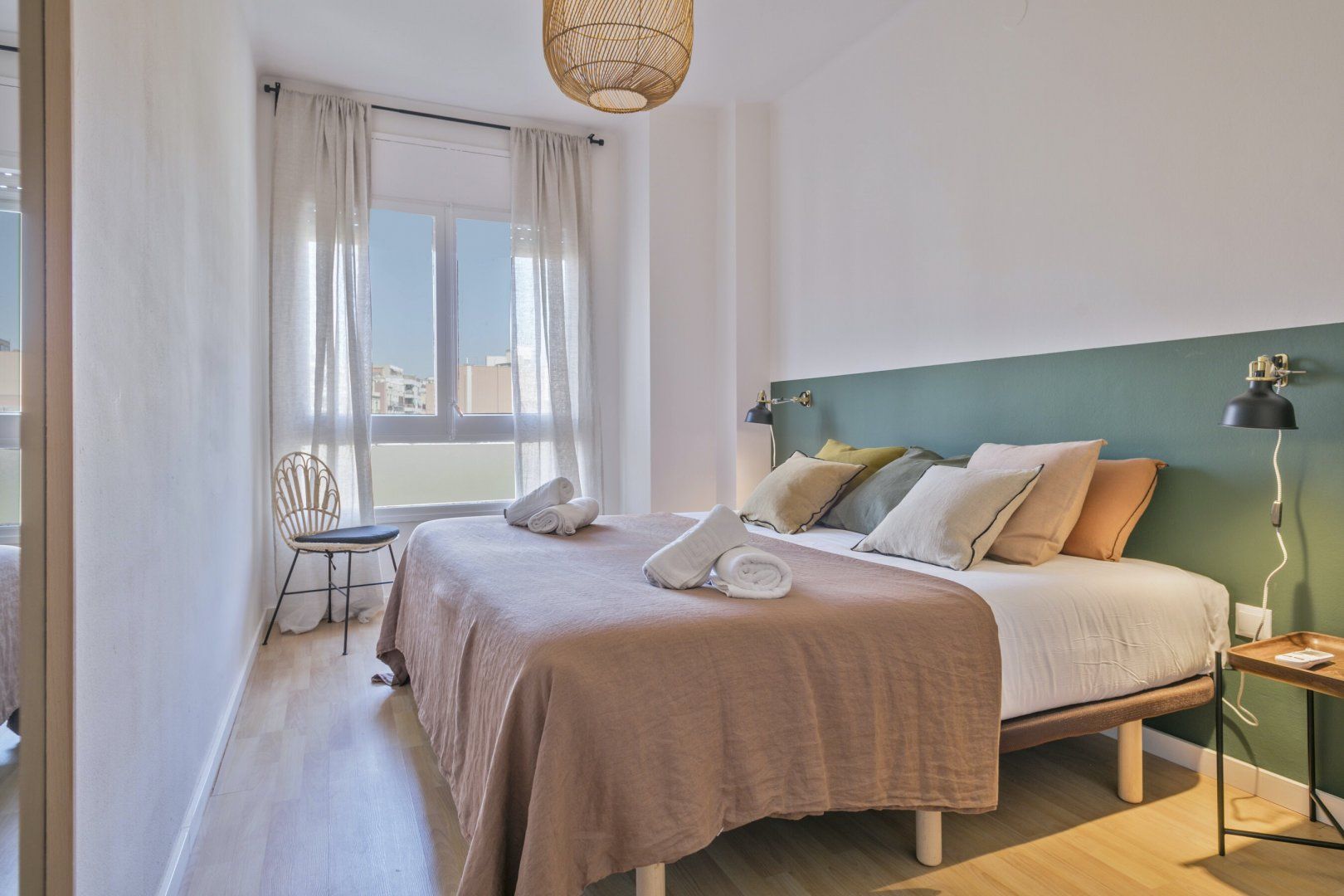 One of the first things you'll spot from the private balcony of this smart apartment is the Xemeneia de la Bordeta – the historic smokestack of one of the 19th Century porcelain factories this area was famed for. Today it's a protected landmark standing tall in the small square of Plaça de Joan Corrades i Bosch, just opposite this colourful, freshly renovated home.