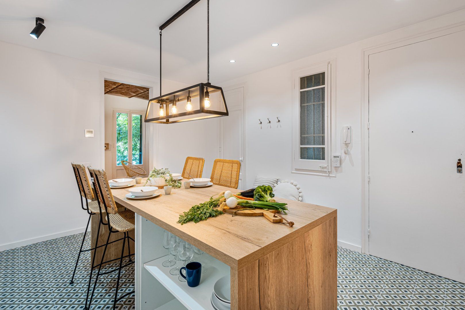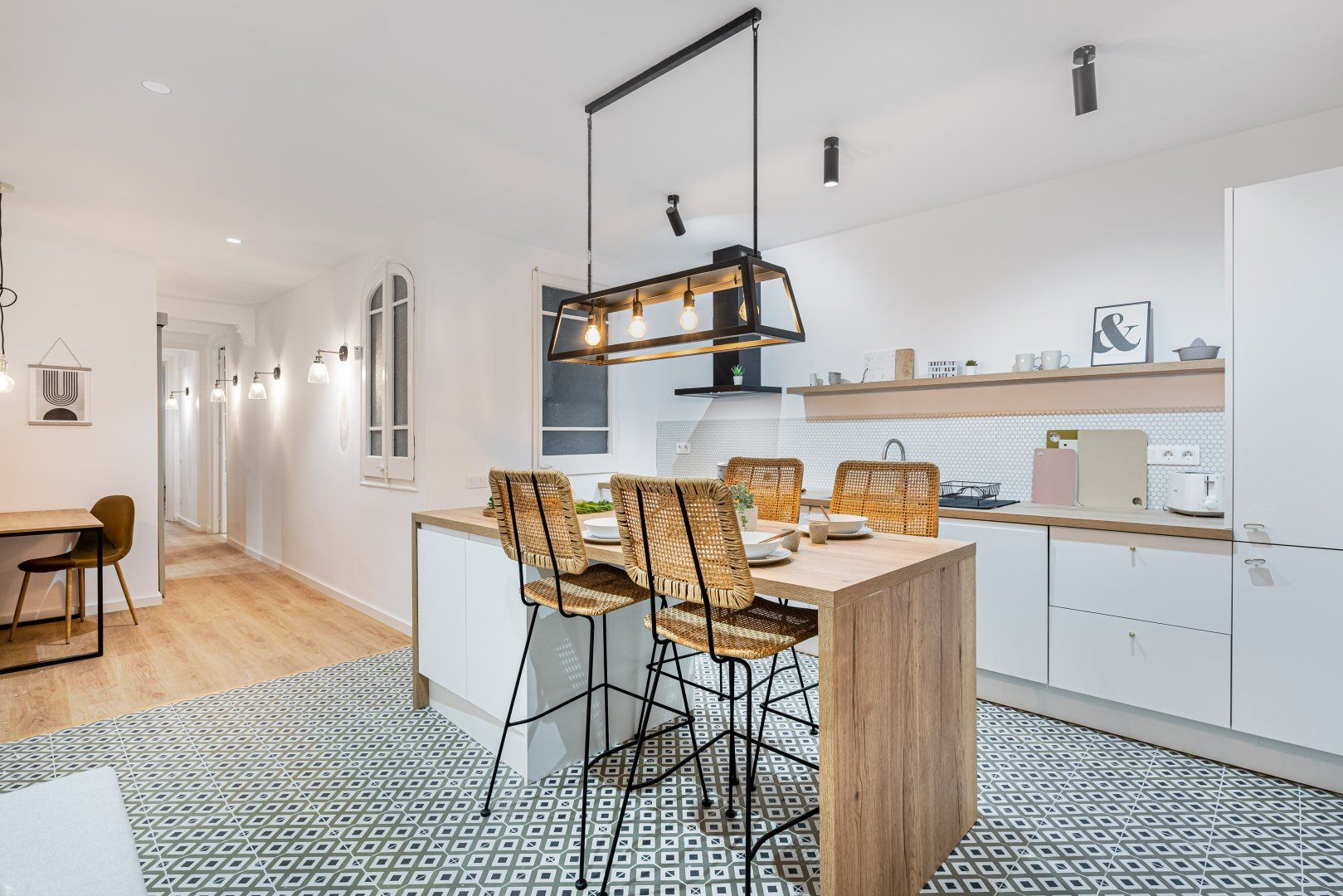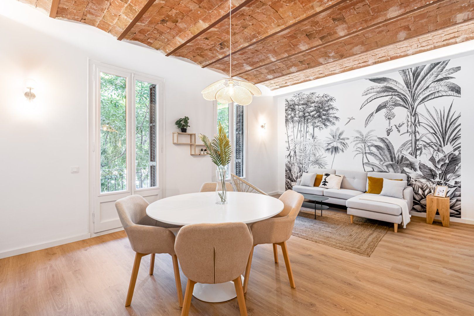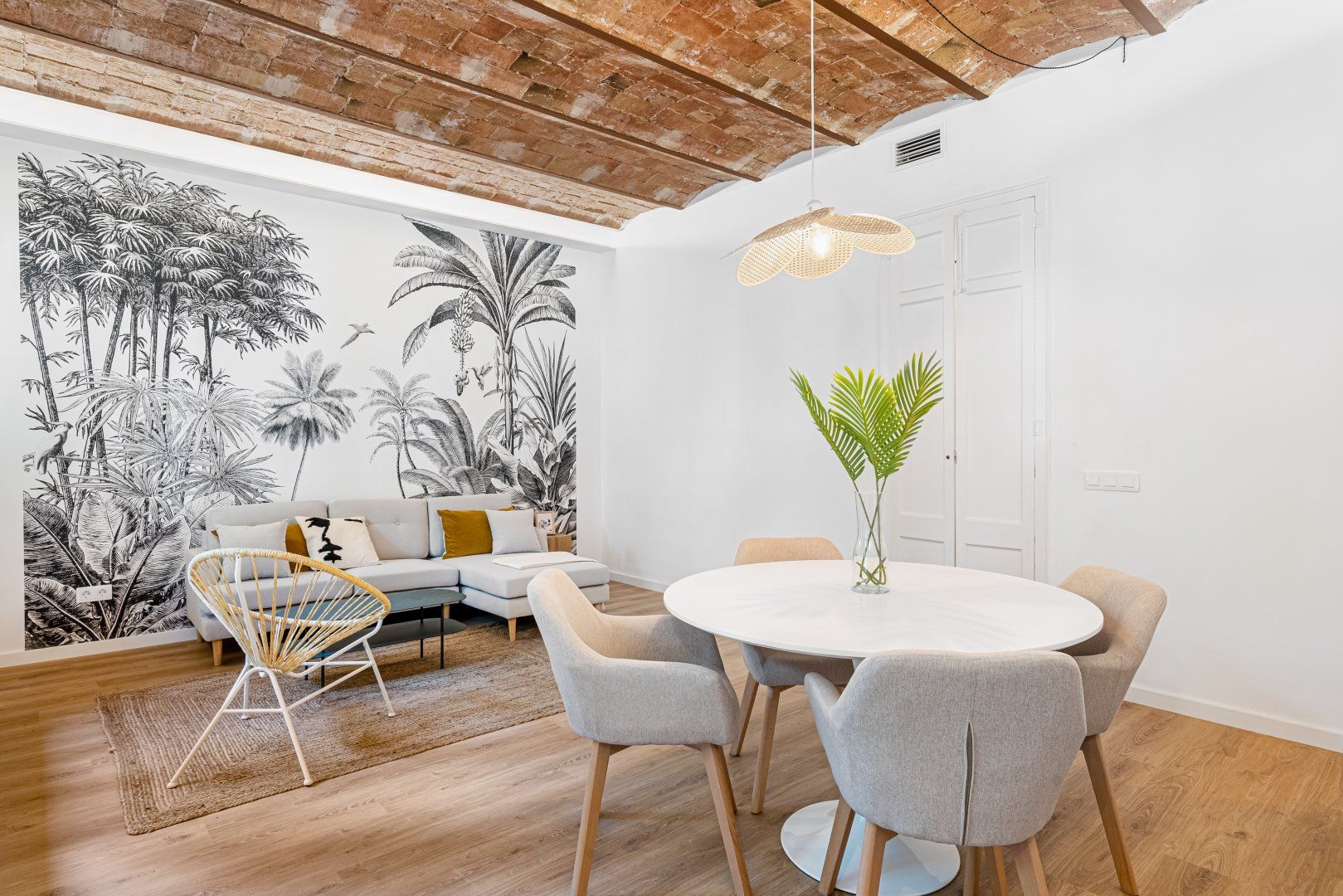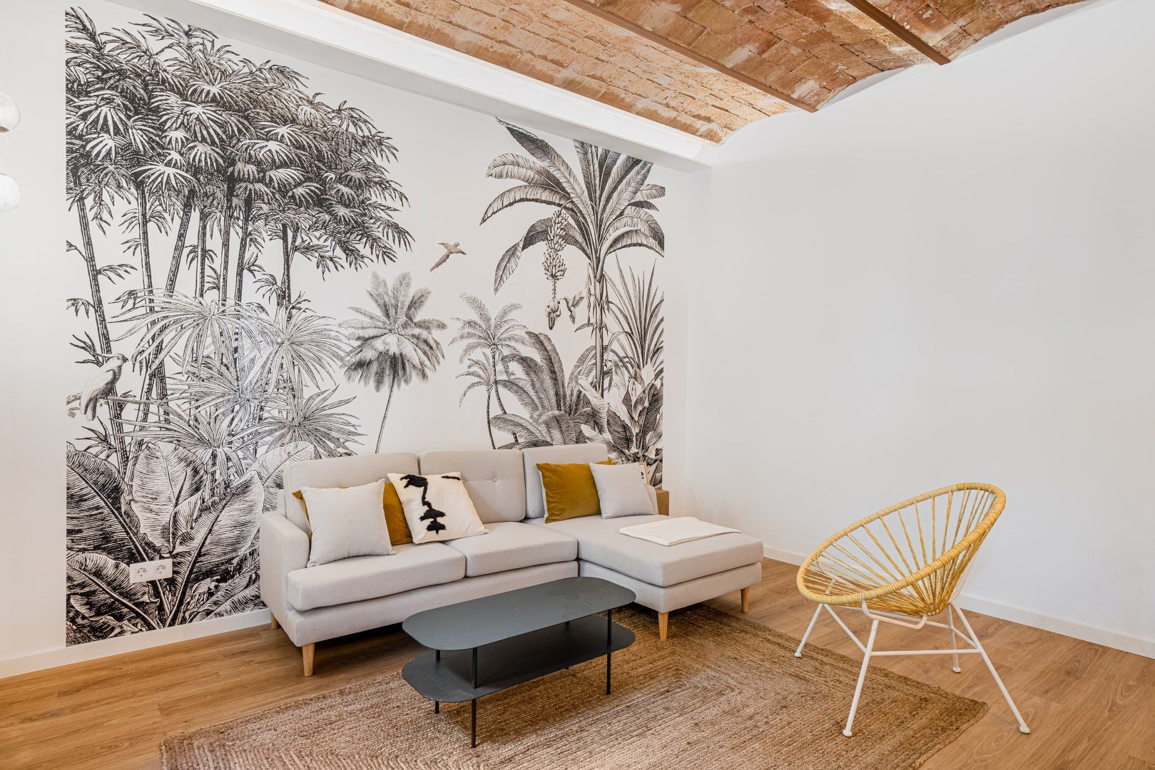 This airy and sleek apartment welcomes you inside, where avant-garde style meets sea breezes and sandy beaches. The huge living space, which extends out invitingly onto a lovely balcony, merges with the strikingly original and flawless trendy furniture, a tropical black and white artistic wall, and a traditional, red-brick, Catalan vaulted ceiling. The stunning tiled kitchen features an island in the centre, great for a drink of wine and a chit chat.