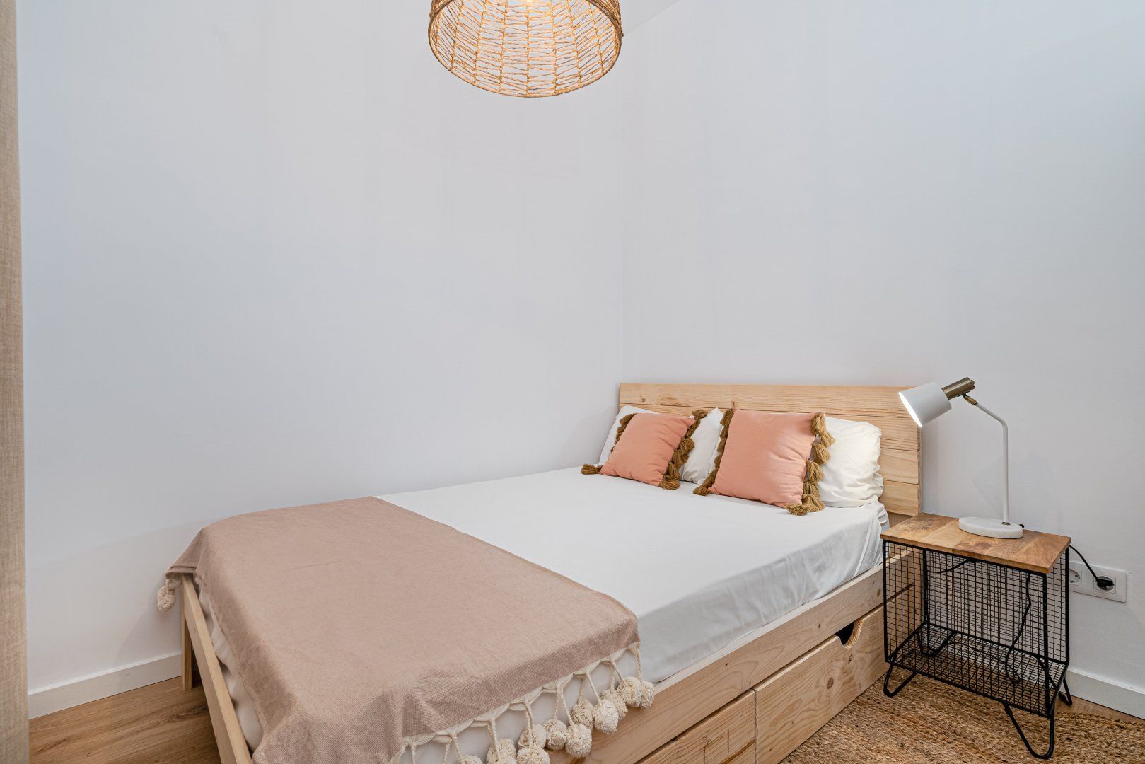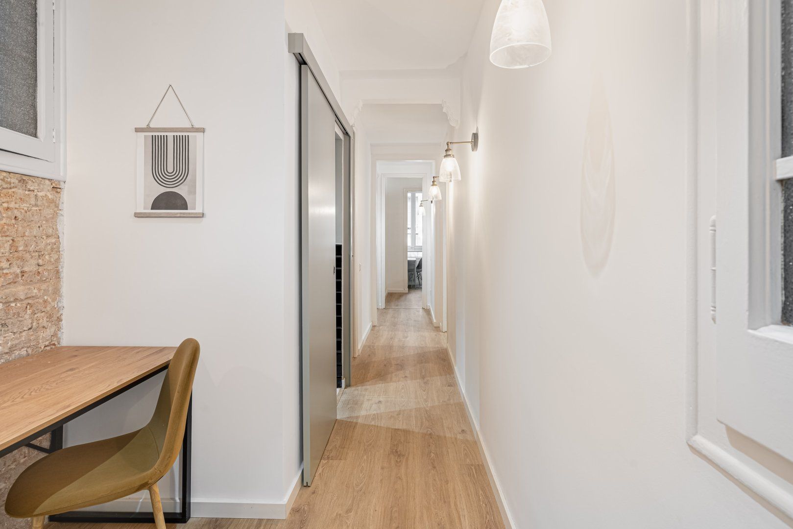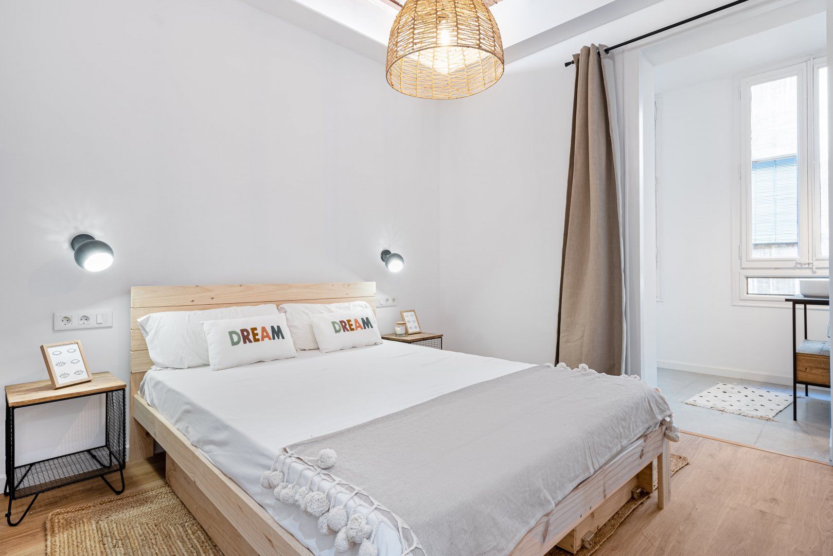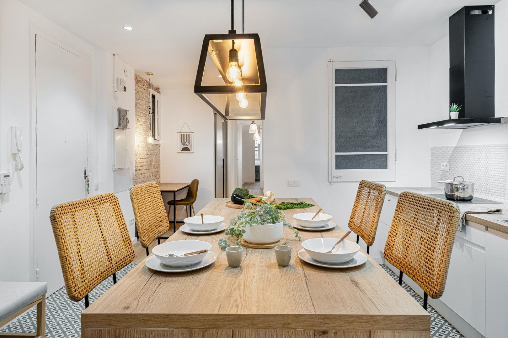 This airy and sleek apartment welcomes you inside, where avant-garde style meets sea breezes and sandy beaches. The huge living space, which extends out invitingly onto a lovely balcony, merges with the strikingly original and flawless trendy furniture, a tropical black and white artistic wall, and a traditional, red-brick, Catalan vaulted ceiling. The stunning tiled kitchen features an island in the centre, great for a drink of wine and a chit chat.