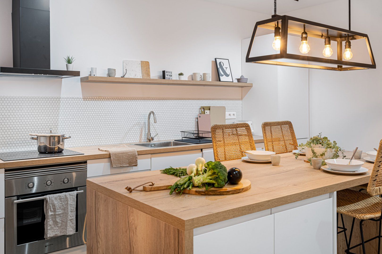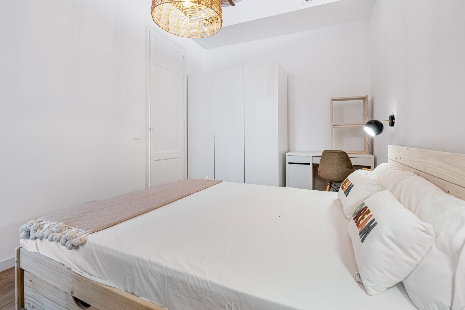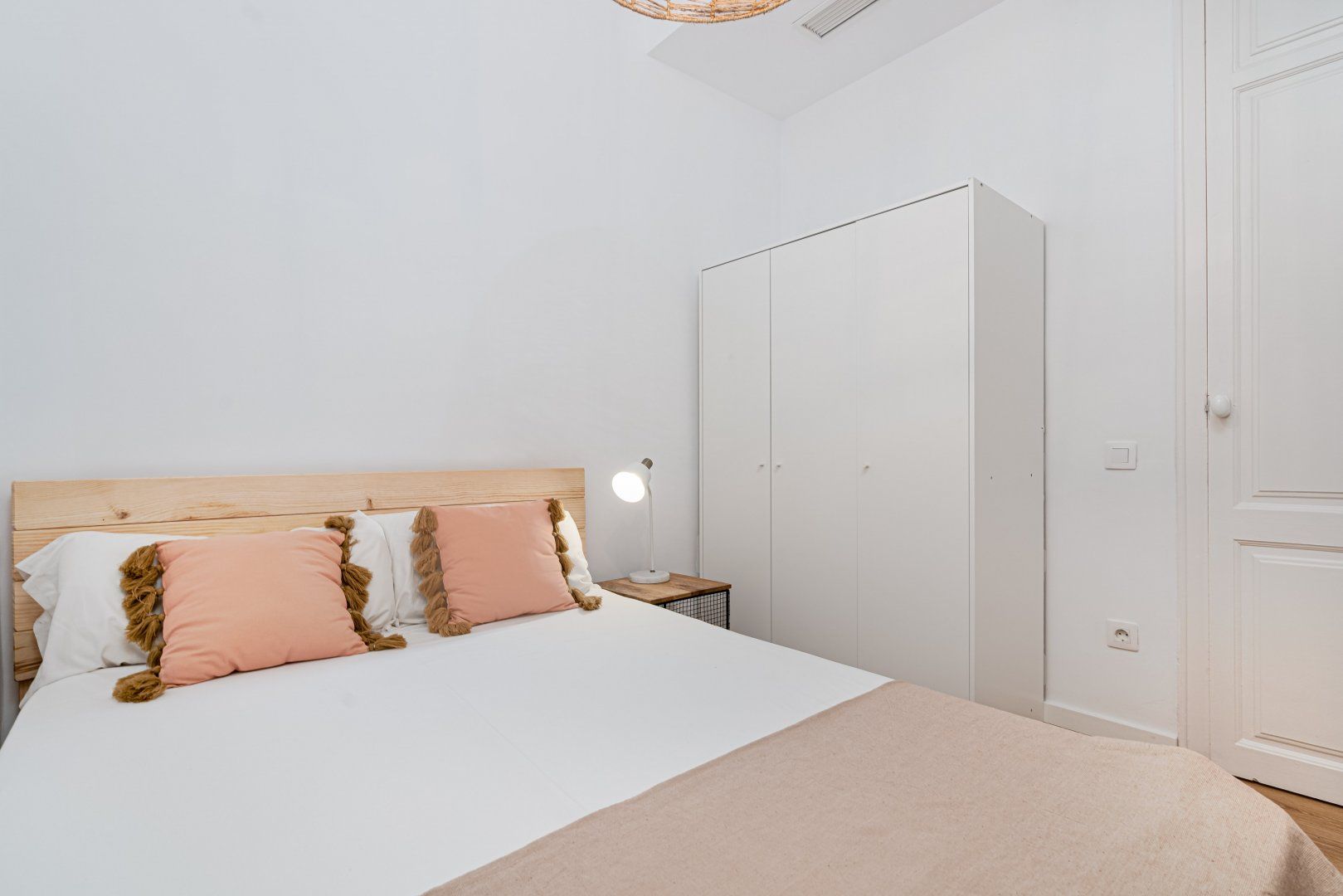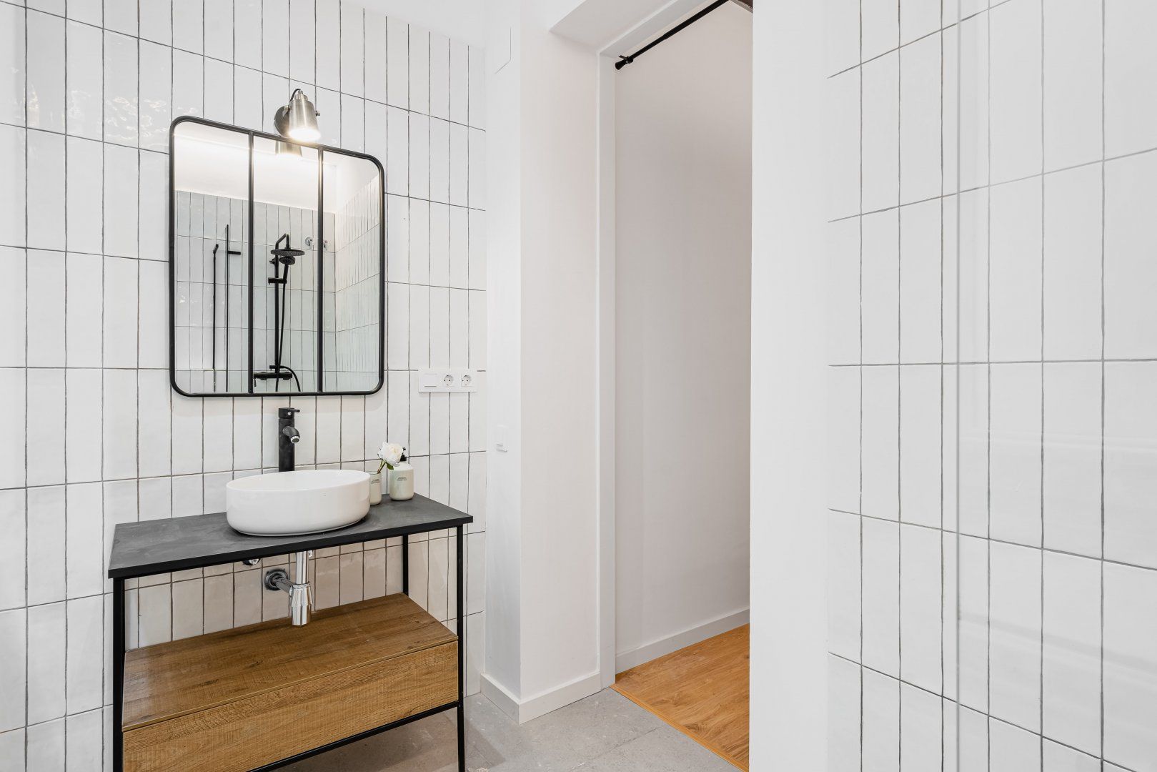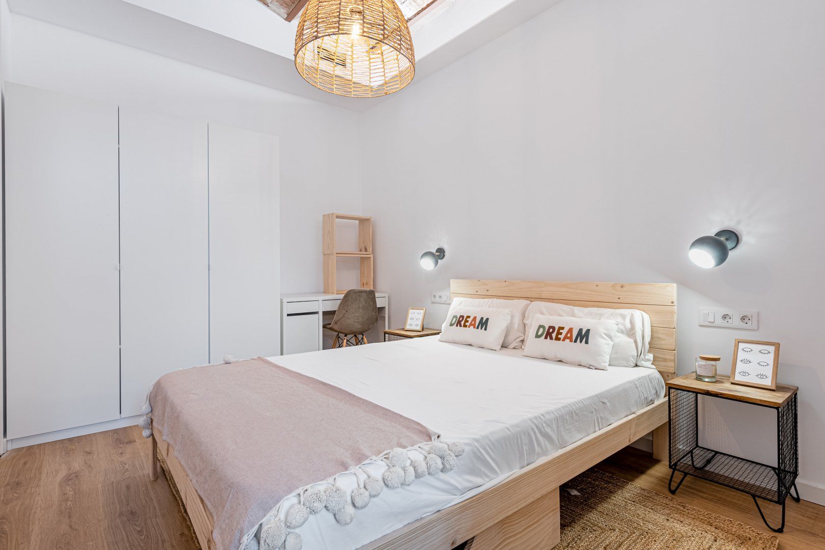 This airy and sleek apartment welcomes you inside, where avant-garde style meets sea breezes and sandy beaches. The huge living space, which extends out invitingly onto a lovely balcony, merges with the strikingly original and flawless trendy furniture, a tropical black and white artistic wall, and a traditional, red-brick, Catalan vaulted ceiling. The stunning tiled kitchen features an island in the centre, great for a drink of wine and a chit chat.