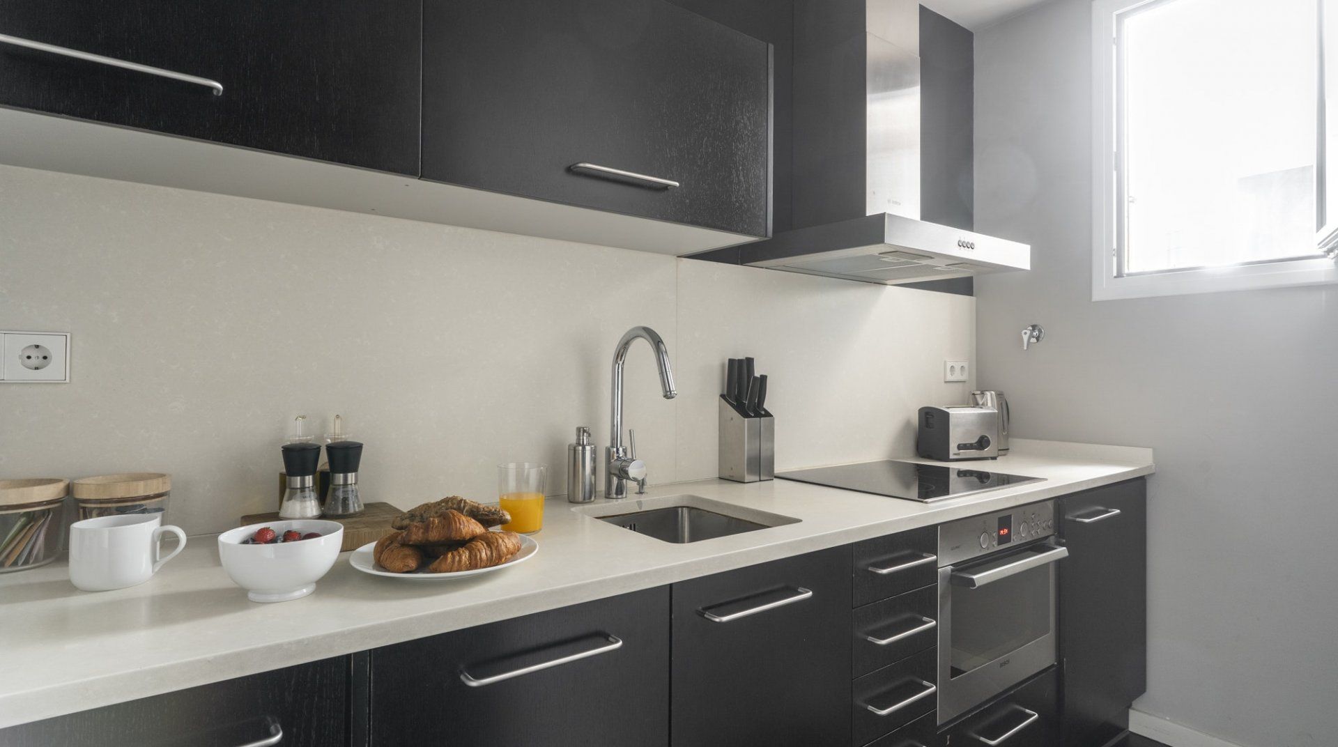 This home is perfect for couples who crave a slice of the city's action. Situated on historic Ronda Universitat, it has excellent views of the street which you can enjoy from the sunny alcove over a morning coffee or evening drink. The home still manages to feel relaxing though, with stand out features like the beautiful white stone kitchen countertop, the pristine wooden flooring and traditional shutters. You'll find all the basics needed for cooking are already here, and there is a juicer and Nespresso machine to make mornings a delight. Downstairs, the surrounding Eixample neighbourhood is famous for its geometrical layout and is brimming with great restaurants, bars, and independent boutiques. It's just a four-minute walk to the Plaça de Catalunya, and the Gothic Quarter is less than fifteen minutes away, where you'll find charming winding streets and plenty of history.