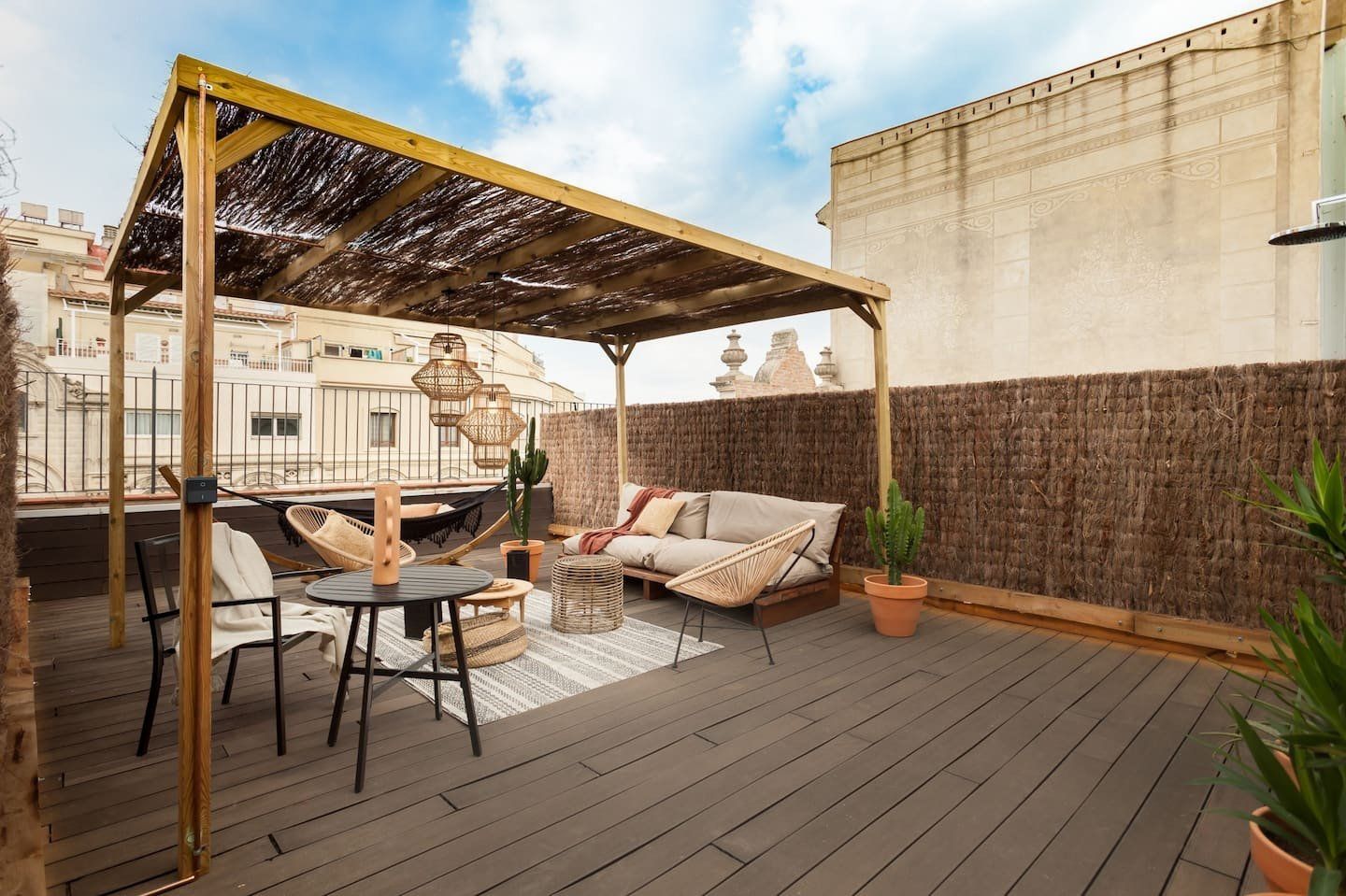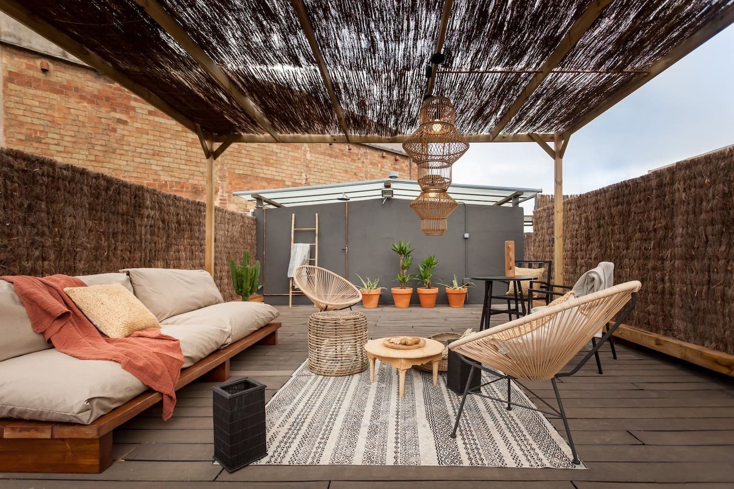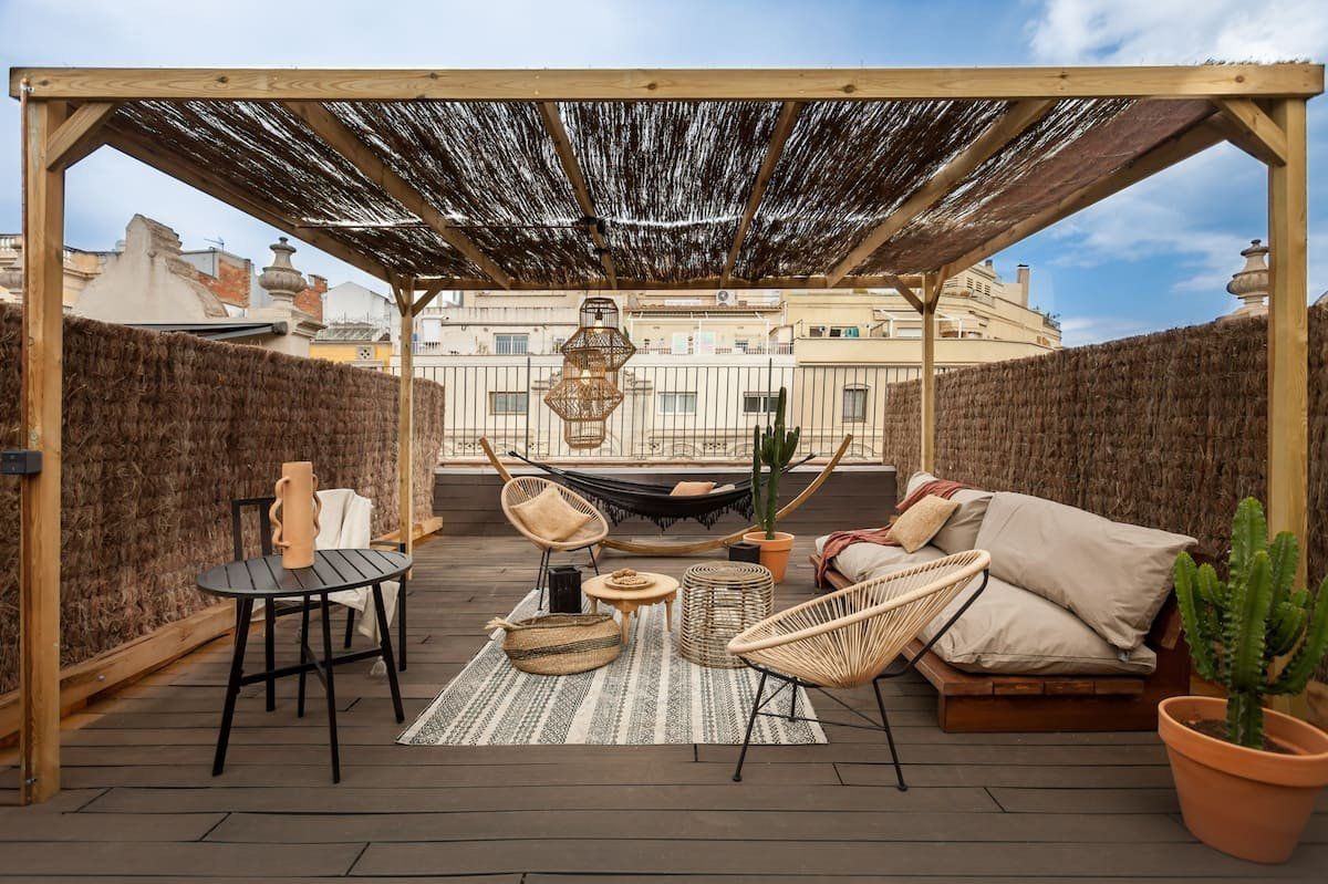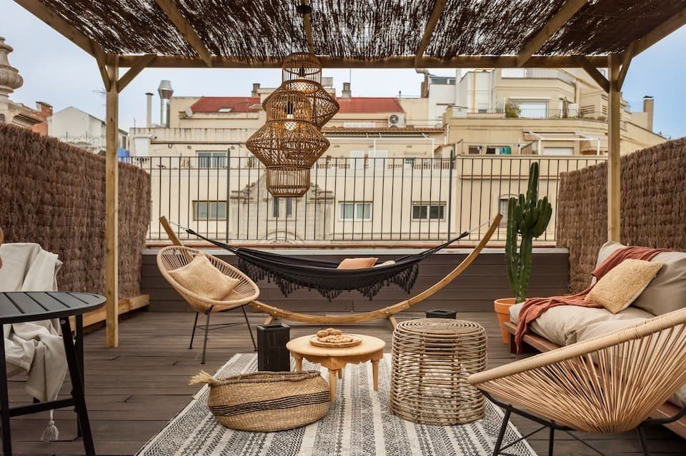 Boho chic meets sophisticated cool in this Barcelona flat in the heart of the Eixample district. The living room oozes laid-back vibes with its plump grey sofa, geometric chandelier and patterned tiles, while its charcoal statement wall perfectly offsets the vibrant green of its statement piece cactus. Make yourself a coffee in the large modern kitchen, then catch up on some work in the sunny study nook, or hang out with a book in the indoor hammock chair. With a private rooftop oasis waiting for you though, there’s no time to lose before soaking up some sun on its inviting deck. Lay back on the outdoor sofa, enjoy a cool drink in the hammock and take in the sweeping city views that surround you. When the Spanish sun gets too hot, treat yourself to an outdoor shower for a refreshing fix. At sunset, mix yourself some rooftop cocktails, then pop a record on in the living room and dance the evening away. Or, head out to explore the city’s scintillating food and bar scene, right on your front door.