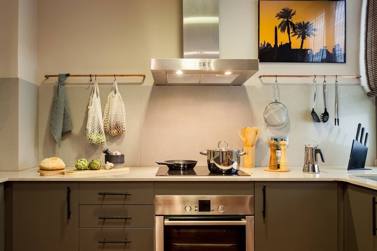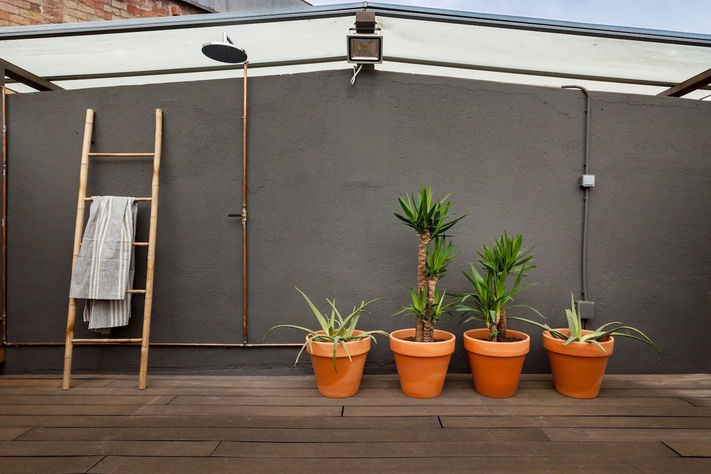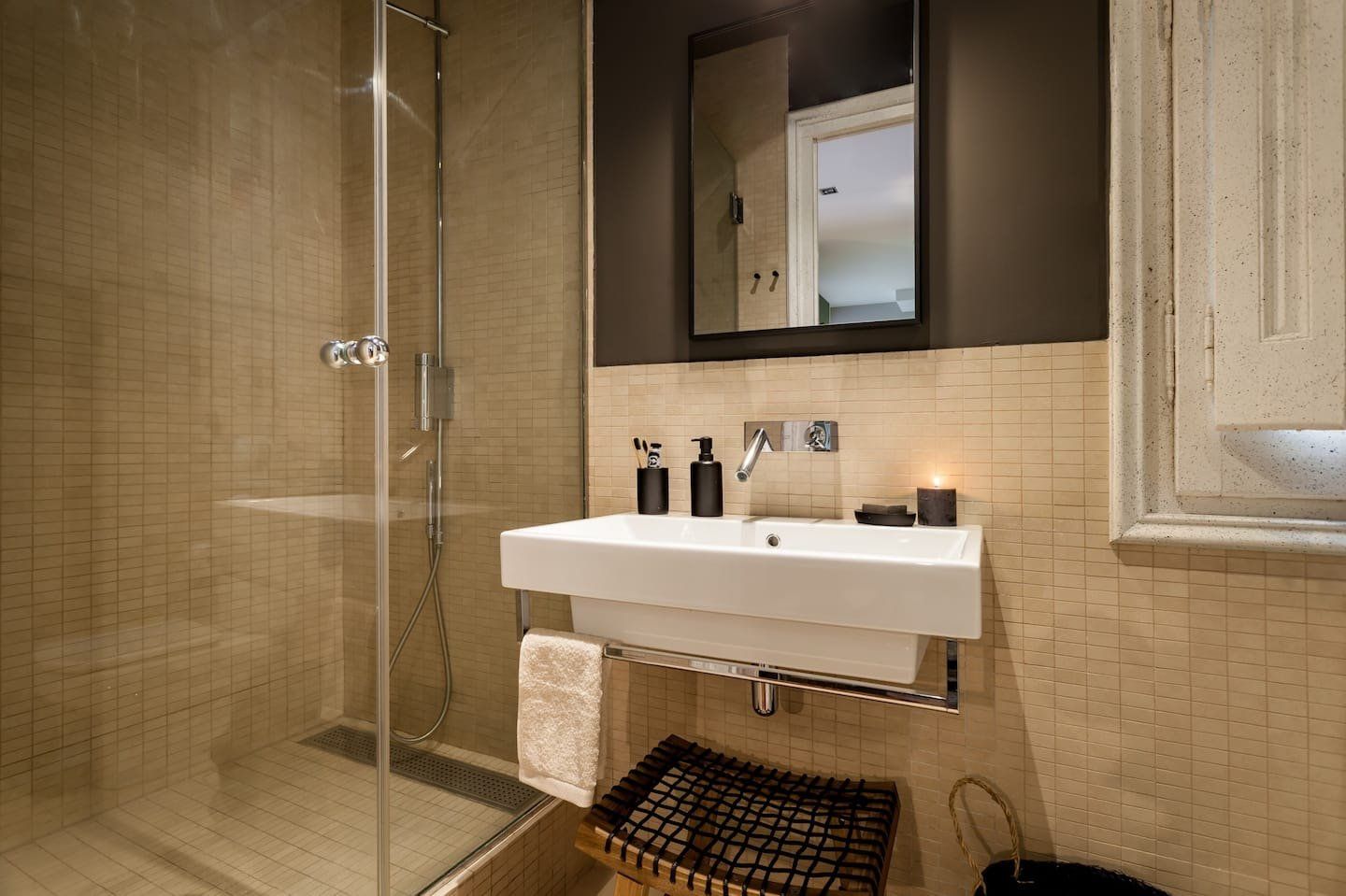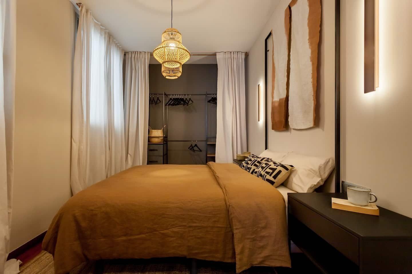Boho chic meets sophisticated cool in this Barcelona flat in the heart of the Eixample district. The living room oozes laid-back vibes with its plump grey sofa, geometric chandelier and patterned tiles, while its charcoal statement wall perfectly offsets the vibrant green of its statement piece cactus. Make yourself a coffee in the large modern kitchen, then catch up on some work in the sunny study nook, or hang out with a book in the indoor hammock chair. With a private rooftop oasis waiting for you though, there’s no time to lose before soaking up some sun on its inviting deck. Lay back on the outdoor sofa, enjoy a cool drink in the hammock and take in the sweeping city views that surround you. When the Spanish sun gets too hot, treat yourself to an outdoor shower for a refreshing fix. At sunset, mix yourself some rooftop cocktails, then pop a record on in the living room and dance the evening away. Or, head out to explore the city’s scintillating food and bar scene, right on your front door.