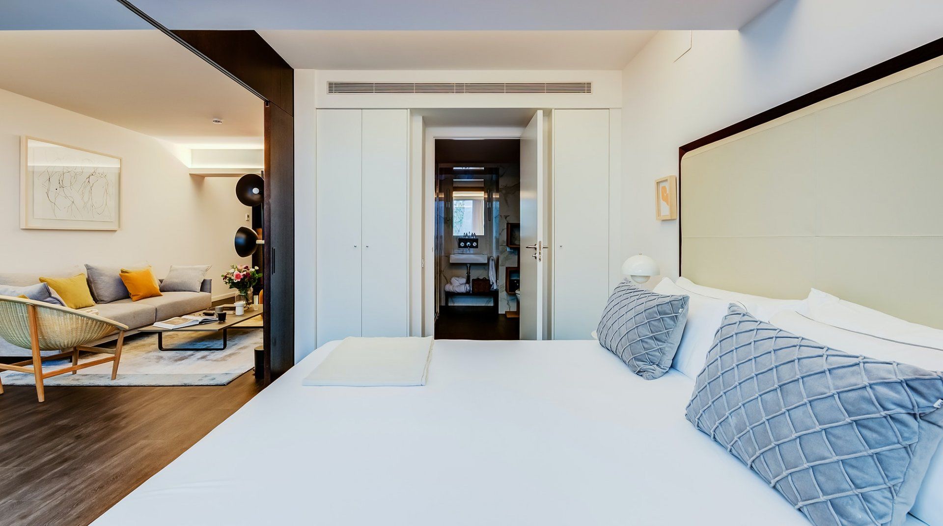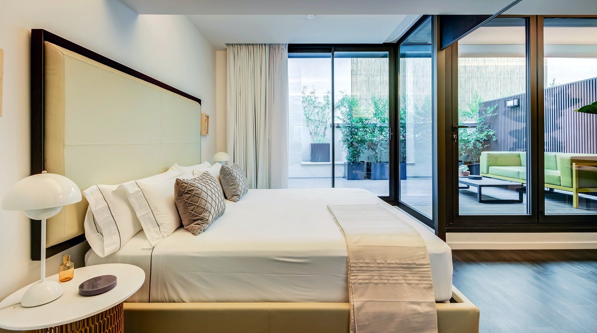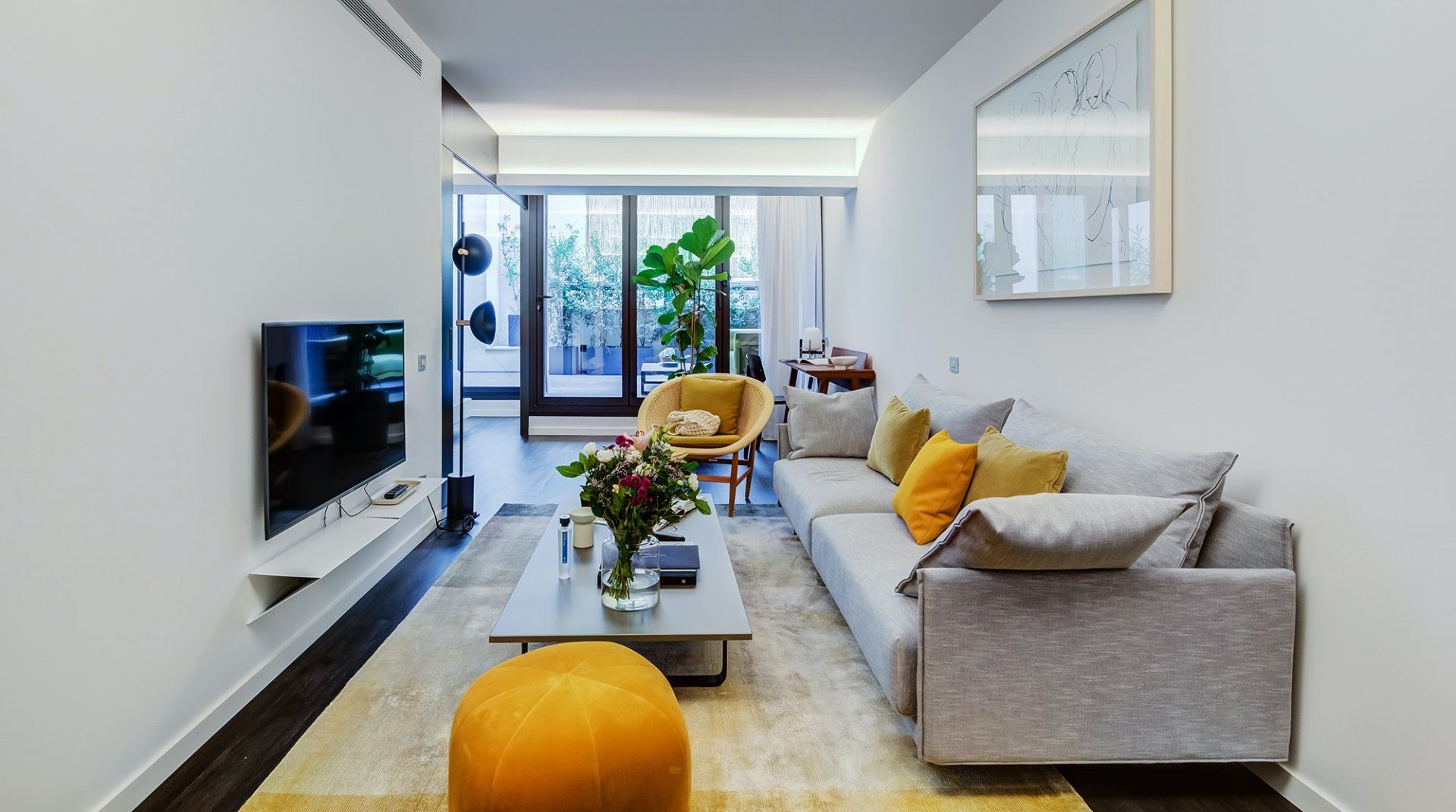 Even though Taffy Terrace has a slightly narrower living room area, it's still an elegant, comfortable home. The star of the show is definitely the terrace with a cosy sofa, which, thanks to the panoramic windows, acts as an extension of the communal areas. The master bedroom especially has spectacular natural light thanks to a whole wall being replaced by the same windows, giving it a beachside feel. You'll be staying in a near-perfect location – right in the middle of Passeig de Gràcia, but tucked away on a quiet side street.