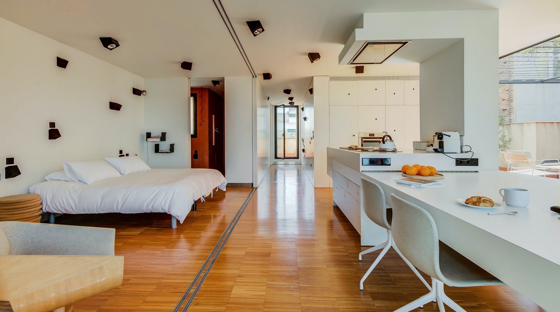 With 360-degree views overlooking the entire city from the panoramic windows and outdoor space – this really is a place to savour the good times. There are three (yes three) terraces to enjoy the Barcelona sunshine on – pour a glass of cava and totally unwind on the sun loungers, relish an alfresco lunch or cool off in the outdoor showers. Playful and expertly designed, the modular living areas of this penthouse let you adjust the space – shutting off or opening up bedrooms – as you wish. The sleek kitchen with a floating countertop is social and inviting – it’s the perfect place to entertain. Out and about, take advantage of all the bars, cafes and restaurants this district has to offer (your host can make reservations for you). If you love art, head to the Barcelona Museum of Contemporary Art, a ten-minute stroll away. Mercat de Sant Antoni, a vibrant market full of fresh produce, is just over a five-minute saunter, or for more shopping opportunities – check out Las Ramblas, a fifteen-minute wander. It's the same walking distance to Plaça de Catalunya, while Barcelona Cathedral is twenty minutes on foot. Basically, there are more attractions nearby than you can shake a stick at.