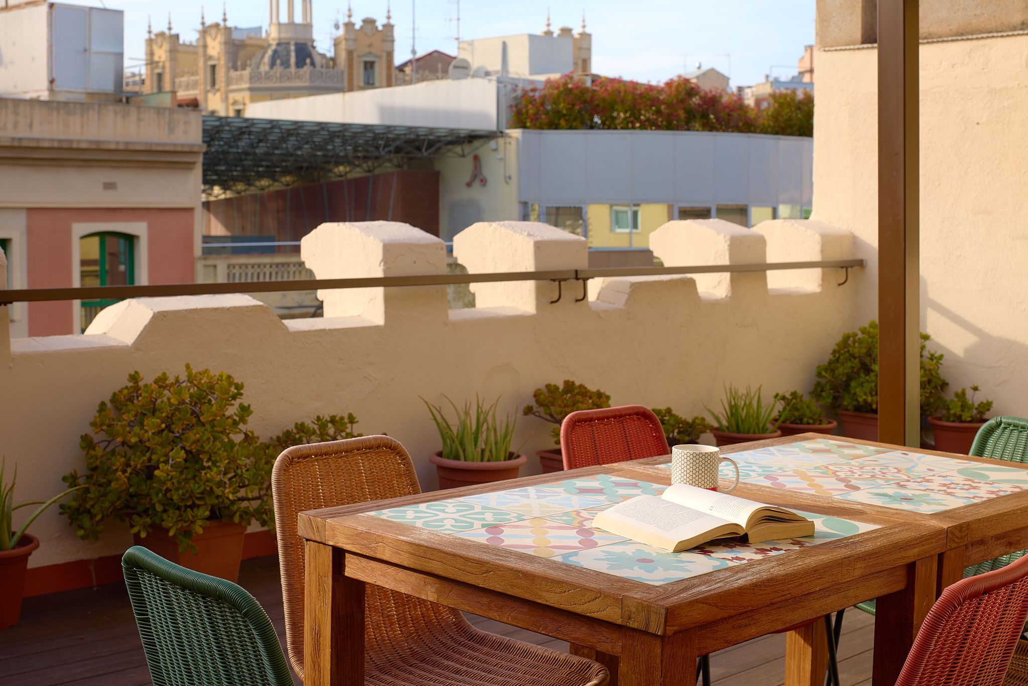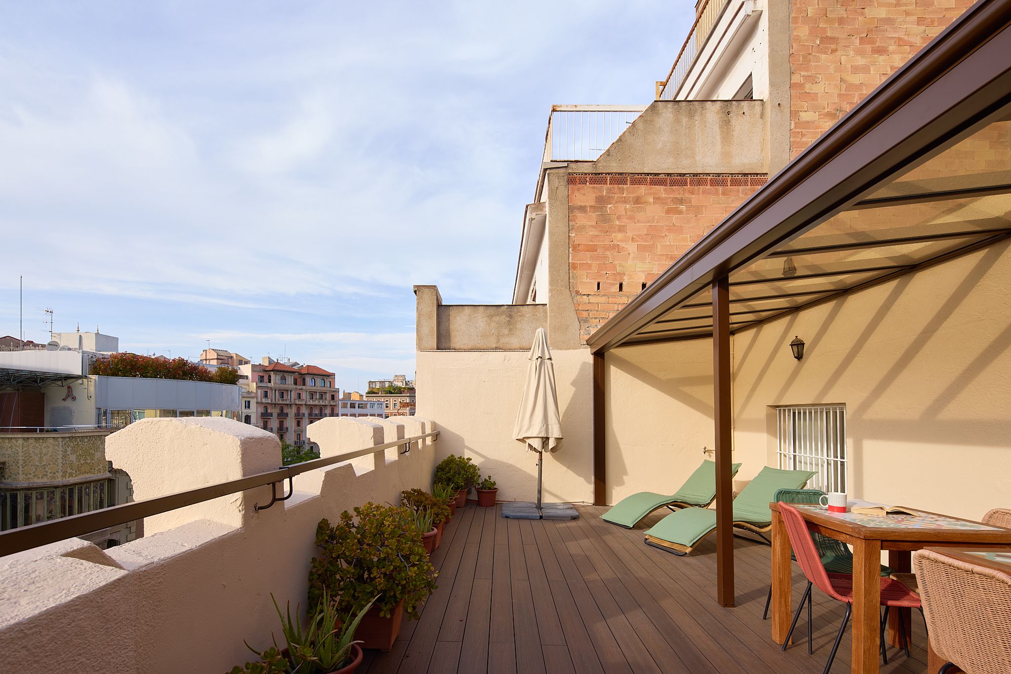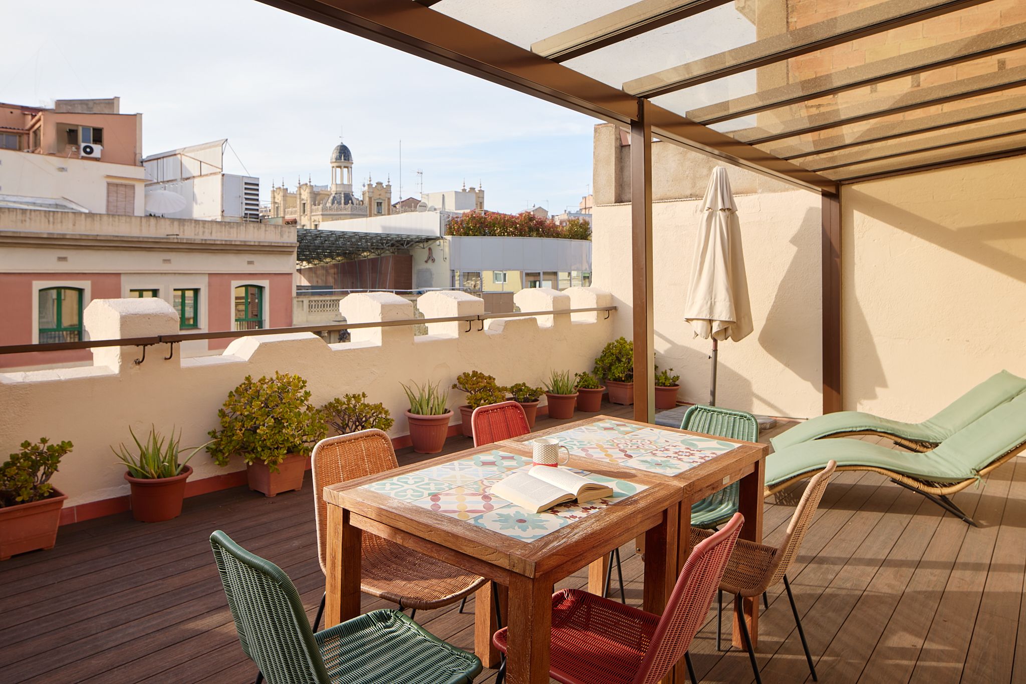 When home is only a three-minute walk from Casa Milà, you can be quite sure that you’re living in the heart of Barcelona’s buzzing Eixample district. But how about if you can see directly across to its ornate rooftops from your own private terrace? The exclusive location of this apartment is only made better by its magnificent design and decor. Upon arrival at the majestic wooden door, you can tell that this historical building is full of charm. With a vintage wooden lift taking you up to the attic – better known as a penthouse in the 21st century – we love its old-fashioned character. Inside, the wooden theme continues with a striking piece of art in the lounge, but this time surrounded by modern interiors. The furnishings are minimalist, with neutral tones and white walls bringing a fresh vibe. However, this is all to make way for the apartment’s most exciting features – two terracotta terraces for alfresco drinking, dining, and admiring jaw-dropping views. If you do manage to make it back down to street level, Diagonal metro is a two-minute walk. But when you can see Gaudí’s masterpieces from home, you might want to stay put.