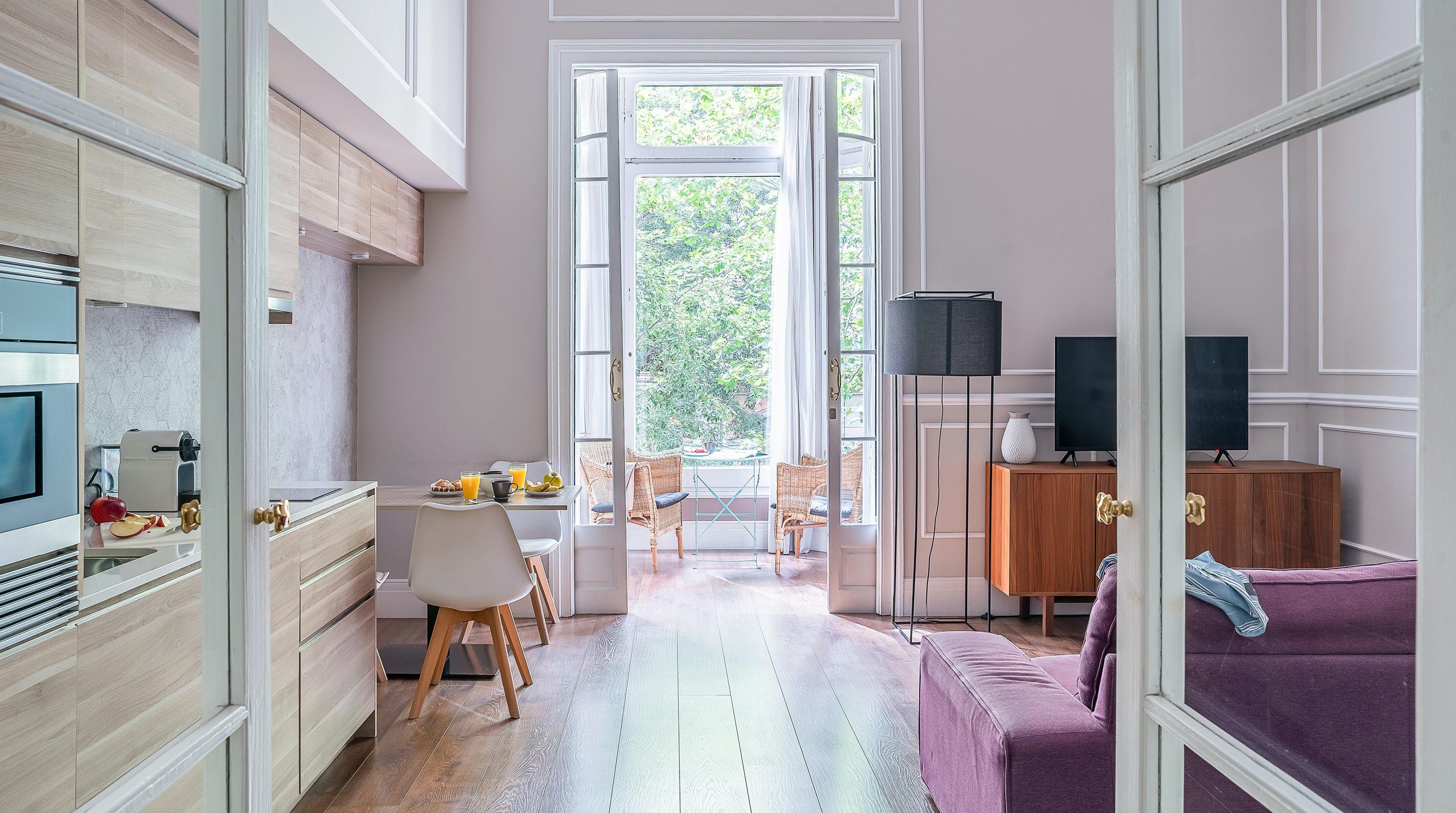 Stepping through the old wooden doors and into this building feels inspiring – it's steeped in tradition with echoes of Spain’s impressive architectural heritage. And the elegance continues inside this apartment. Period features sit alongside luxurious details creating a sense of warmth and character – making it easy to settle in and feel at home. Whether you're preparing drinks in the kitchen or simply watching the sunlight dance across the treetops – this is the kind of space that enriches the moment.