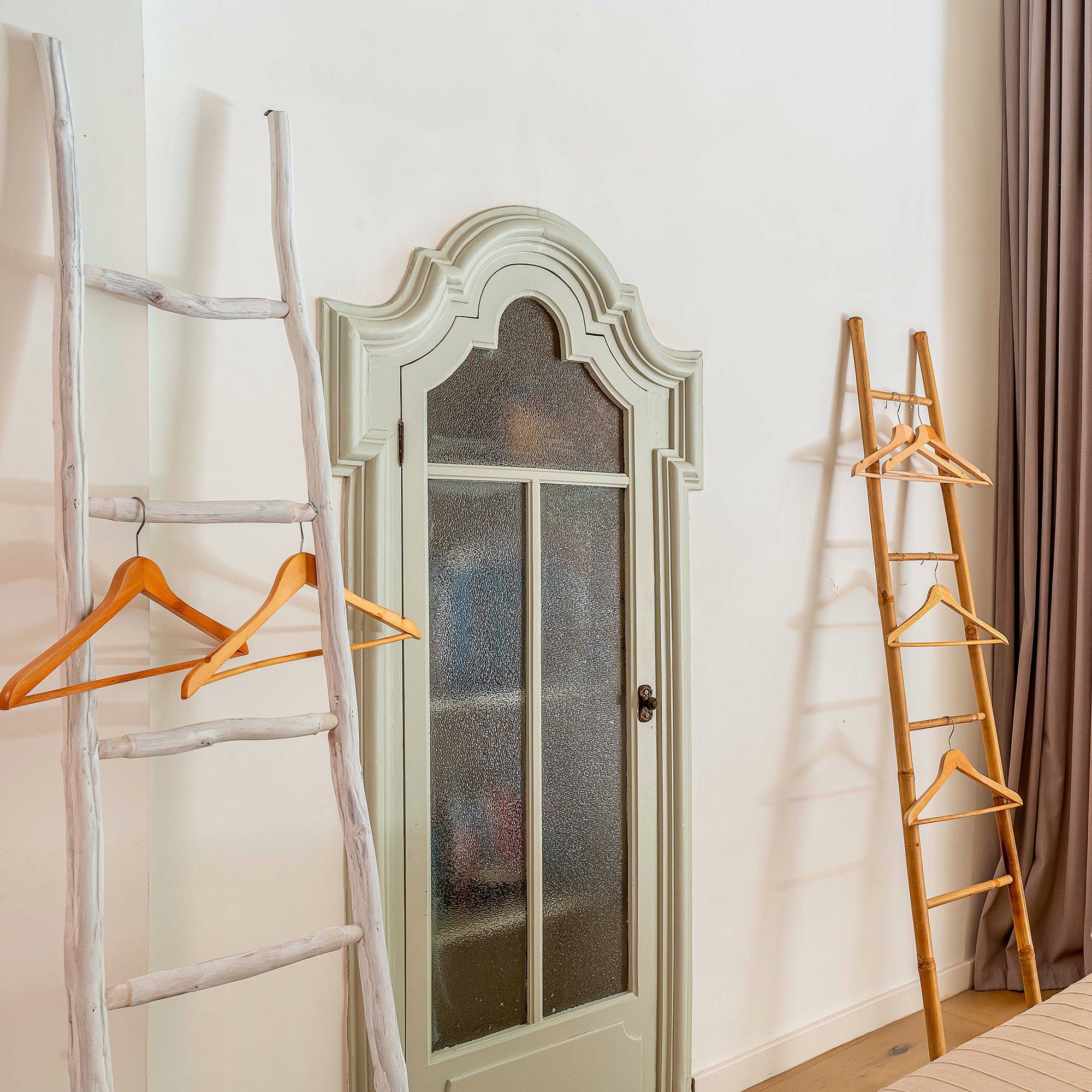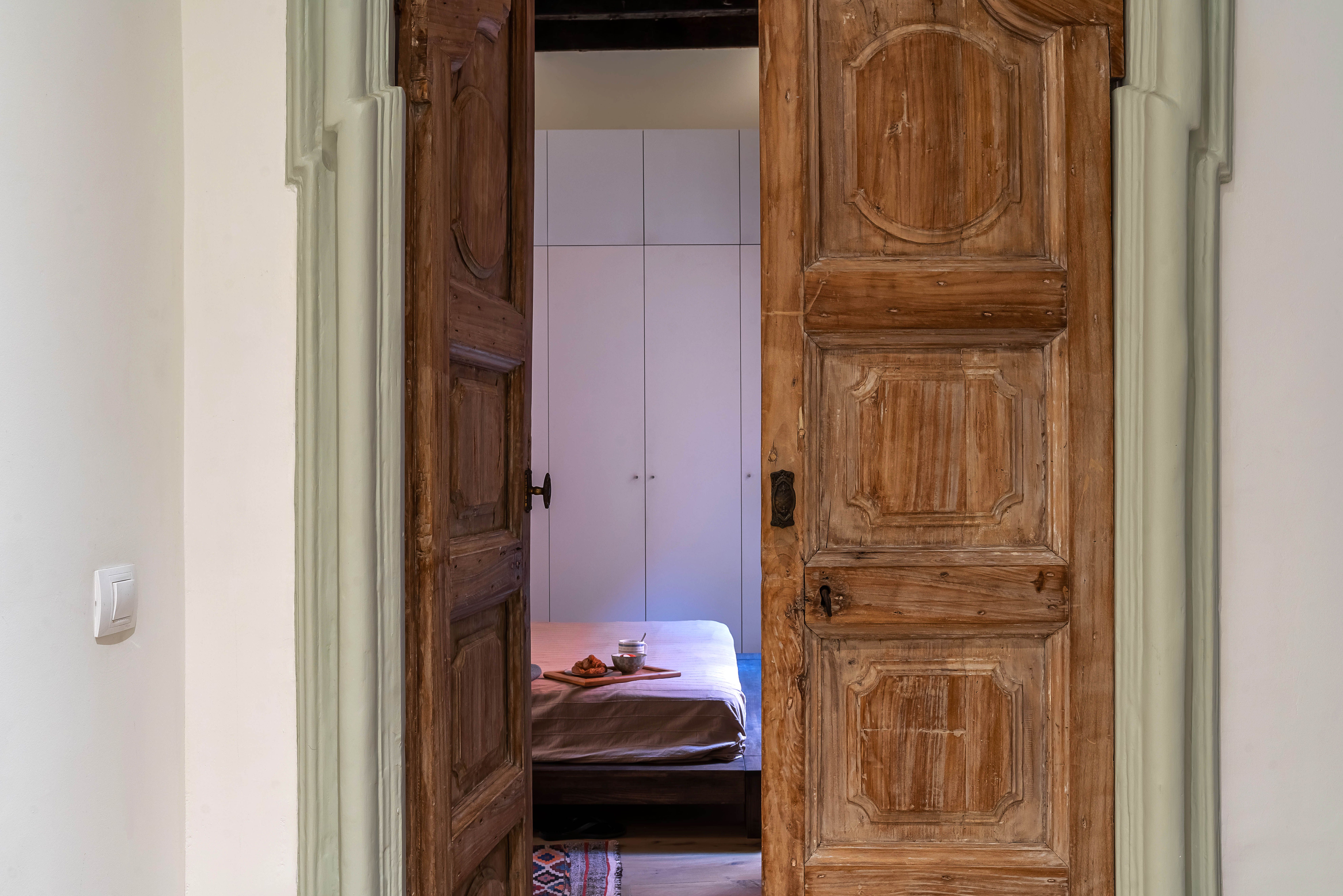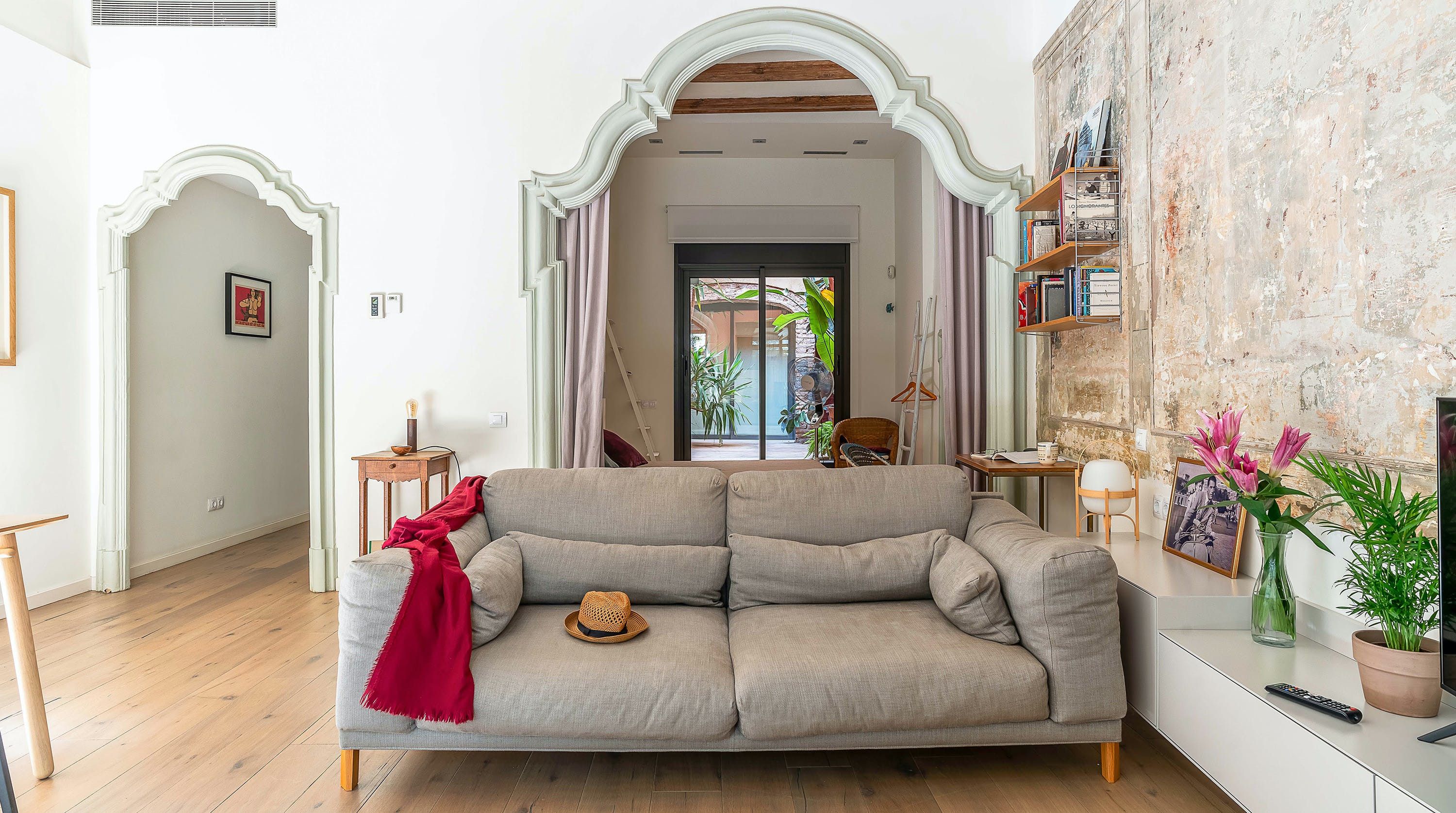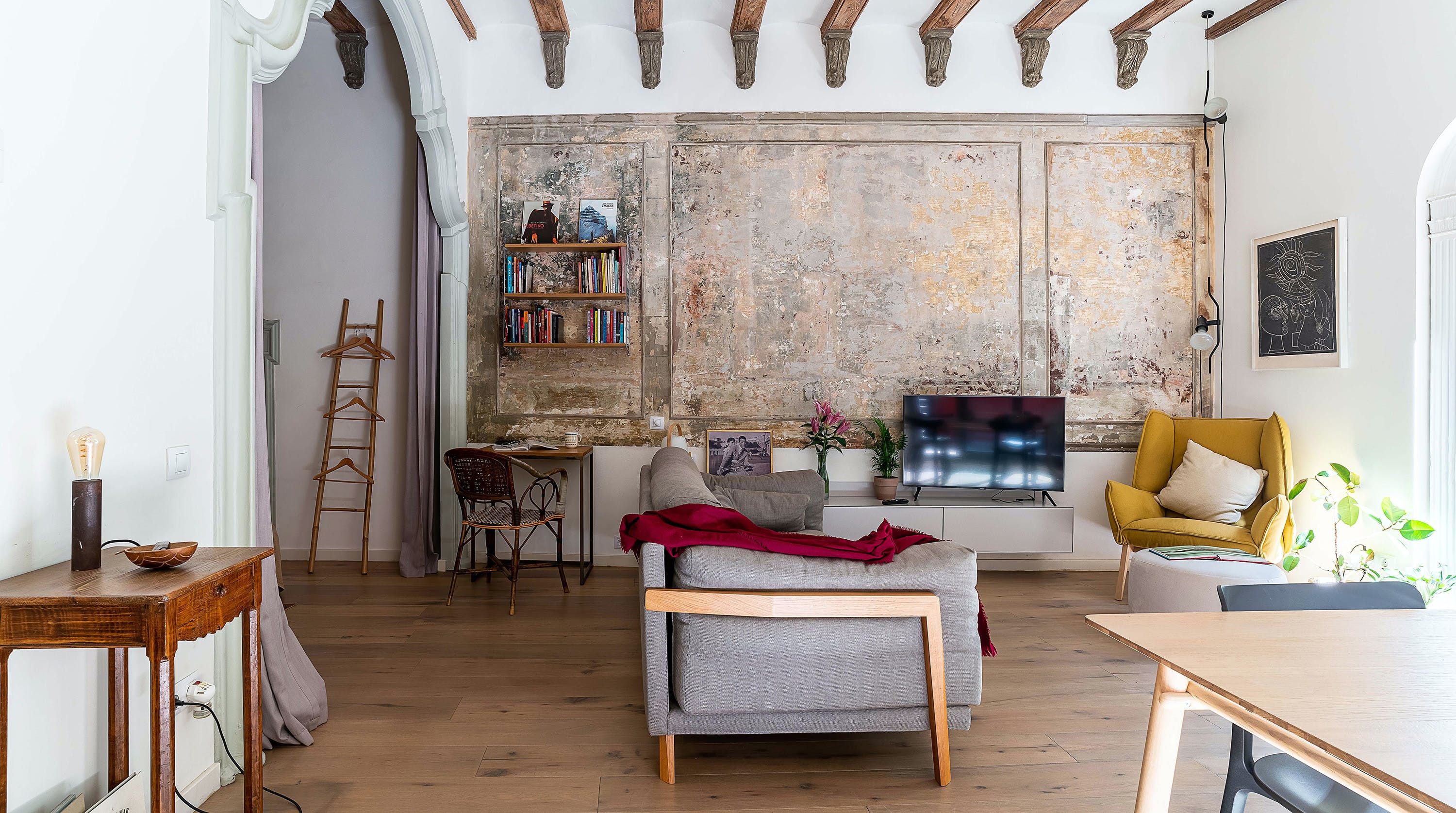 This exquisite apartment blends design-led interiors with an enviable outdoor space. The living area is a homage to past and present: keystone archways and a distressed plaster wall frame the room beneath a wooden beamed ceiling supported by corbels. This is complemented by Scandi furniture and plenty of natural light, creating a space that is at once modern and historical.