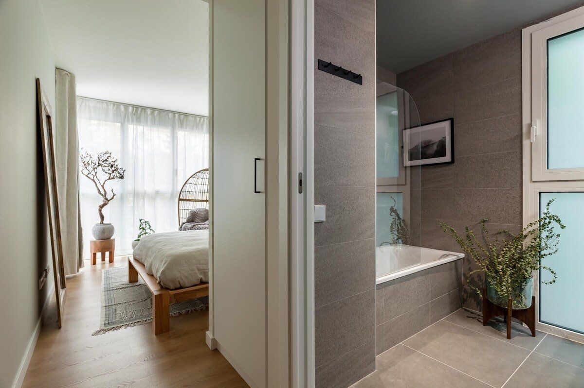 Muted pastel tones, endless cosy nooks and impressive foliage of this one-bed apartment are made curling up and letting life slow down, and how many people can say they can sit under a tree in their own home? Hide under a blanket on the hanging chair or the swing, huddle under coarse-woven linen sheets or snuggle on the sofa. A smart kitchen with a coffee maker, electric cooker, oven and dishwasher makes it easy to whip up some tapas in typical Catalonian style. In the evening, put an LP on the record player or play your tunes through the Bluetooth speaker. There’s also no need to go far to explore the city – the Sagrada Familia is right outside.