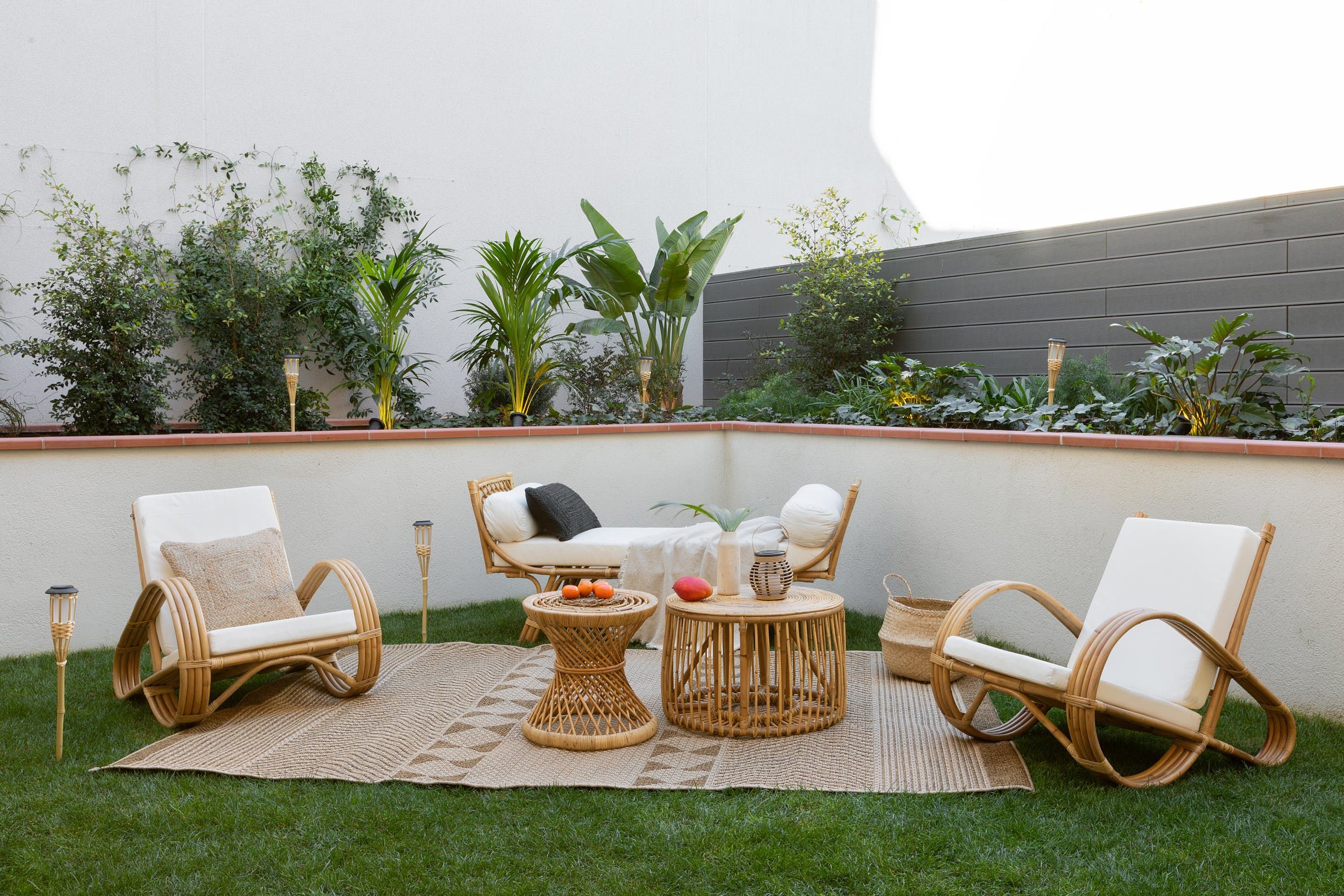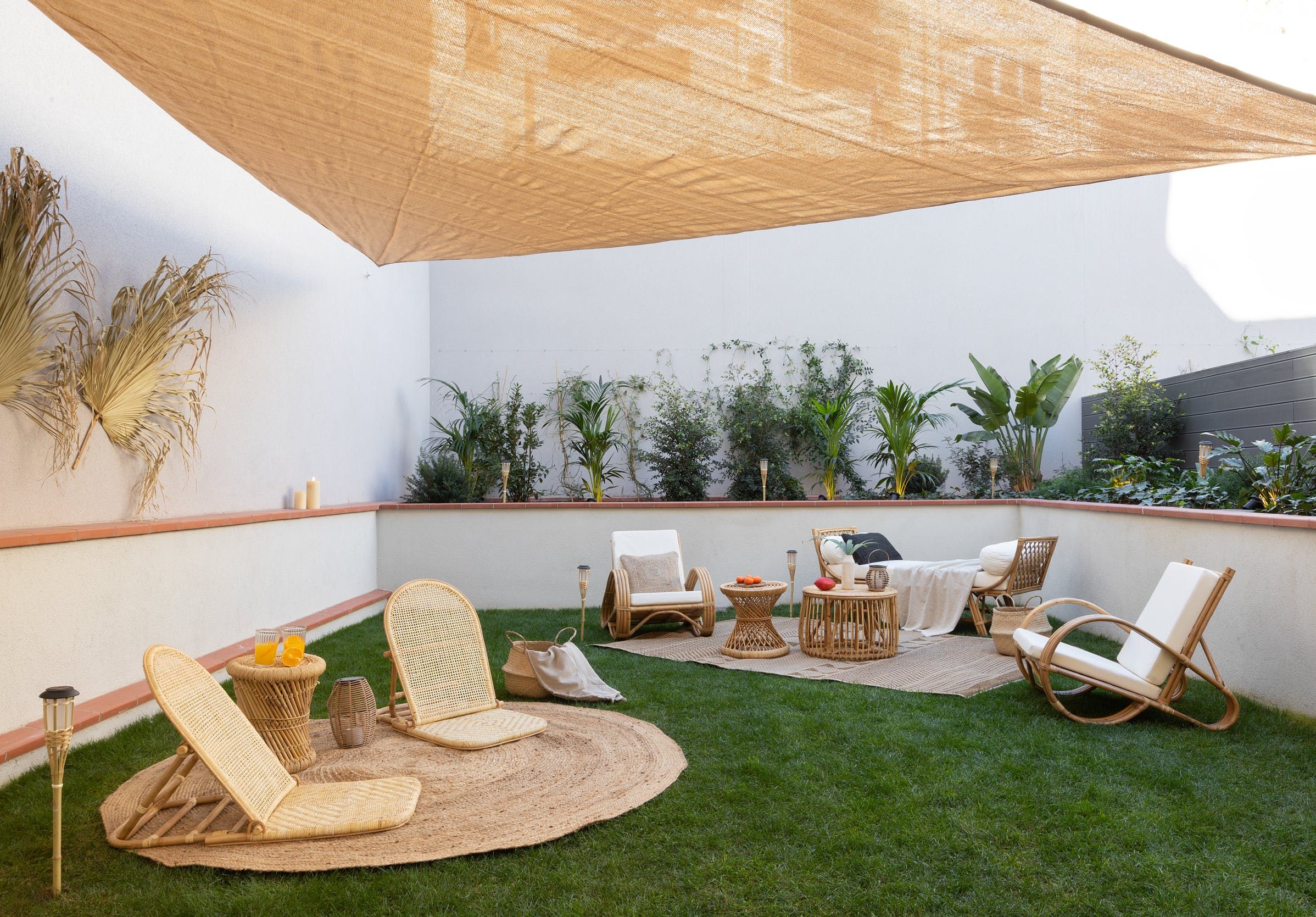 Let’s start with your elevated garden. On this private terrace, you’ve got a lush patch of grass for picnicking, and a huge shade reminiscent of a Bali beach. Wicker and bamboo furniture dresses the lawn, while leafy shrubs sit around the perimeter. It might feel distinctly more tropical island than city centre, but you can leave your piña colada out here while you check out the interiors.