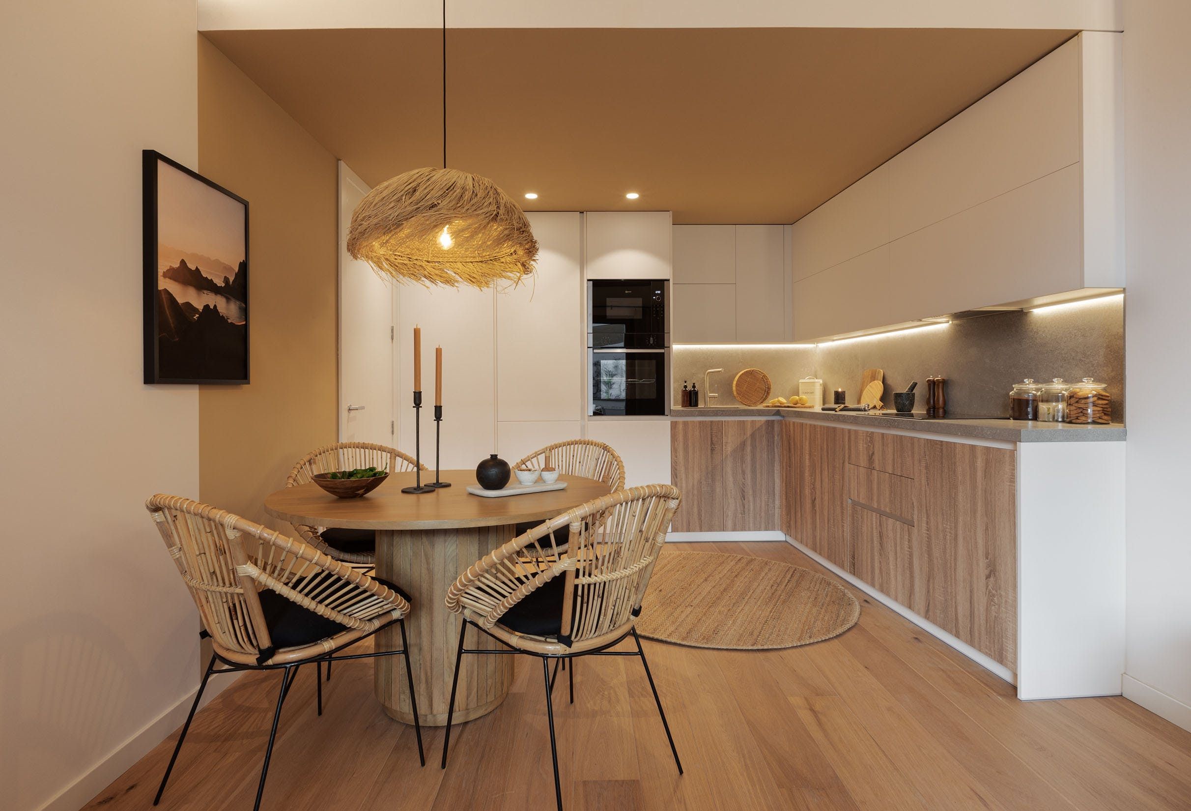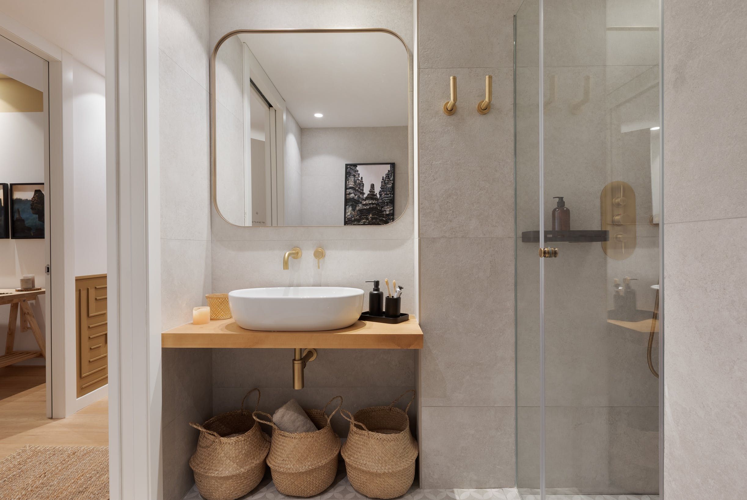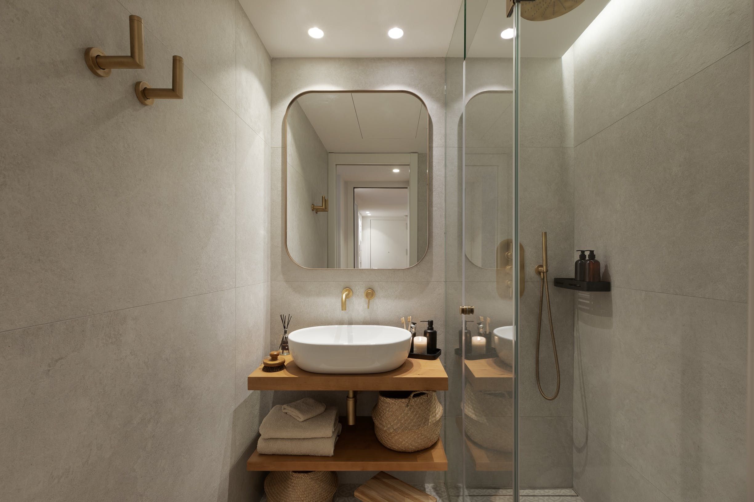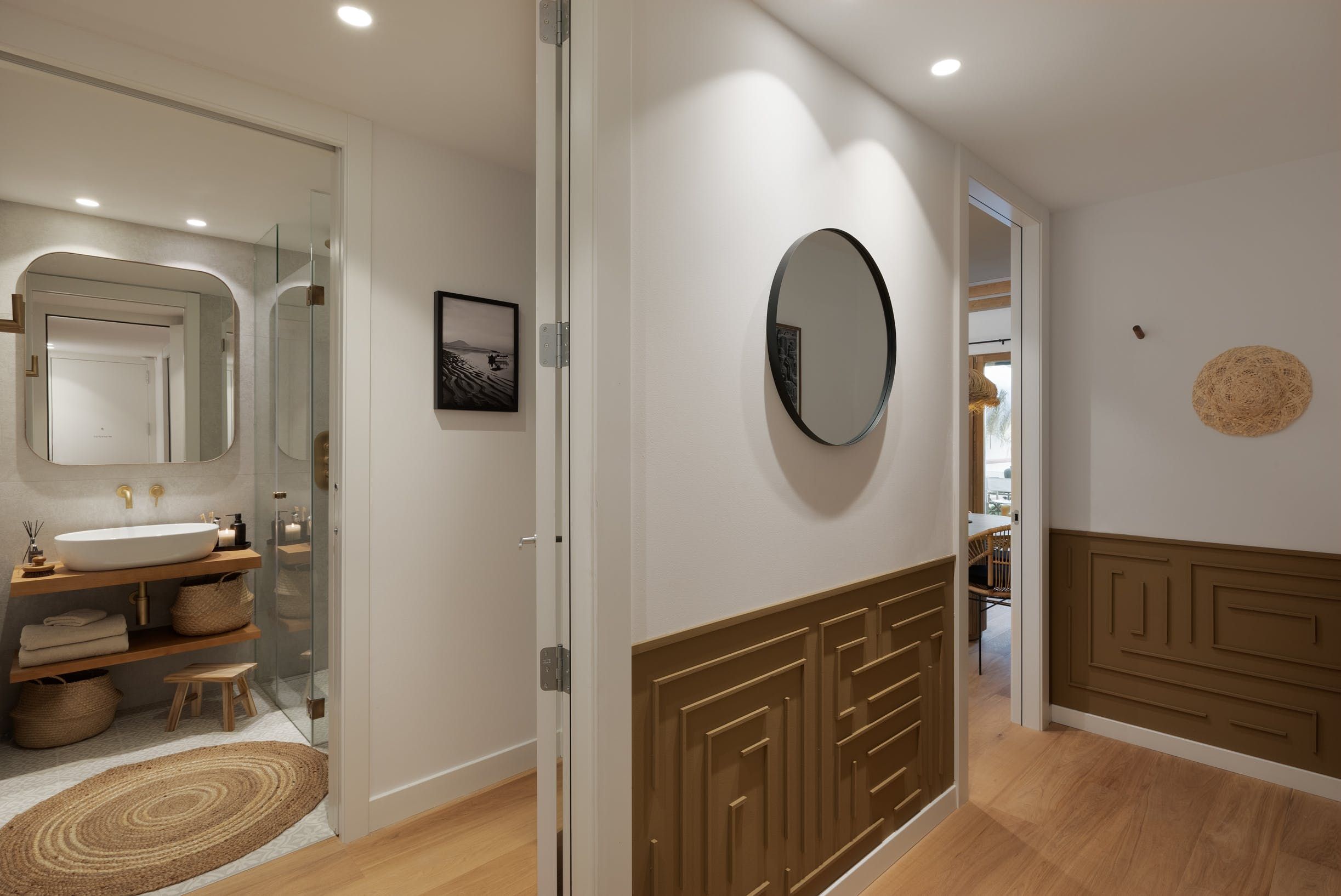Continuing on the theme of natural sophistication, the glass doors flow through into your bright lounge. Waves of wooden panels make up a feature wall behind the sofa, creating an image of mountainous landscapes. Earthy tones, wooden floors, and soft woven fabrics complete the look, with the final flourish adding water to this portrait of island life – an in-building, residents’ pool.