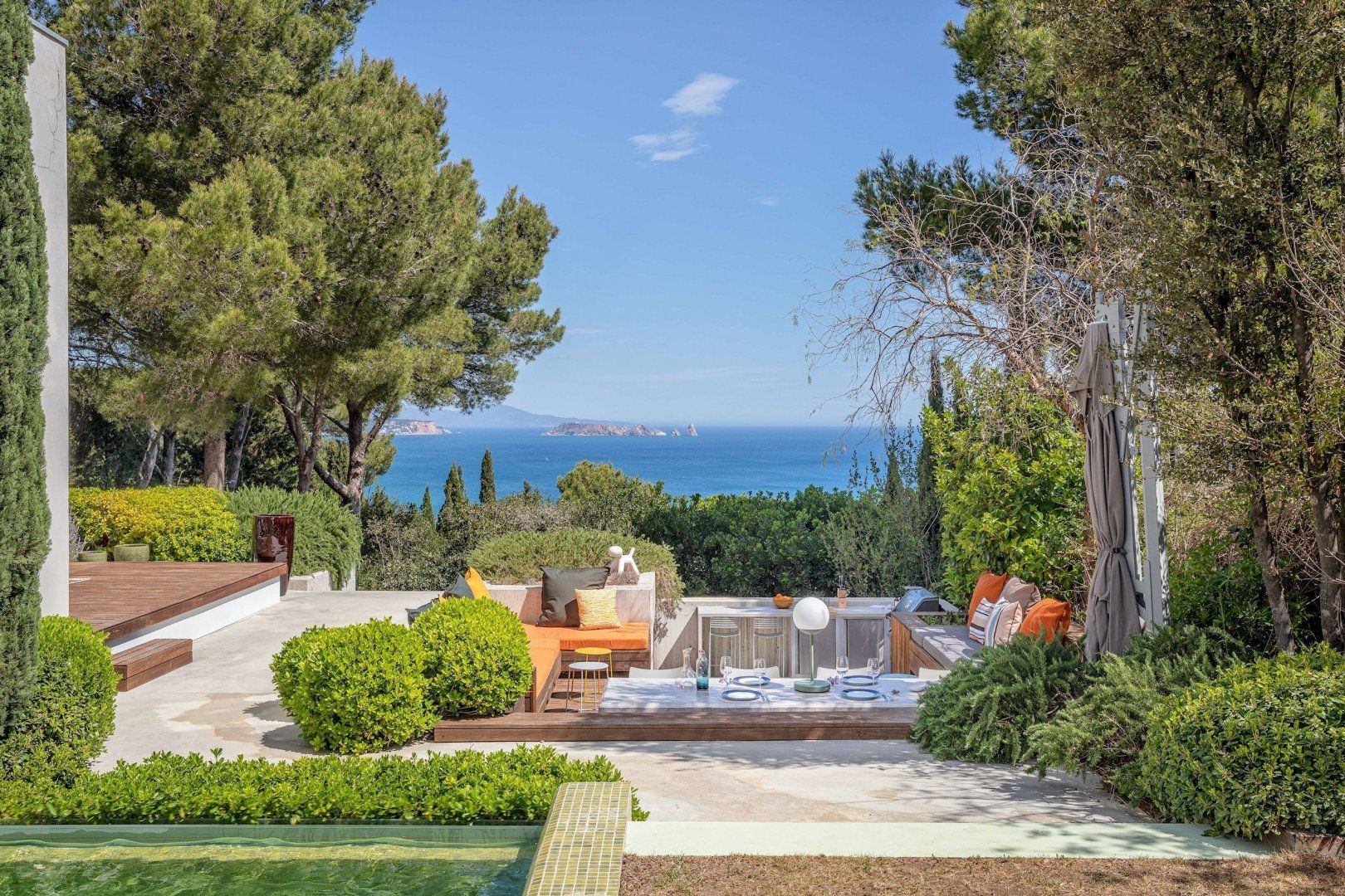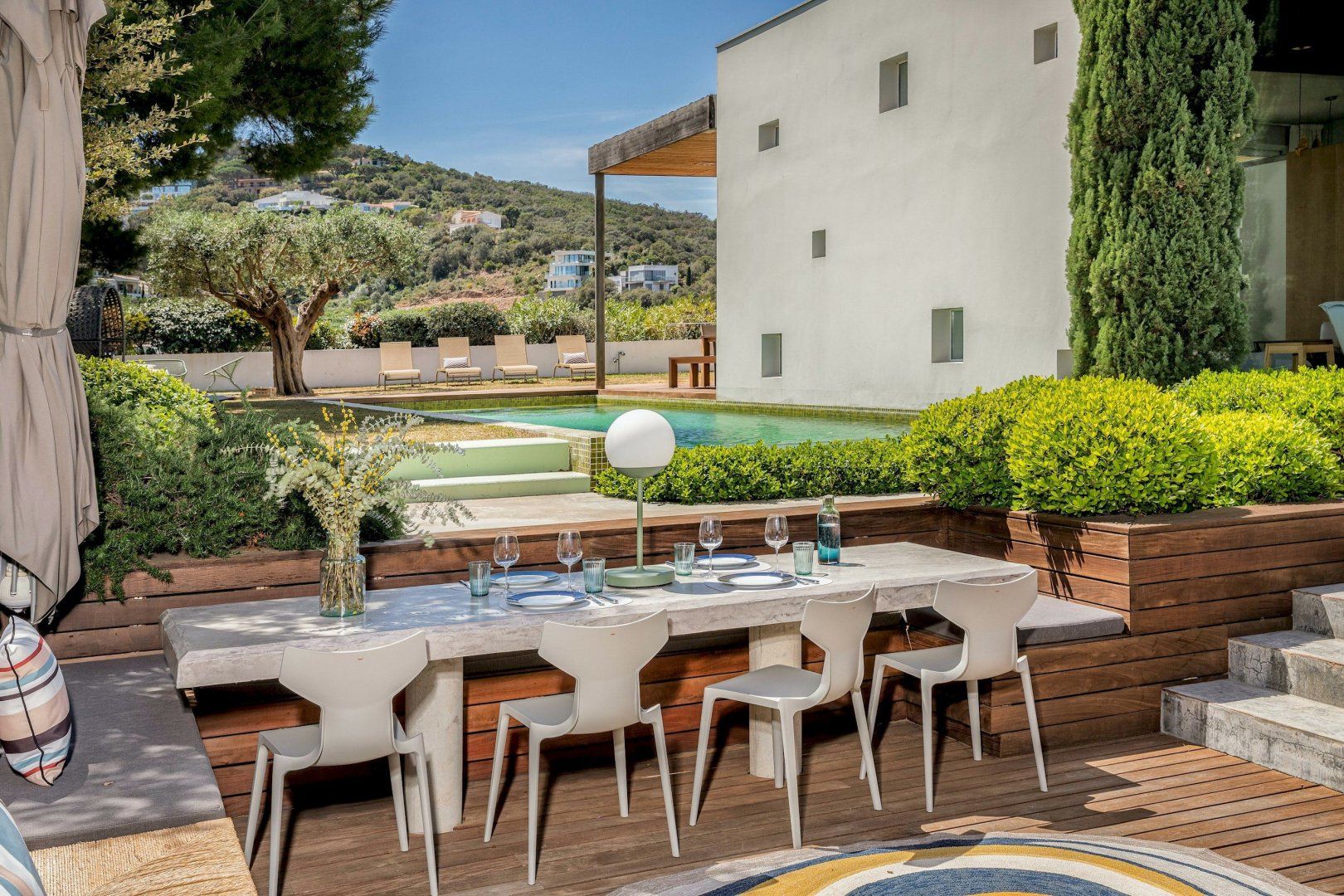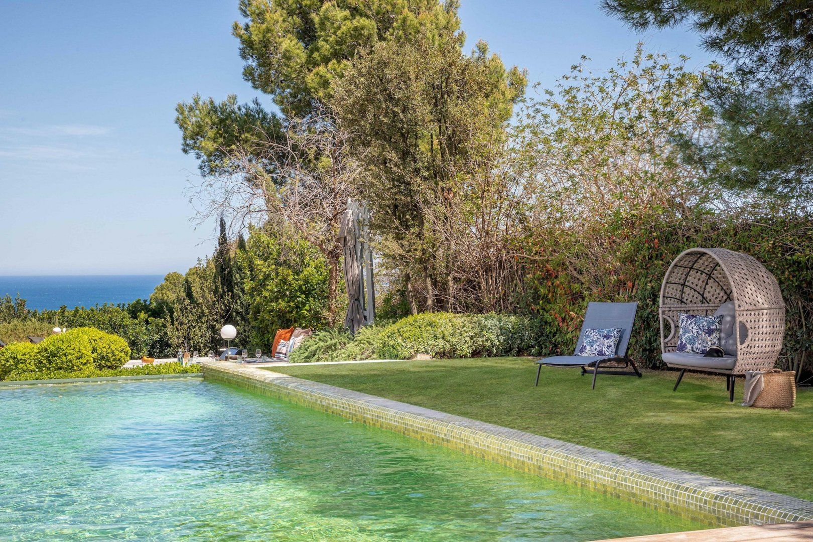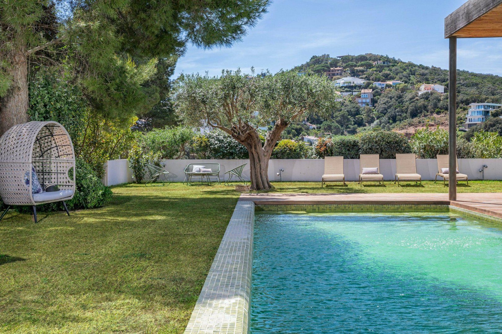 Stepping outside, a sparkling pool awaits you in the outdoor area. Surrounded by a beautifully landscaped garden, the pool offers a refreshing oasis for you and your guests to cool off on warm summer days. Additionally, you'll discover an amazing plancha grill, with its own lounge and dining area, perfect for savoring delicious meals while enjoying the breathtaking views of the Mediterranean Sea.
