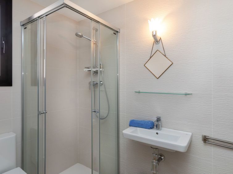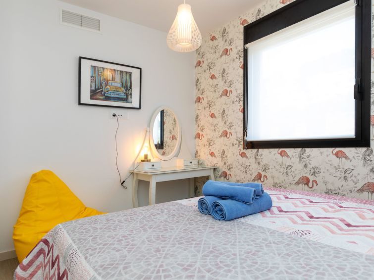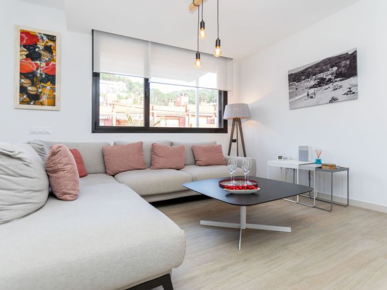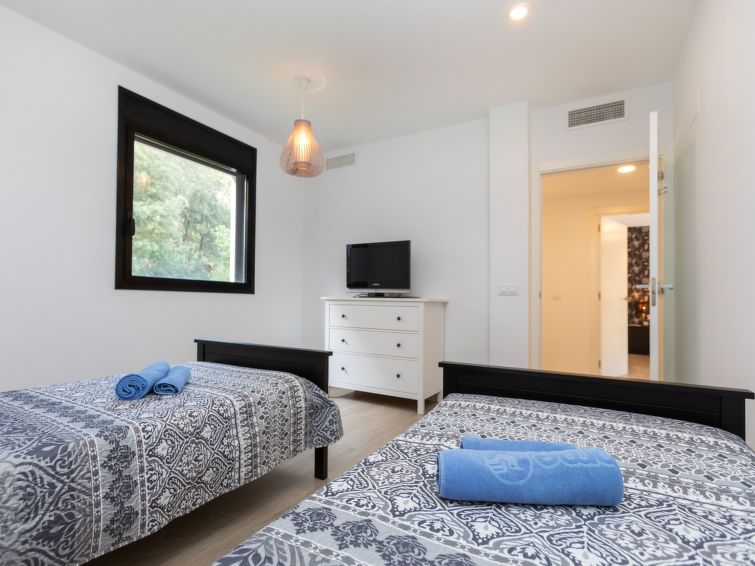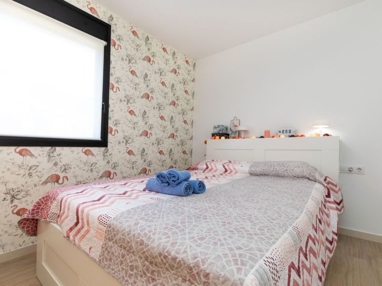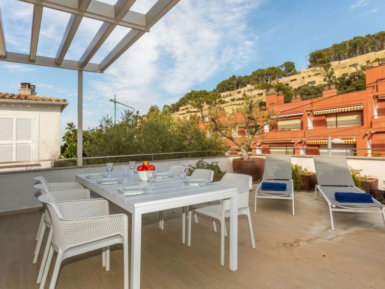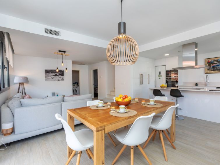 "Sa Riera White on the Beach", 5-room terraced house 150 m2 on 2 levels. Object suitable for 8 adults. Spacious and bright, comfortable and modern furnishings: open large living/dining room with shower/WC, TV, air conditioning and electric shutters. Exit to the terrace. 1 room with 1 french bed (160 cm, length 200 cm), air conditioning.