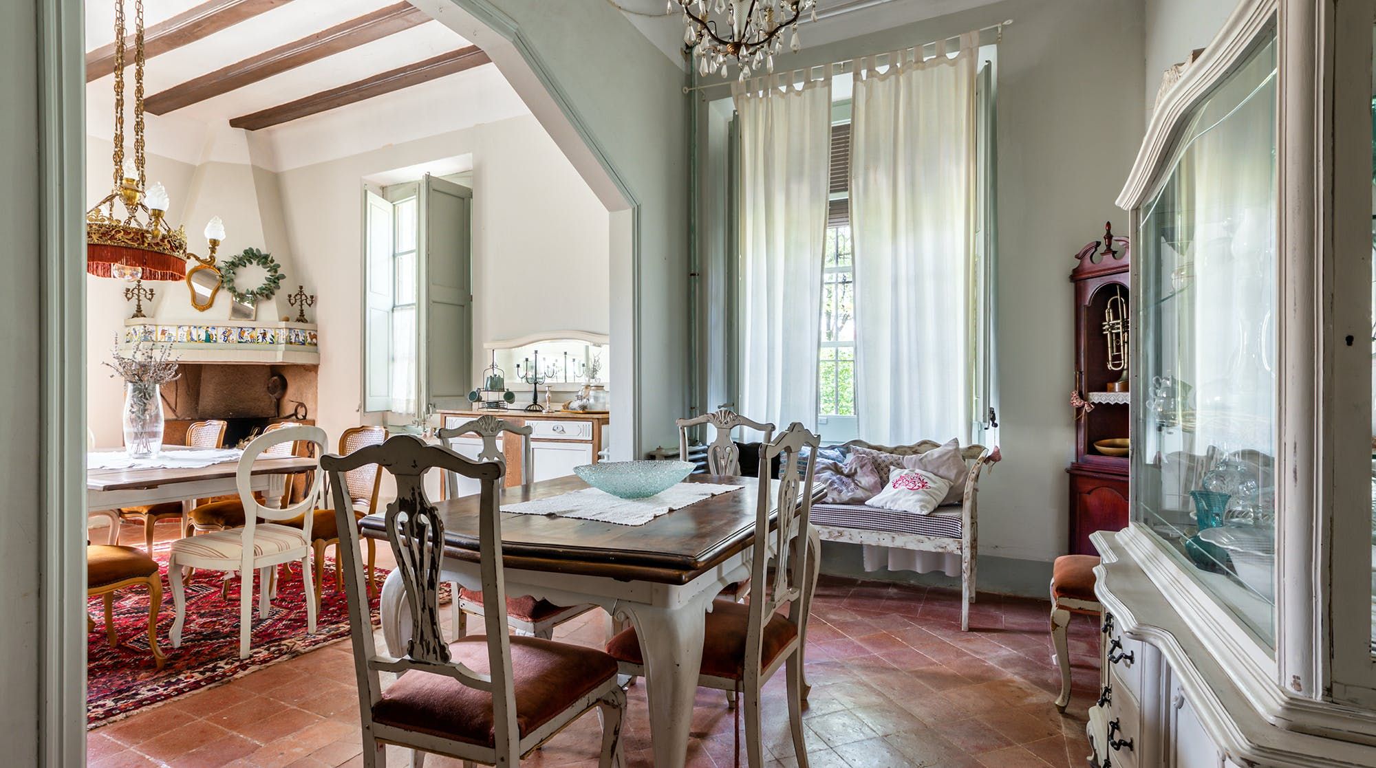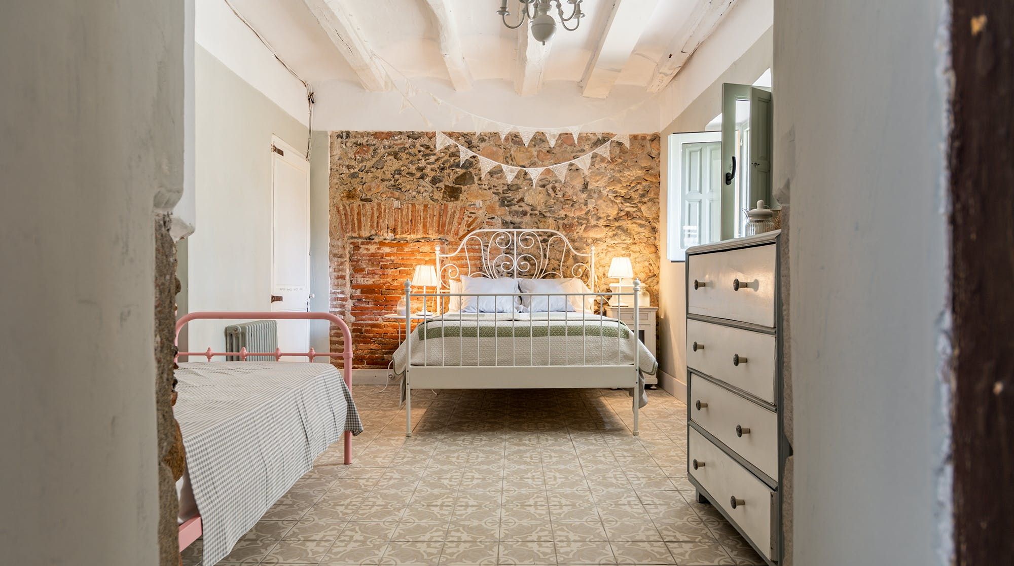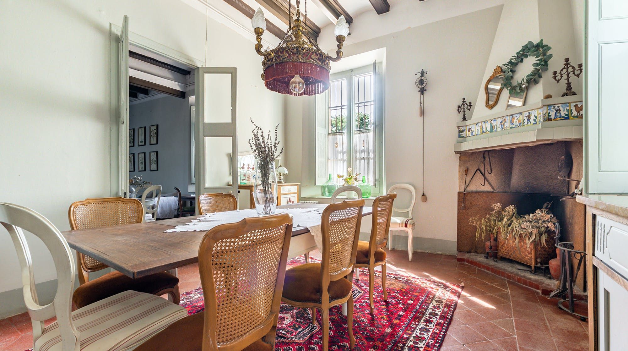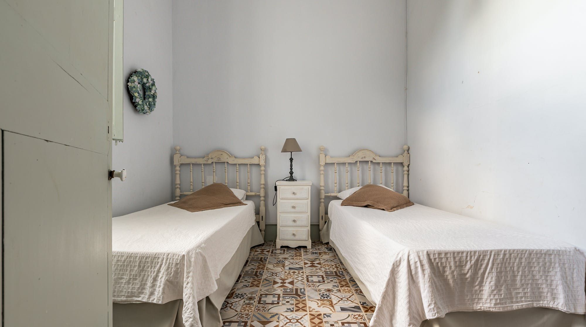 Inside, it’s everything you expect from a Spanish manor – terracotta tiled floors, wood-beamed ceilings and exposed brick walls. Several different sitting rooms packed with bookshelves and artworks provide the space to unwind and there are some laptop-friendly desks should you need to work remotely. We loved the tiled staircase at the centre of the home, a nod to yesteryear.