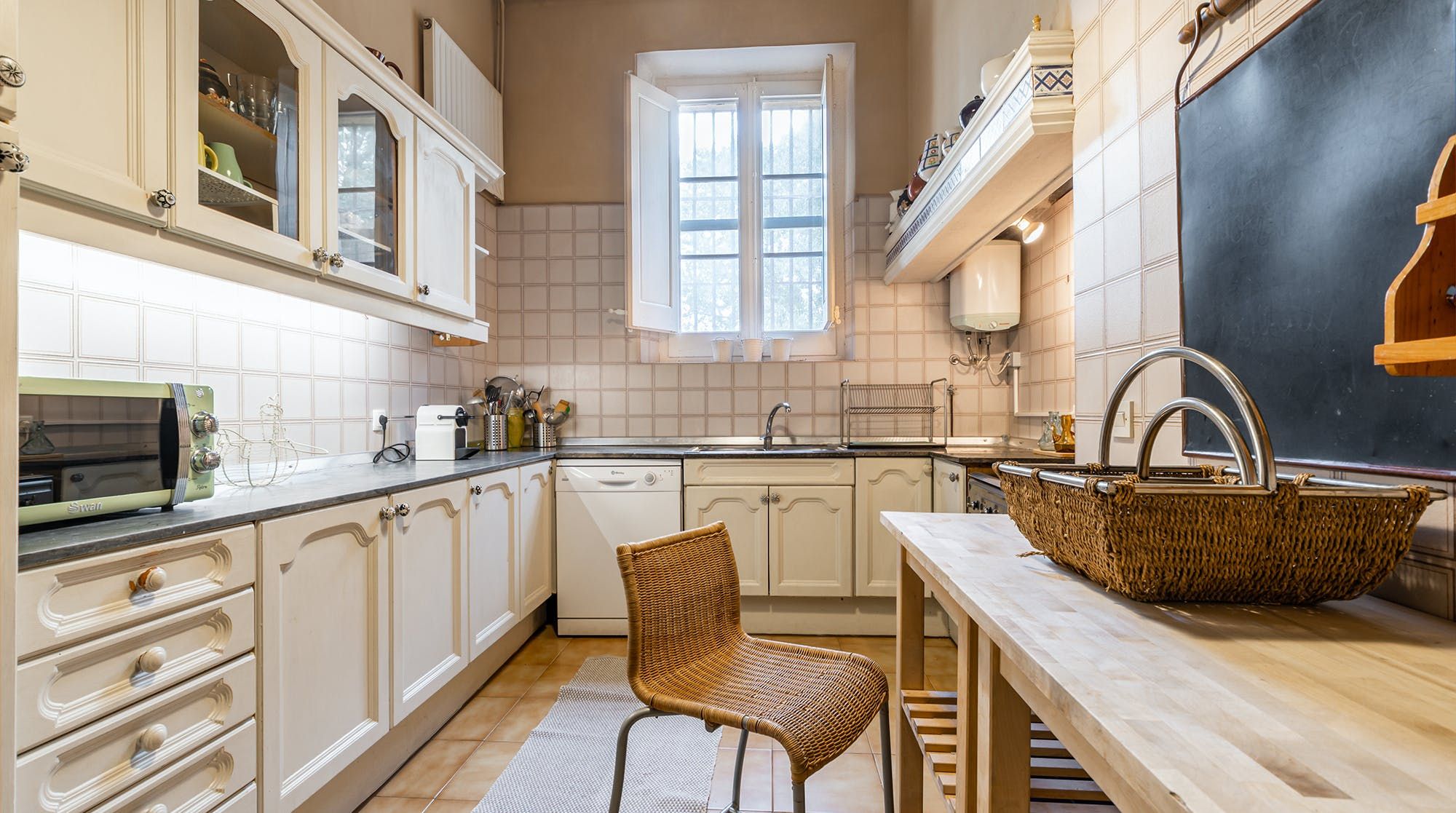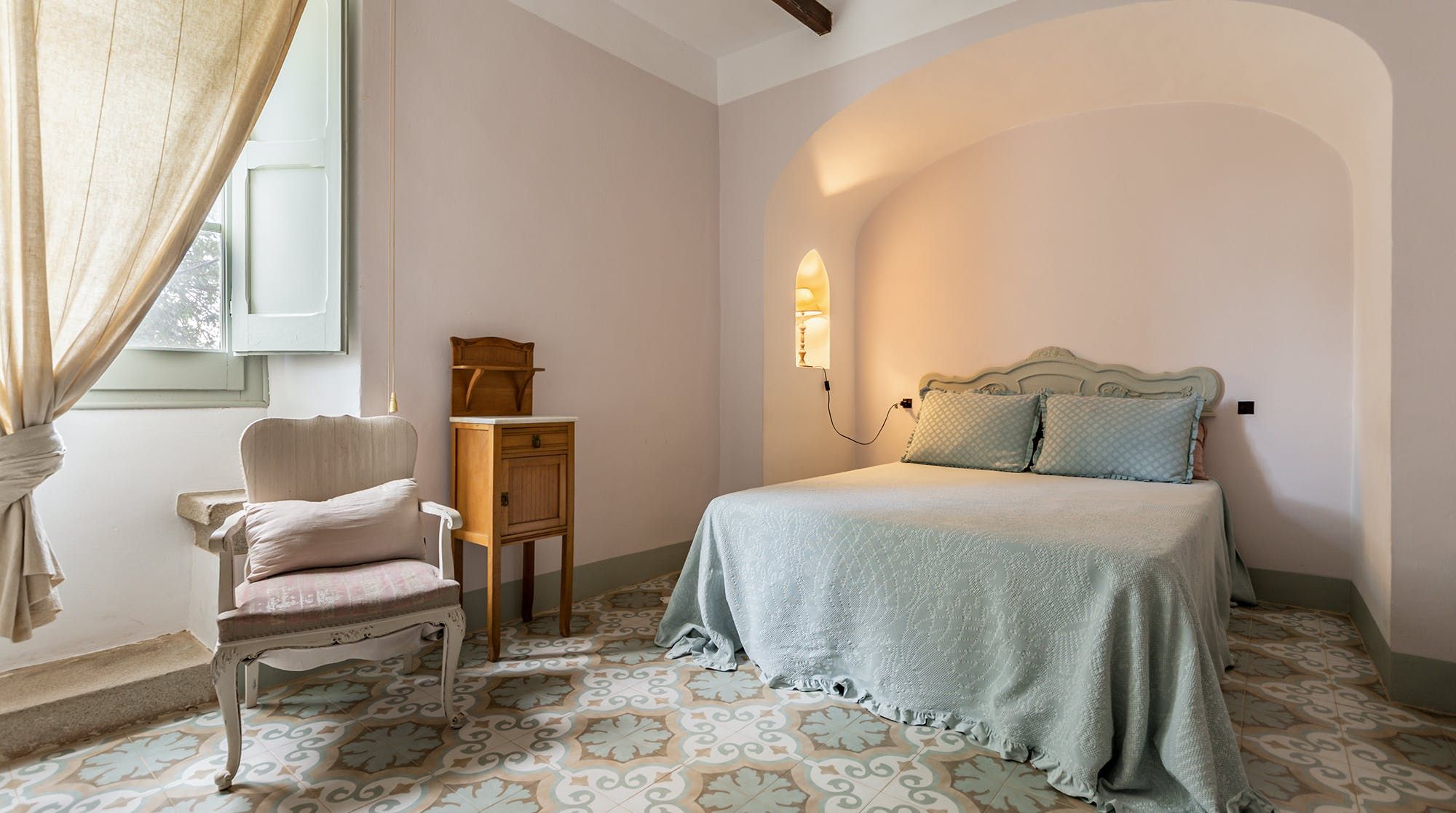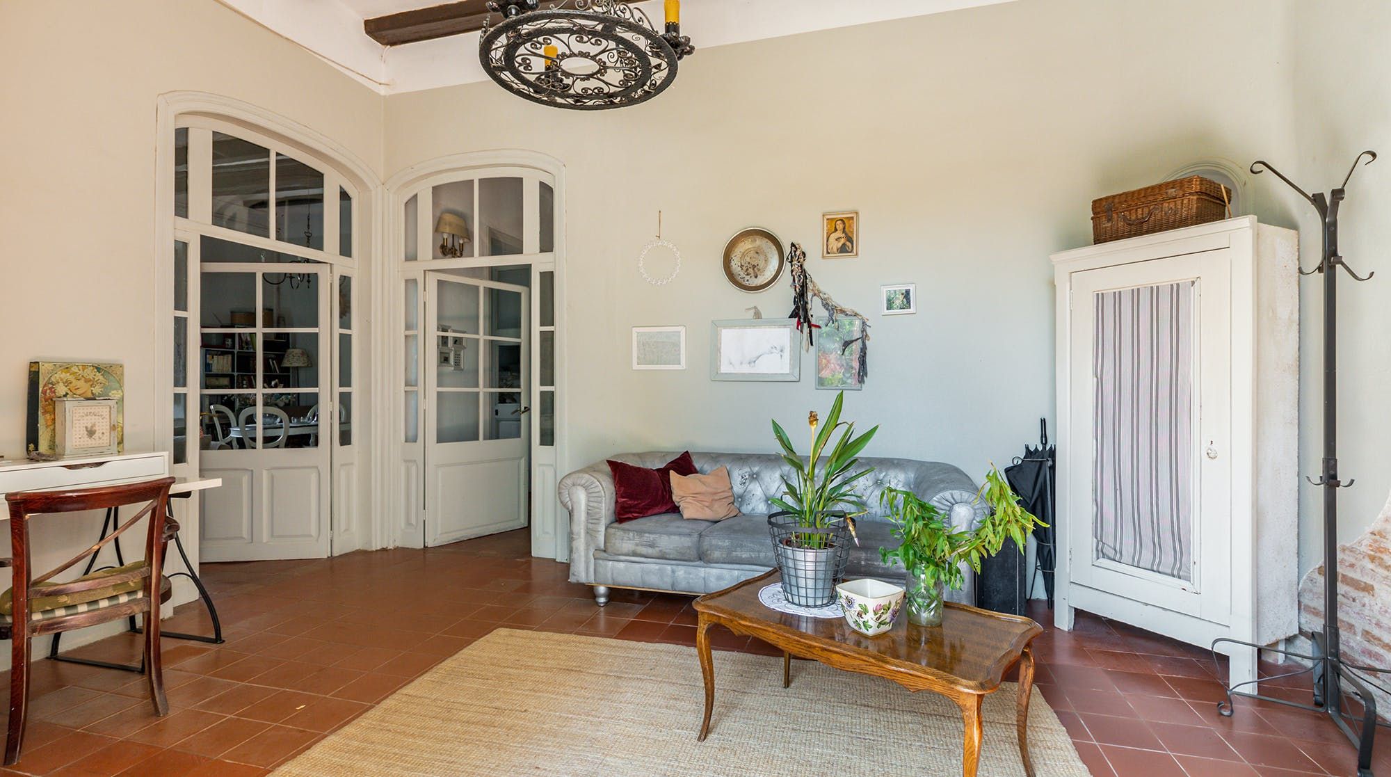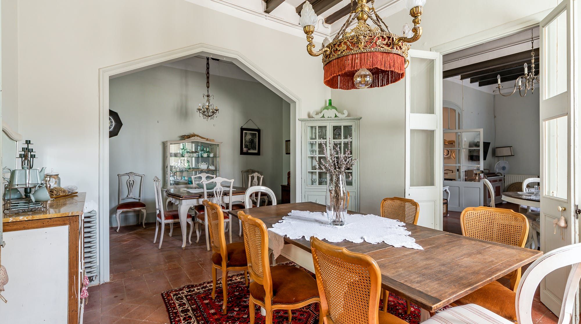Inside, it’s everything you expect from a Spanish manor – terracotta tiled floors, wood-beamed ceilings and exposed brick walls. Several different sitting rooms packed with bookshelves and artworks provide the space to unwind and there are some laptop-friendly desks should you need to work remotely. We loved the tiled staircase at the centre of the home, a nod to yesteryear.