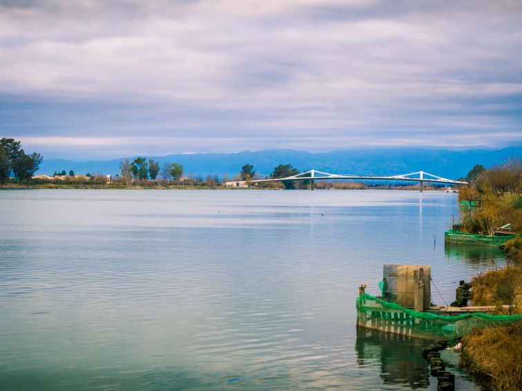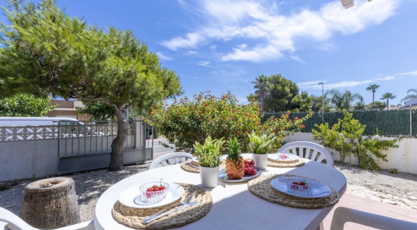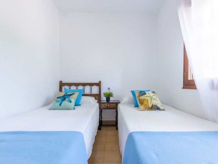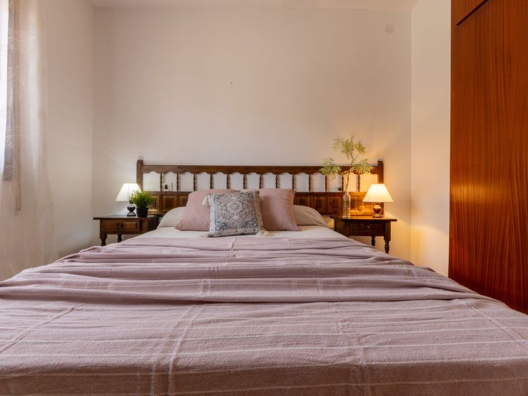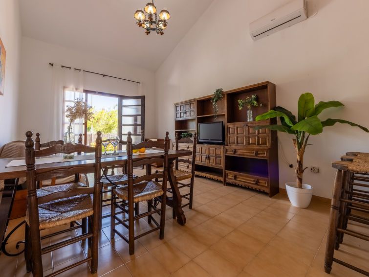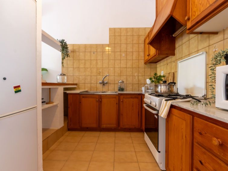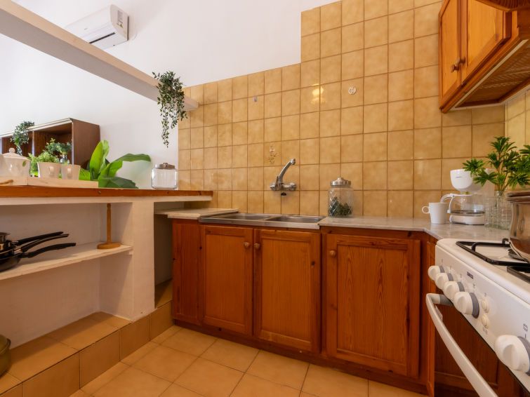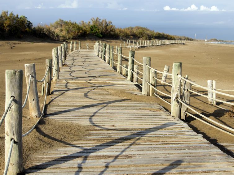 "D1", 3-room house 59 m2, on the ground floor. Practical and antique furnishings: living/dining room with dining table and digital TV. Exit to the terrace. 1 double bedroom with 2 beds (90 cm, length 190 cm). 1 double bedroom with 1 french bed (135 cm, length 190 cm). Open kitchen (4 hot plates, oven, toaster, kettle, microwave, electric coffee machine) with bar.