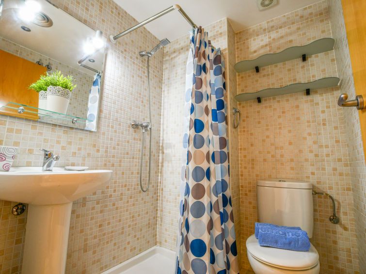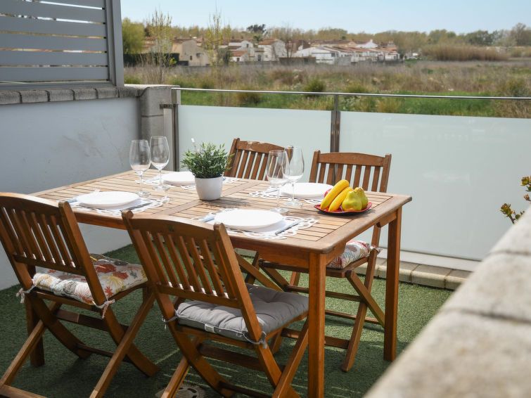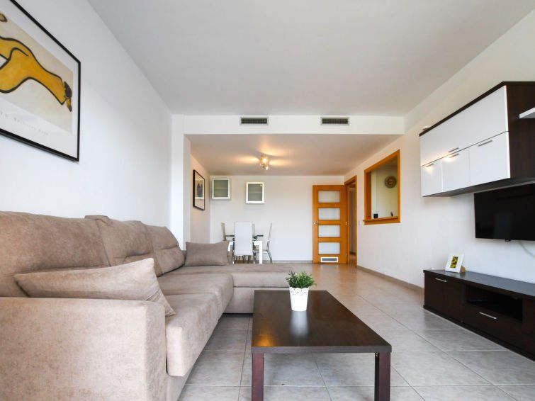 3-room apartment 80 m2, on the ground floor. Spacious and bright, comfortable and modern furnishings: living/dining room with dining table and digital TV. Exit to the terrace, west facing position. 1 room with 1 french bed (150 cm, length 190 cm), shower/WC. 1 room with 1 x 2 bunk beds (90 cm, length 190 cm).