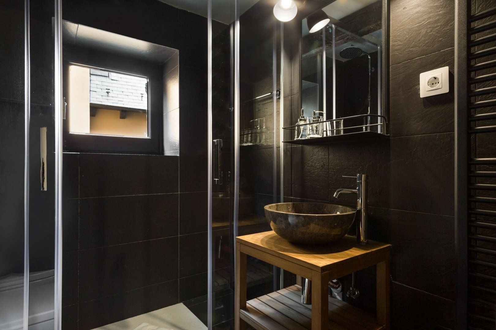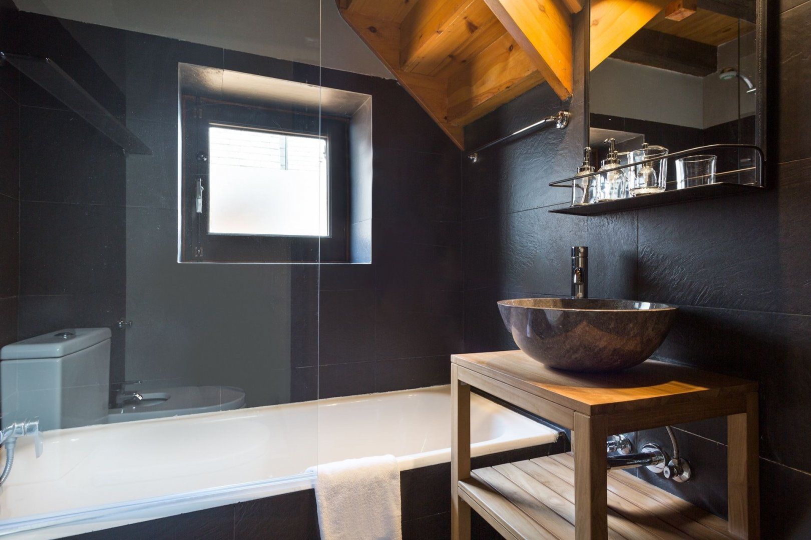 From the outside, this home in the town of Garòs overlooked by verdant mountains looks rather rustic, but that's only partially true of the interior. Granted, the exposed stonework and wooden ceiling beams add a quaint air, but much of the design is thrillingly contemporary. You only need to look at the sleek grey kitchen, minimalist bedrooms and black bathrooms to see what we mean.