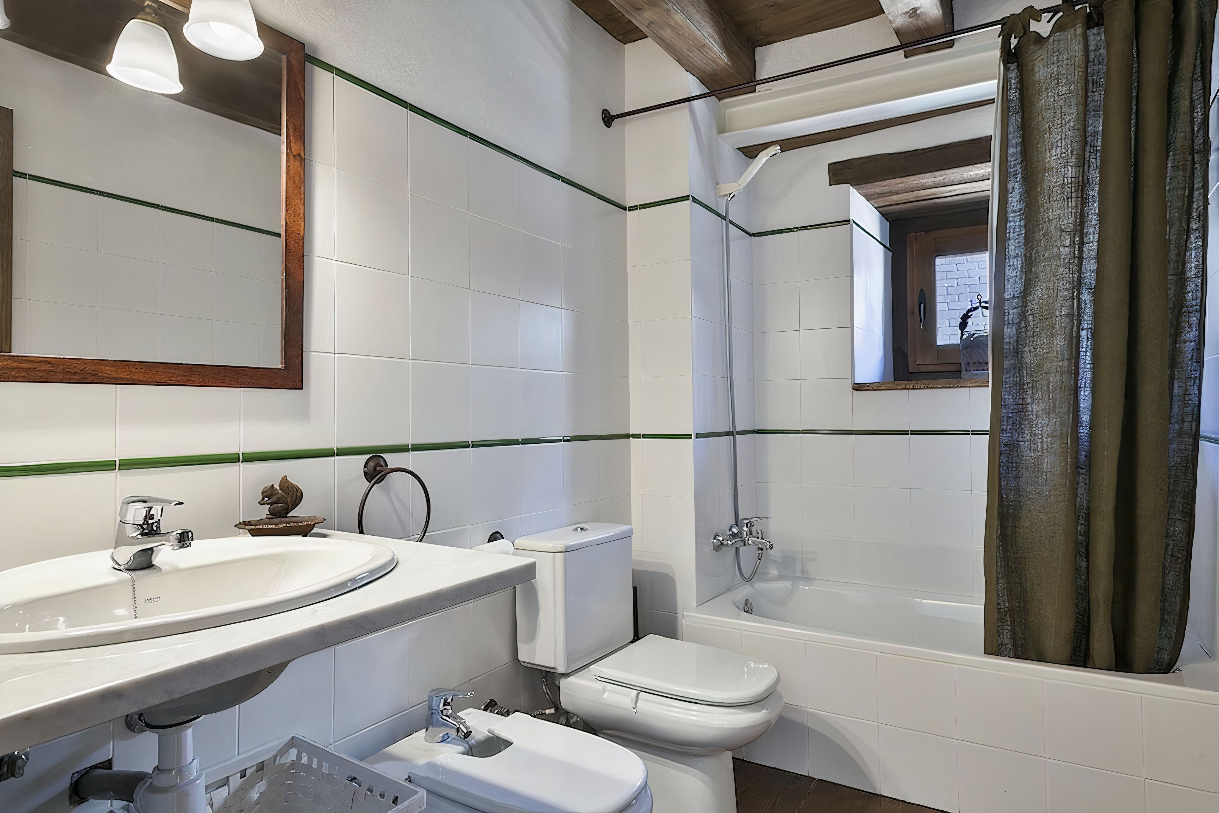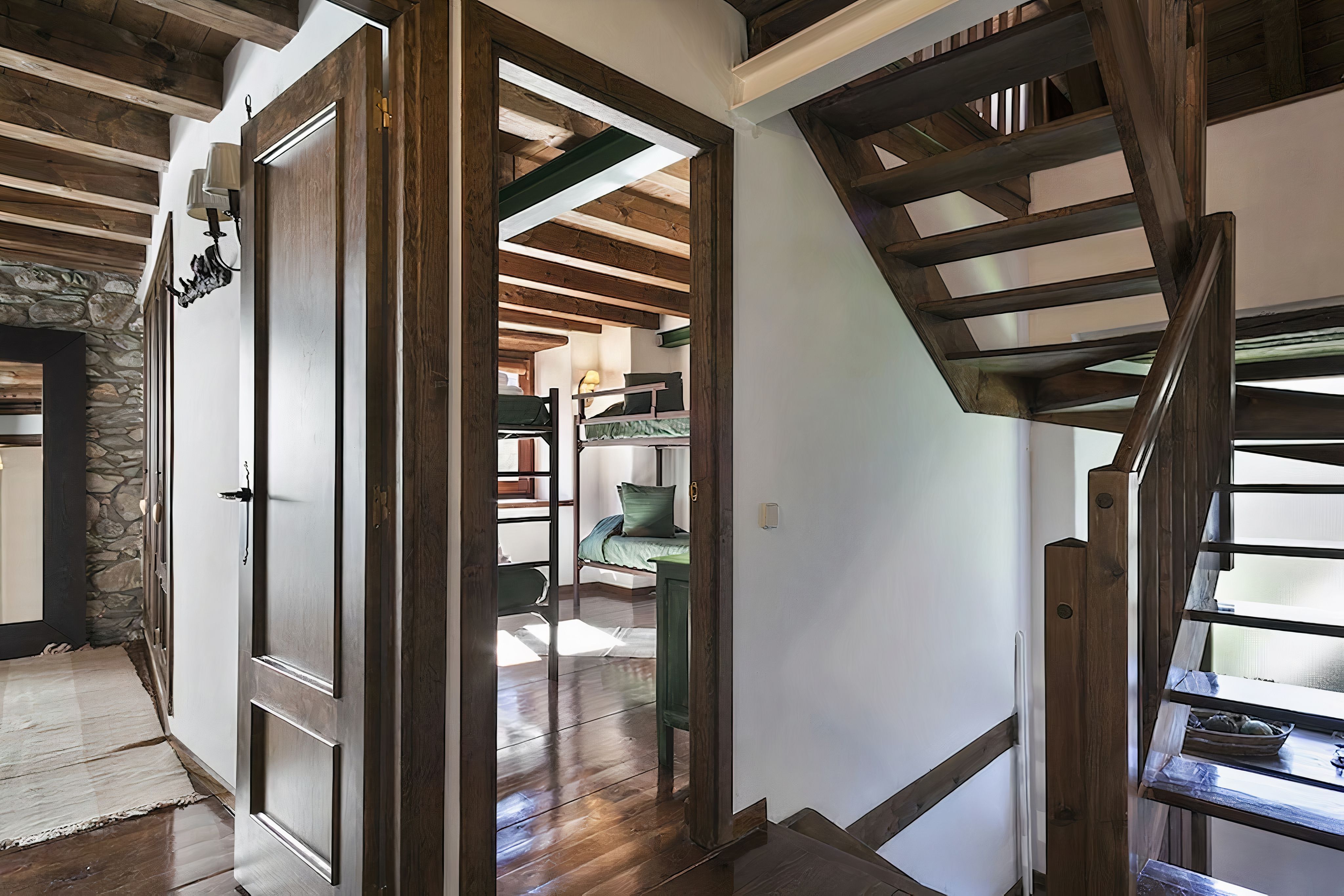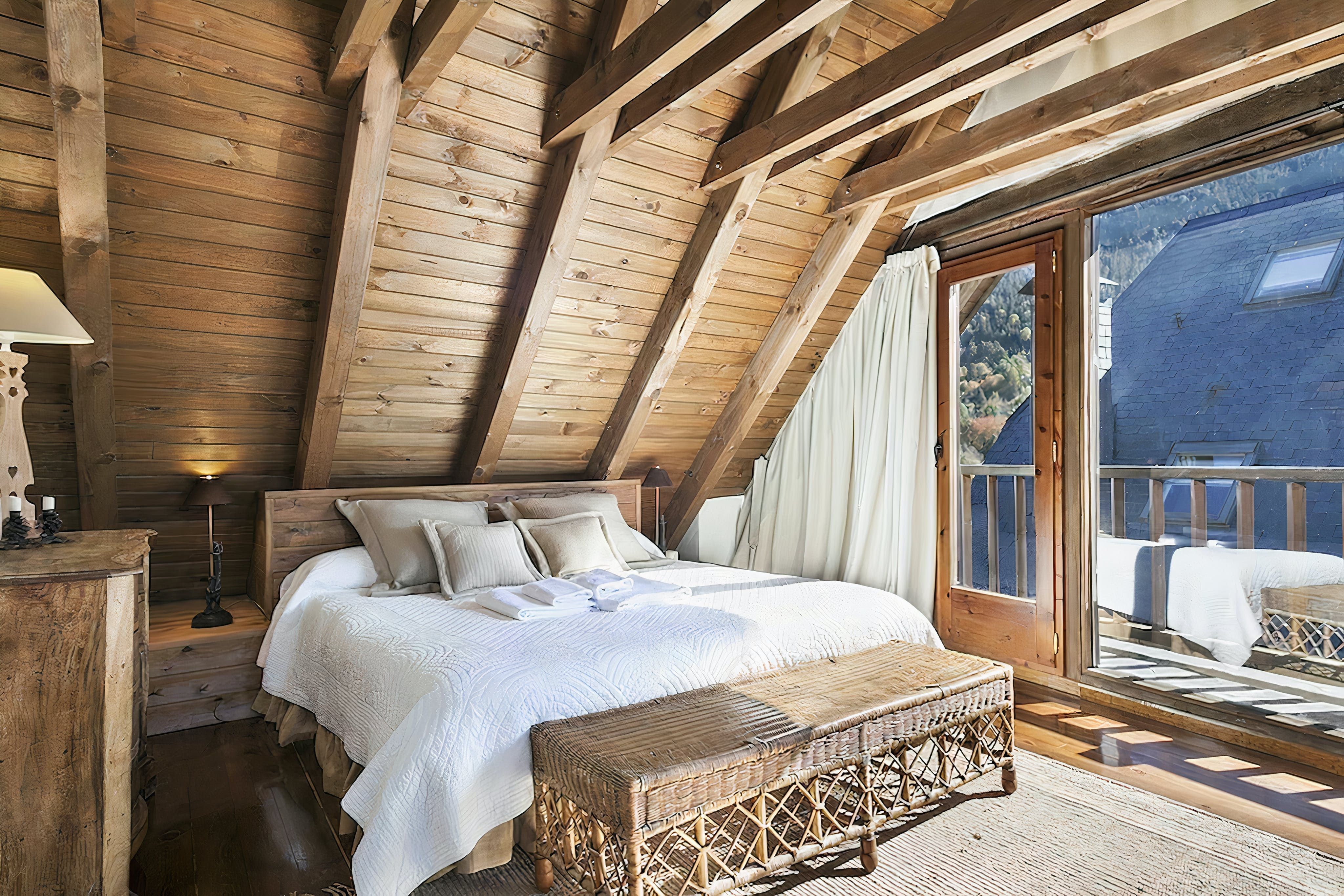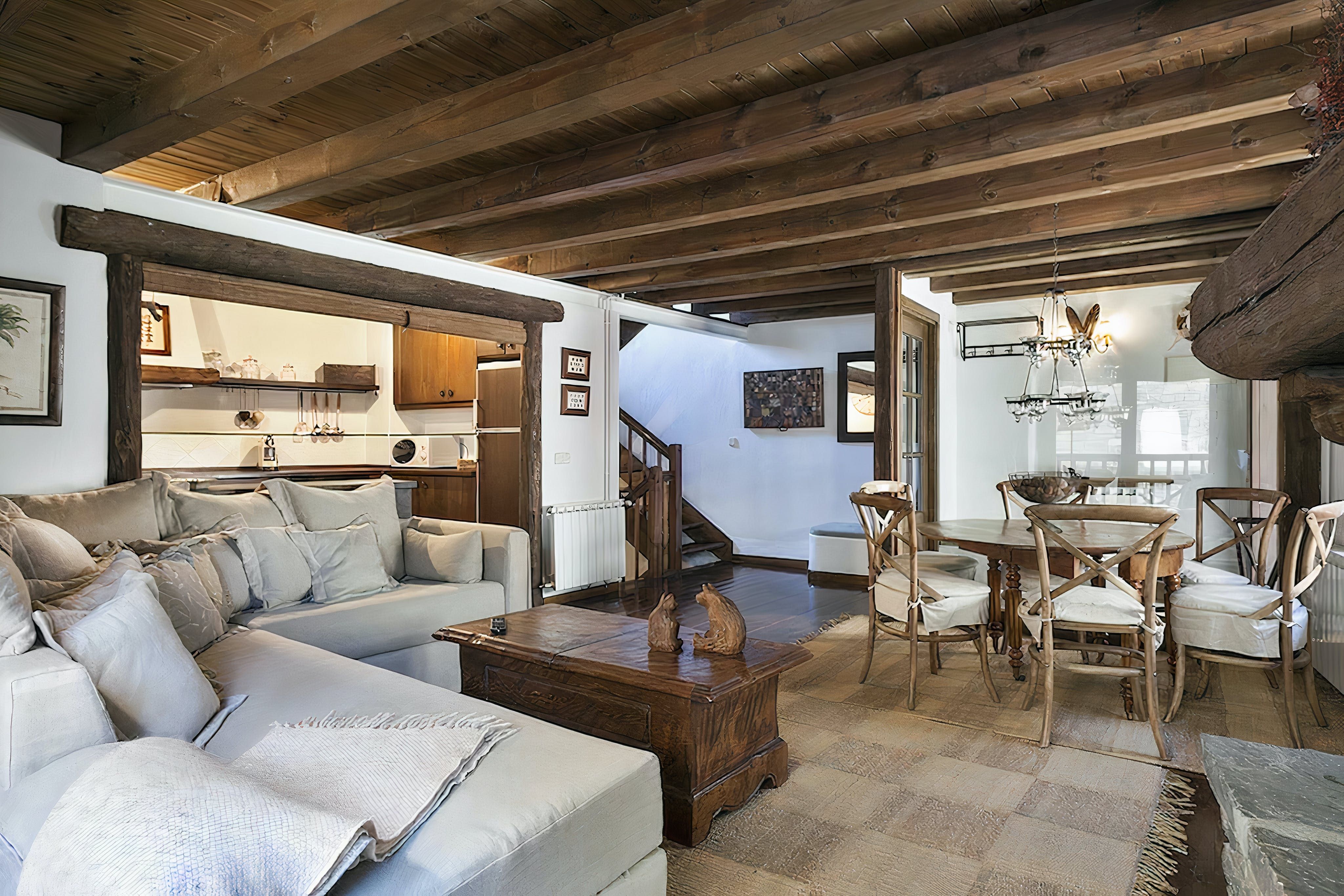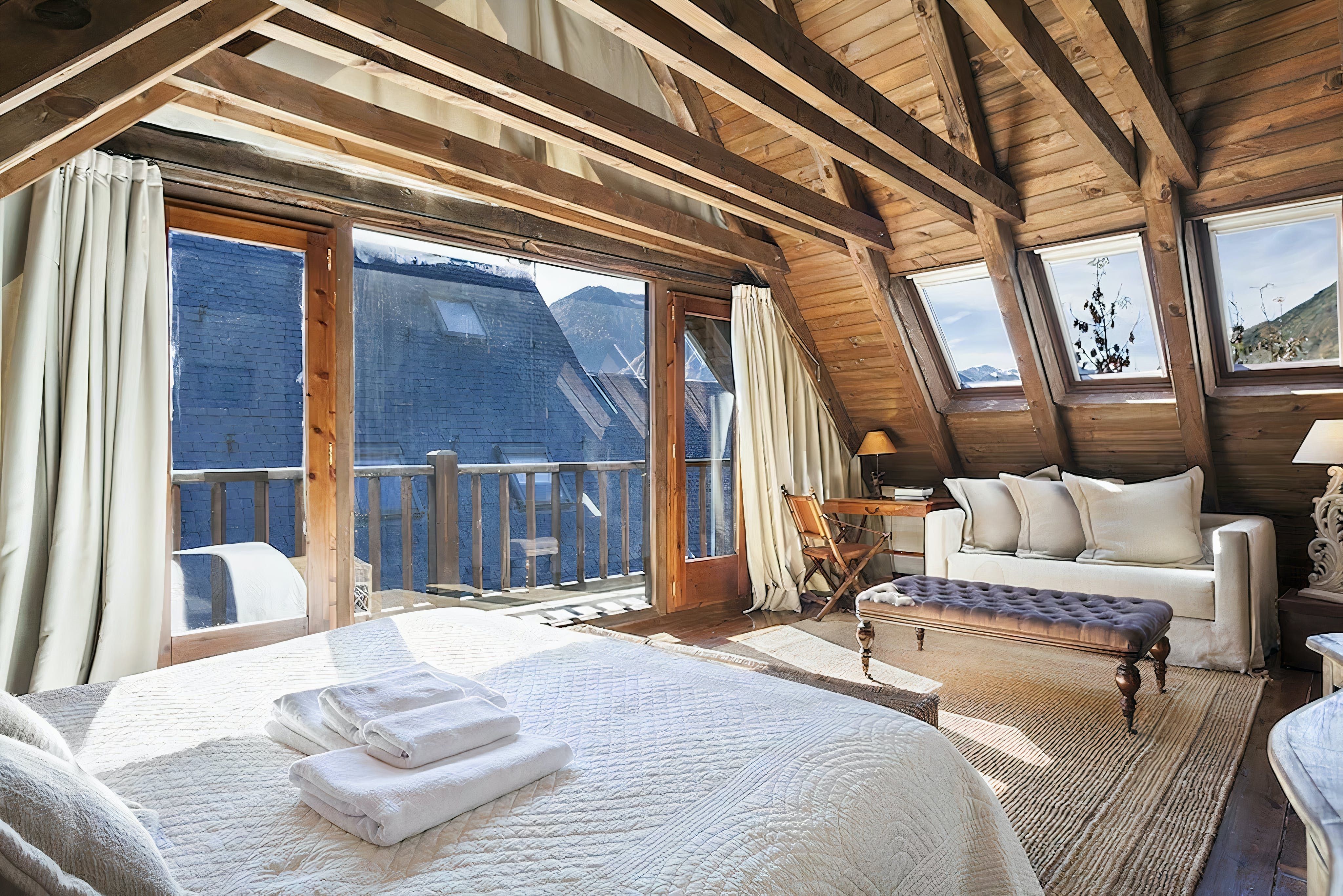 This authentic Aranese-style home is dripping with character at every turn. It’s a picture of a mountain village idyll, from the moment you step from the quiet cobbled street into the welcoming living room. Inside, it’s like a forest cabin with sloped wooden ceilings and thick timber beams on display. The brick fireplace in the living room completes the cosy scene. Darkwood cabinets in the kitchen hark back to simpler times, and they hide all the mod cons you need for 21st-century self-catering. Wending your way up the wooden staircase, you’ll find all the bedrooms upstairs with the main bedroom taking up the entire loft space, natural light spilling across the hardwood floor from the wall of glass. From here, you can step out onto the top-floor balcony and spot the mountains that surround the town.