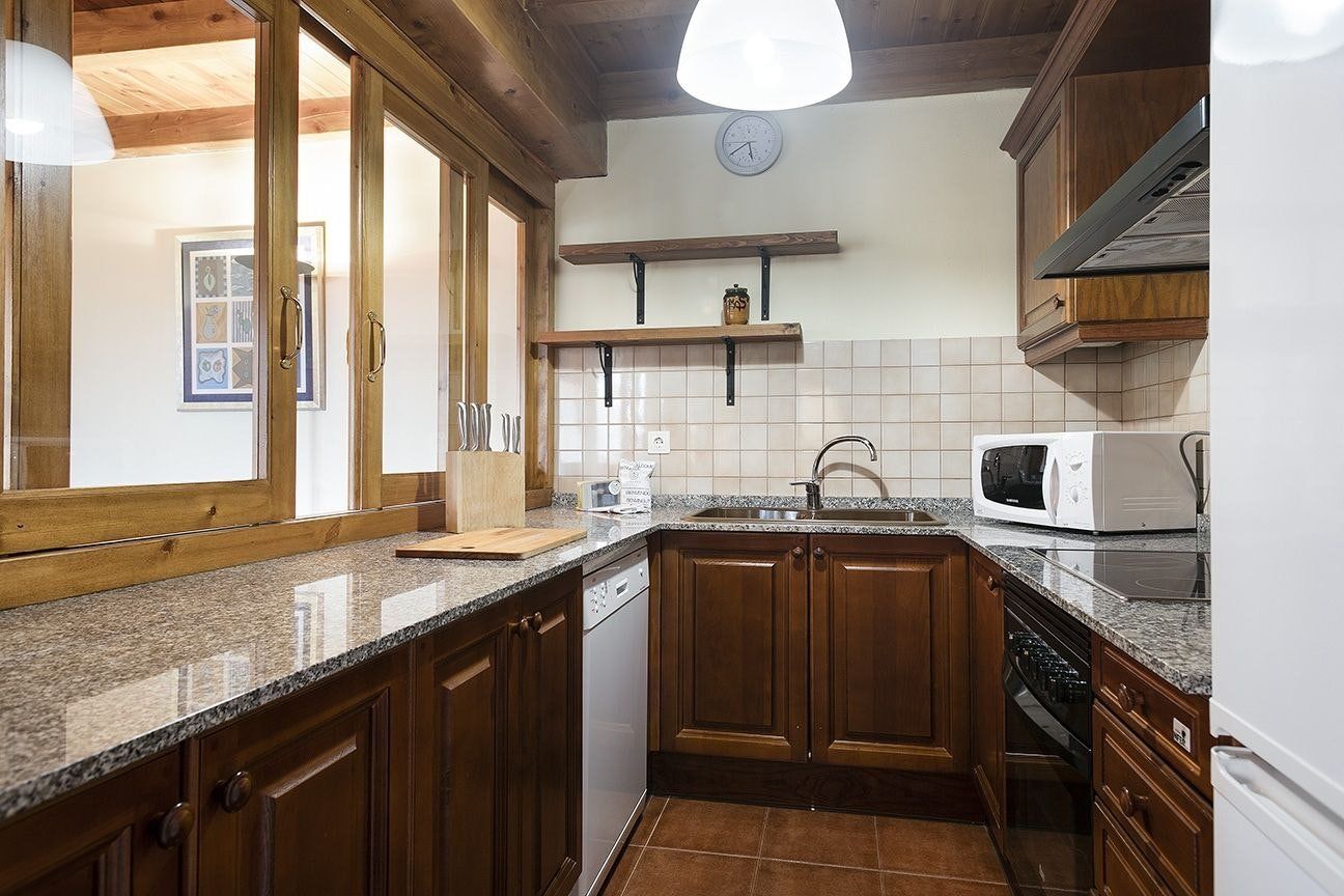 Inside, it's a modern take on the traditional buildings of the area, with plenty of natural wood, stone and slate. A fireplace forms the focal point in the open-plan living space, with comfy sofas and patio doors opening out to a small private terrace. And a perfectly practical kitchen makes cooking at home a cinch.