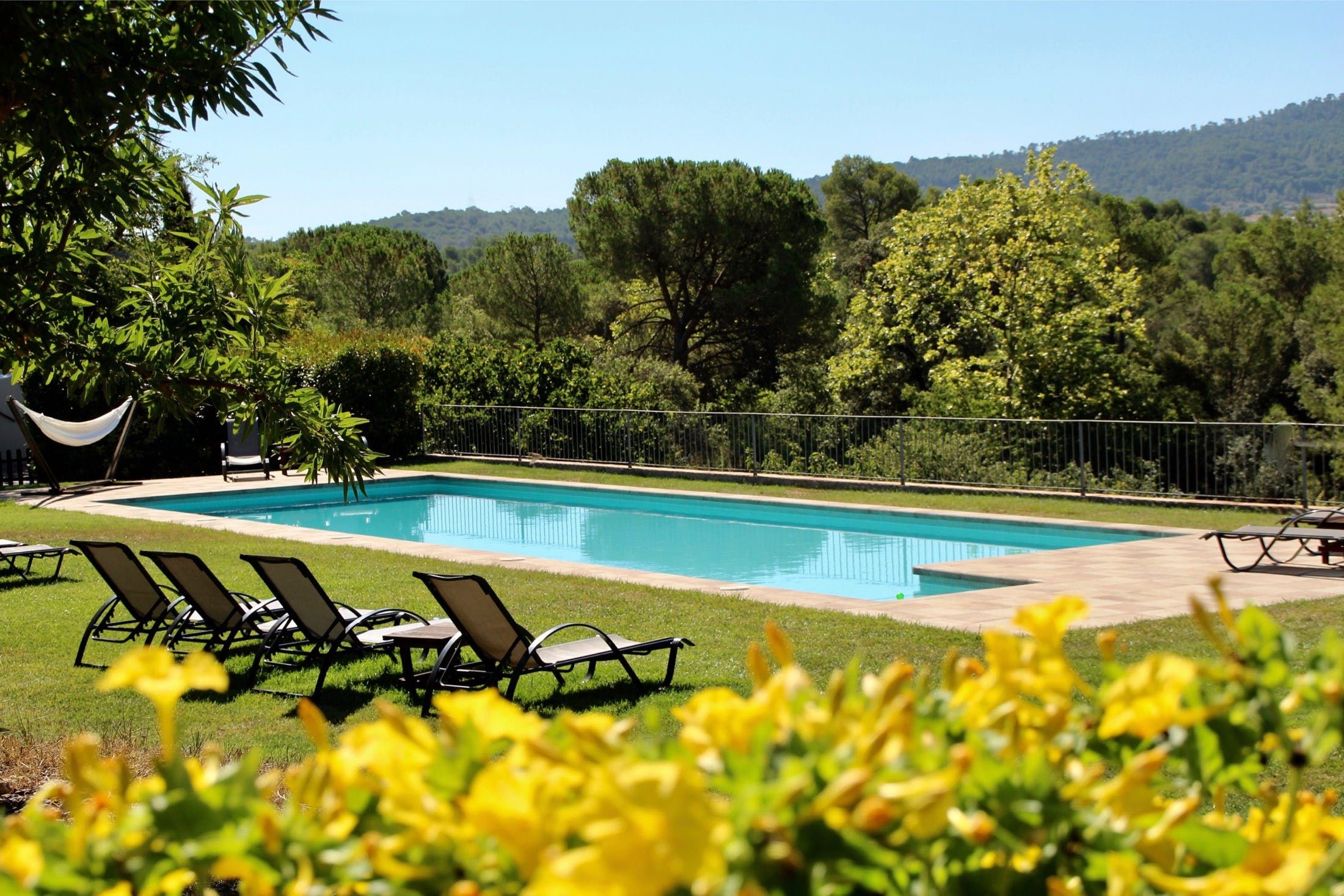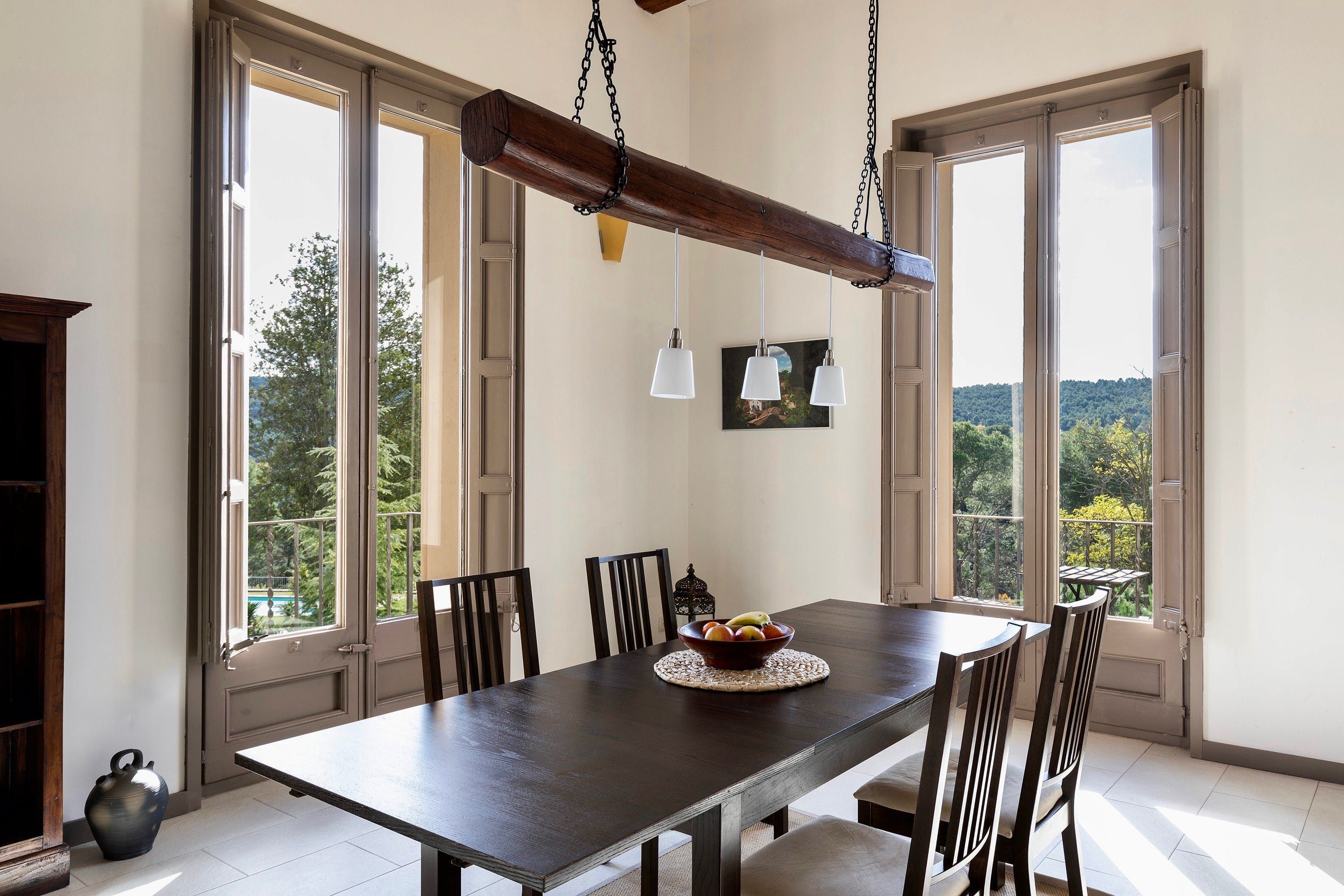 Serve up on the dining table, where a rustic wooden lighting feature matches the chunky timber beams of the high ceilings. We love how bright and airy the space feels, helped along the way by three balconettes where you can perch with a glass of the aforementioned wine in hand. Check out the views of the lush valley, but also the communal swimming pool, gardens, playground, and table tennis spot below – not too shabby for a countryside escape.
