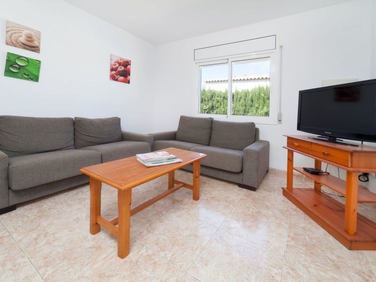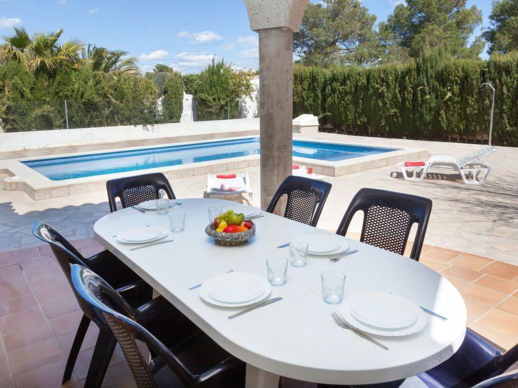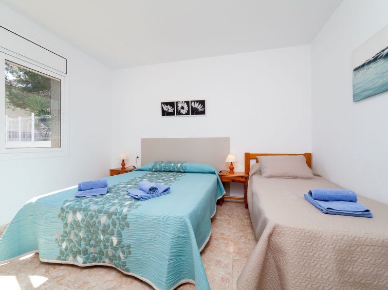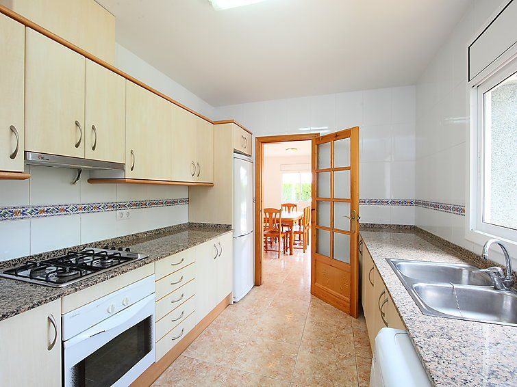 "Villa Sant Jordi", 5-room villa 150 m2. Comfortable and cosy furnishings: living/dining room with dining table, satellite TV and digital TV. Exit to the terrace. 1 room with 2 beds (90 cm). 2 rooms, each room with 1 bed (90 cm), 1 french bed (150 cm), fan. 1 room with 2 beds (90 cm).