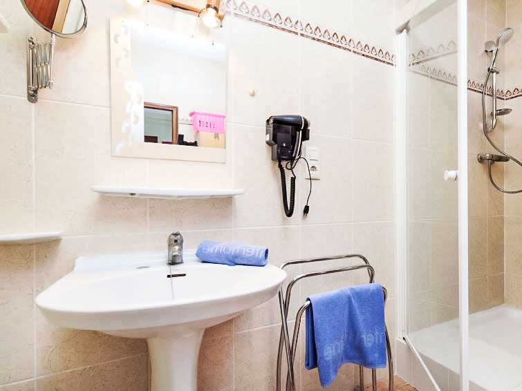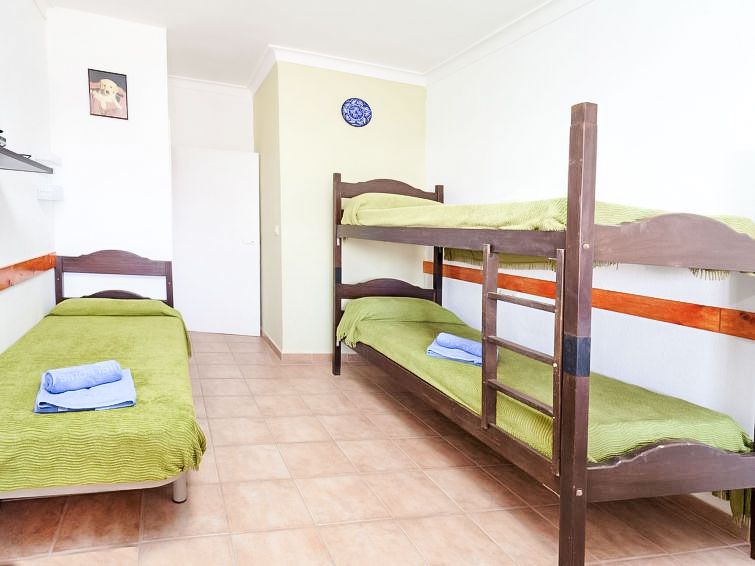 4-room apartment 80 m2 on 1st floor. Comfortable furnishings: living/dining room with satellite TV (flat screen). Exit to the terrace. 1 room with 1 french bed (135 cm, length 190 cm). 1 room with 1 french bed (160 cm, length 190 cm), hand-basin. 1 room with 1 x 2 bunk beds (80 cm, length 190 cm), 1 french bed (160 cm, length 200 cm).