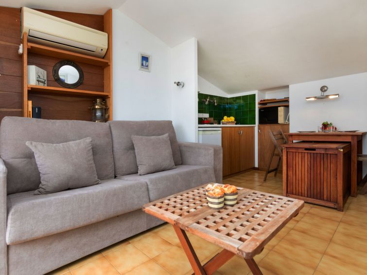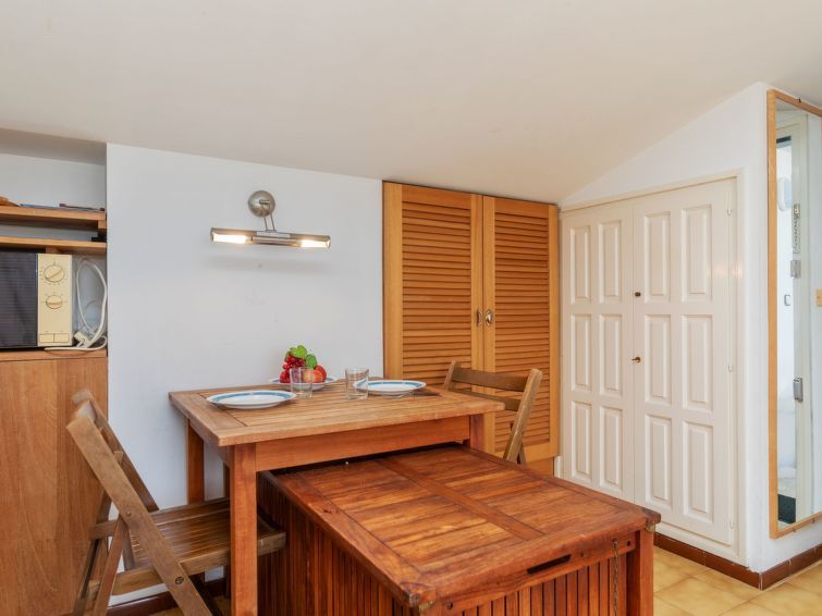 "Port L'Escala L4", 1-room studio 25 m2 on 5 levels. With sloping ceilings, rustic furnishings: living/sleeping room with 1 sofabed (135 cm, length 180 cm), cable TV (flat screen), air conditioning and forced-air heating. Exit to the terrace. Open kitchen (3 hot plates, microwave, electric coffee machine).