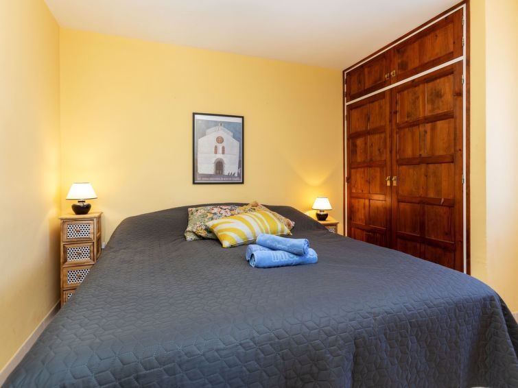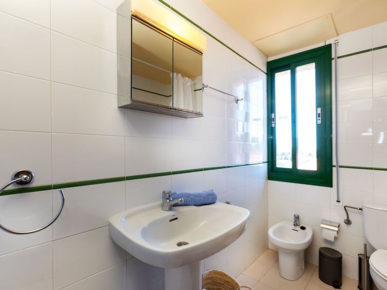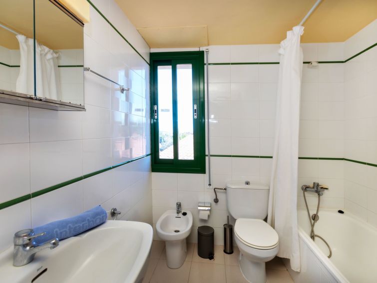 "Mediterrani", 3-room apartment 77 m2. Bright, practical furnishings: living/dining room with dining table, TV, digital TV, air conditioning and forced-air heating. Exit to the terrace. 1 room with 1 french bed (180 cm, length 200 cm), air conditioning and forced-air heating. 1 children's room with 1 bed and 1 x 2 bunk beds.