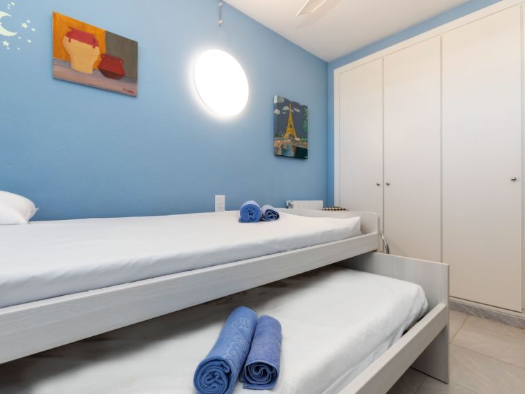 "Edificio Luxor II", 3-room apartment 65 m2. Practical and comfortable furnishings: living/dining room with dining table, digital TV and air conditioning. Exit to the balcony. 1 room with 1 french bed (140 cm, length 190 cm), fan. 1 room with 2 beds (90 cm, length 190 cm), fan. Open kitchen (oven, dishwasher, 3 ceramic glass hob hotplates, toaster, kettle, microwave, electric coffee machine, combination microwave).