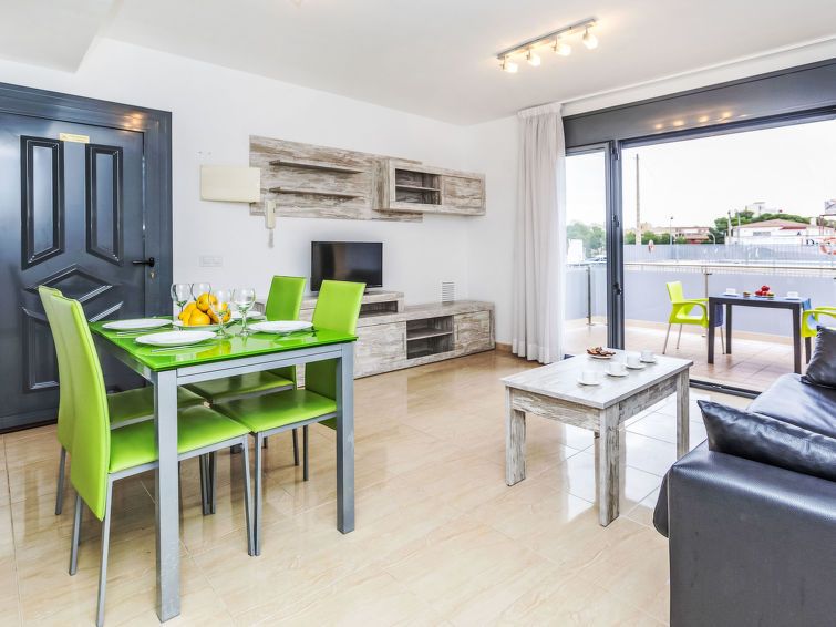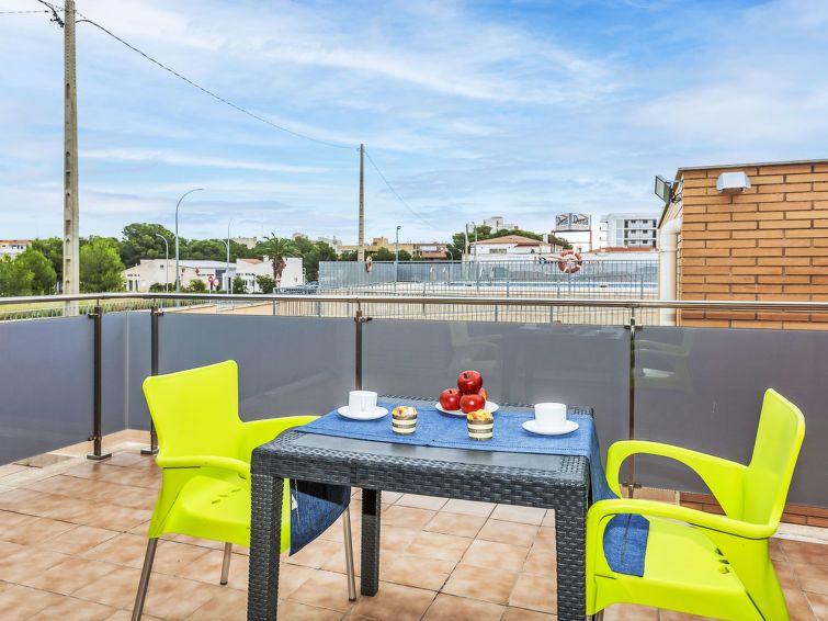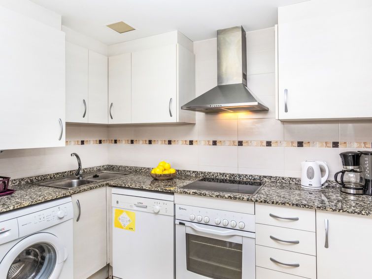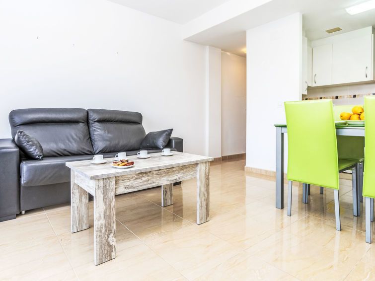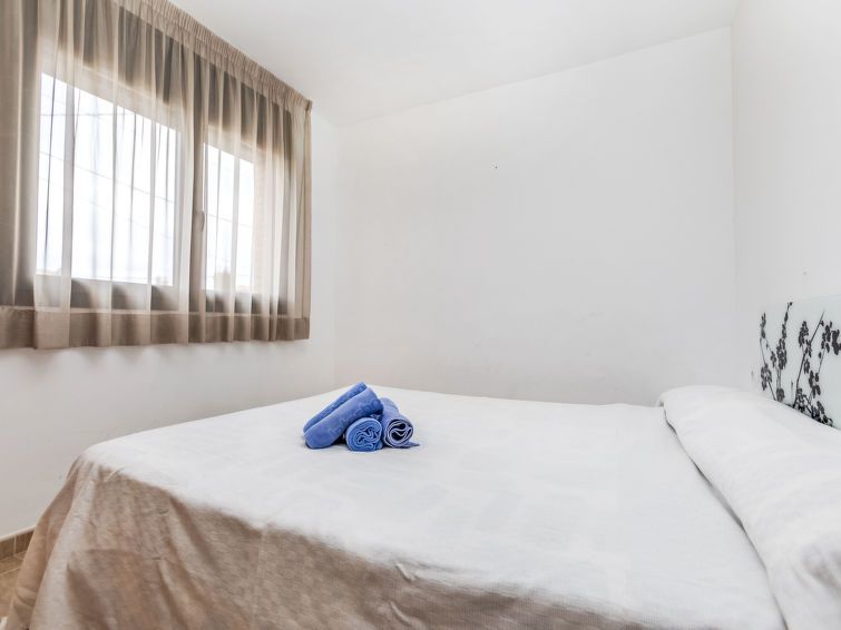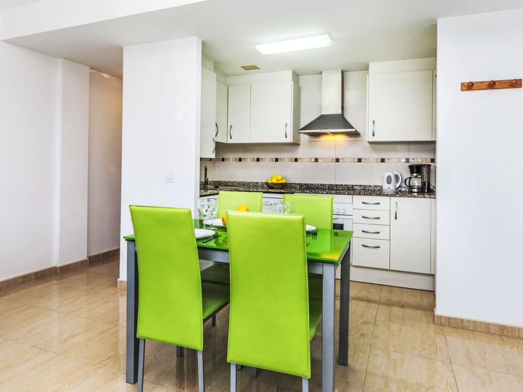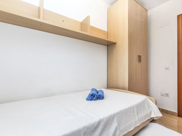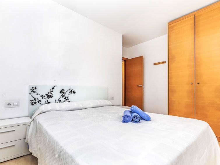 "Menorca II", 3-room apartment 66 m2. Practical and cosy furnishings: living/dining room with digital TV, flat screen and air conditioning. Exit to the terrace. 1 room with 1 french bed (150 cm, length 190 cm), air conditioning. 1 room with 2 beds (90 cm), air conditioning. Open kitchen (oven, 4 ceramic glass hob hotplates, toaster, kettle, microwave, freezer, electric coffee machine).