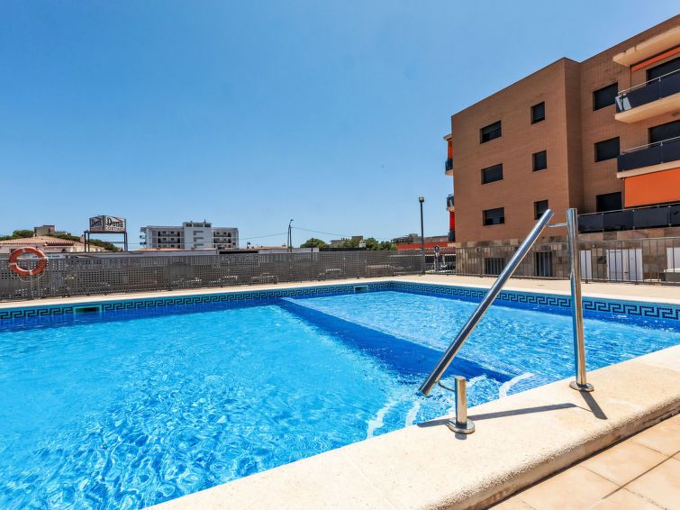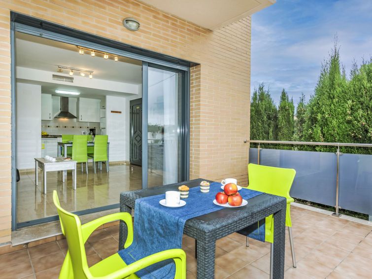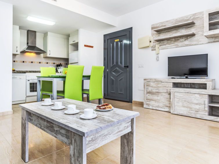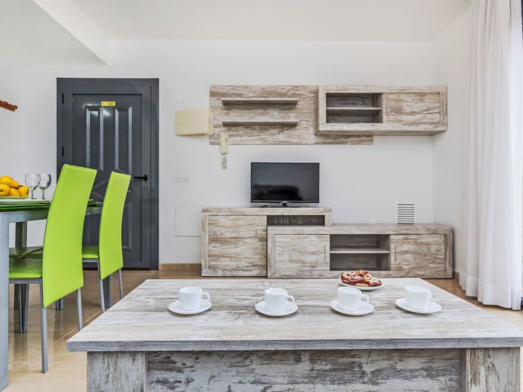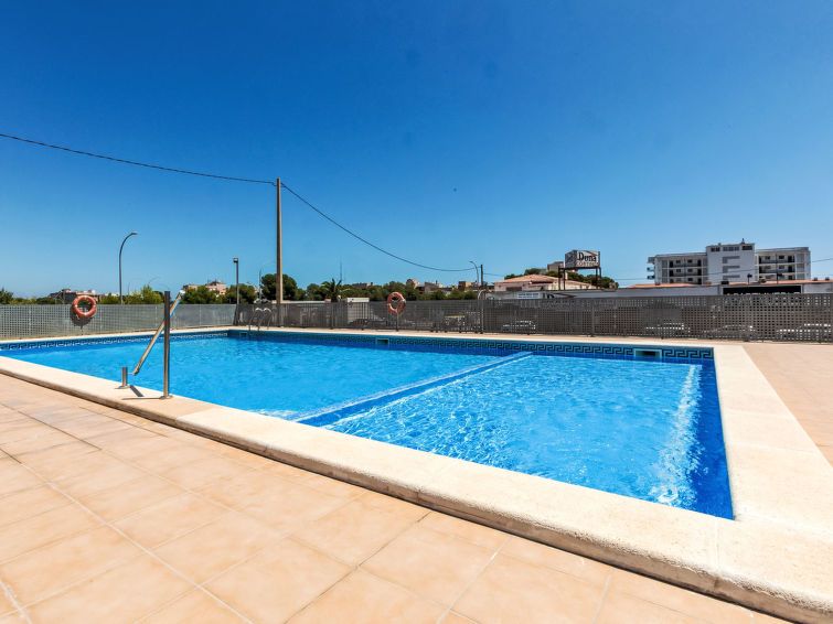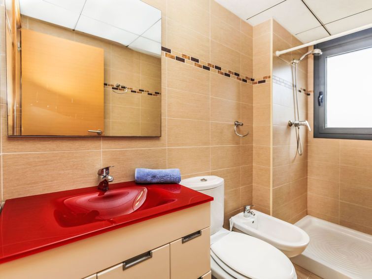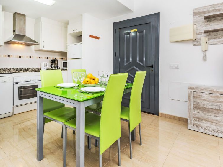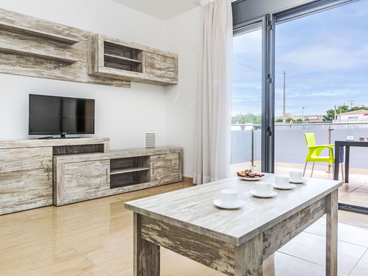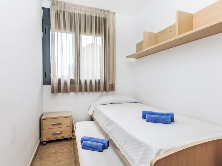 "Menorca II", 3-room apartment 66 m2. Practical and cosy furnishings: living/dining room with digital TV, flat screen and air conditioning. Exit to the terrace. 1 room with 1 french bed (150 cm, length 190 cm), air conditioning. 1 room with 2 beds (90 cm), air conditioning. Open kitchen (oven, 4 ceramic glass hob hotplates, toaster, kettle, microwave, freezer, electric coffee machine).