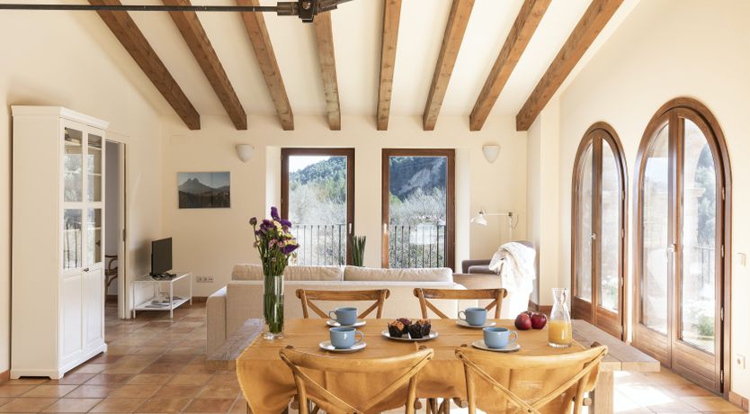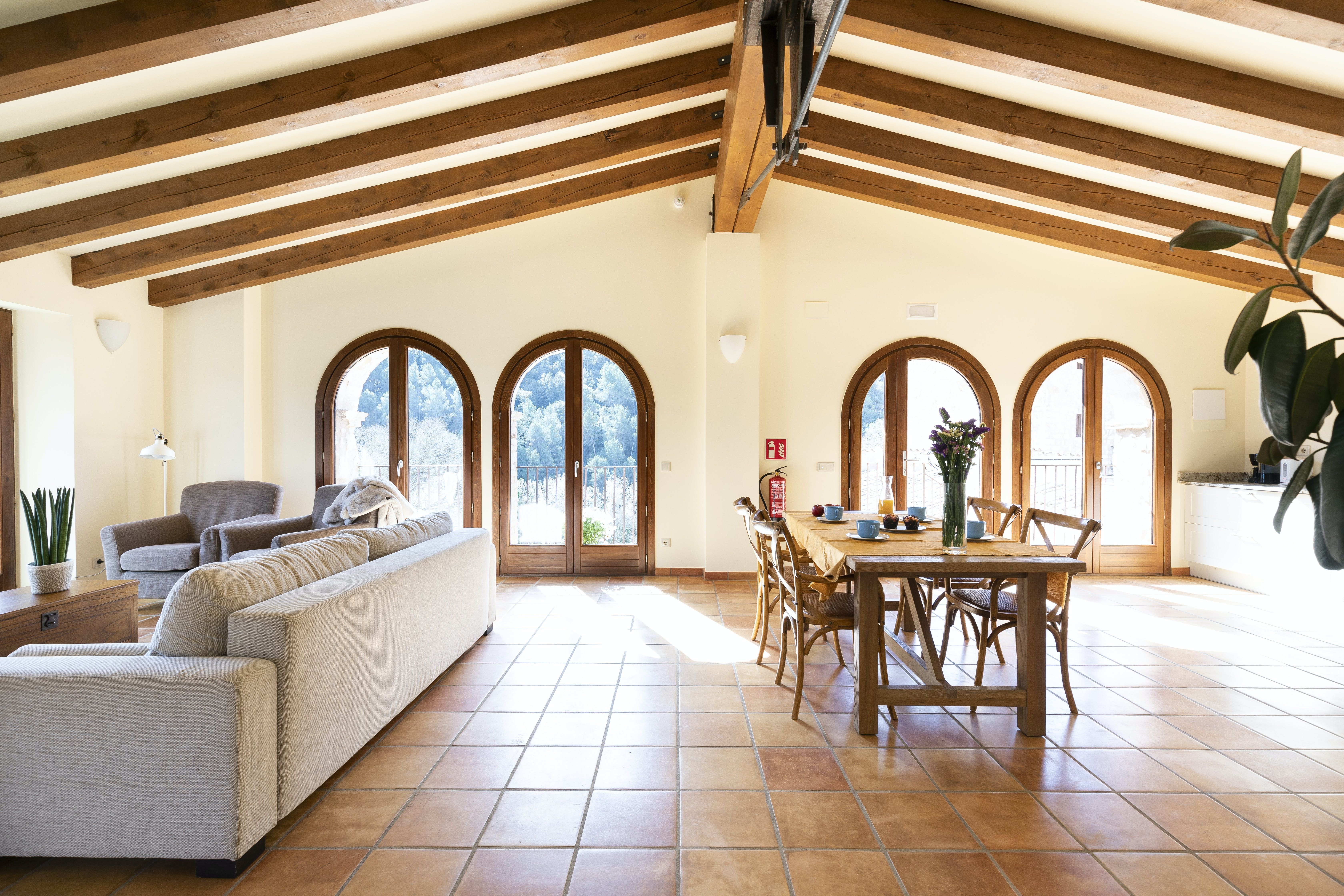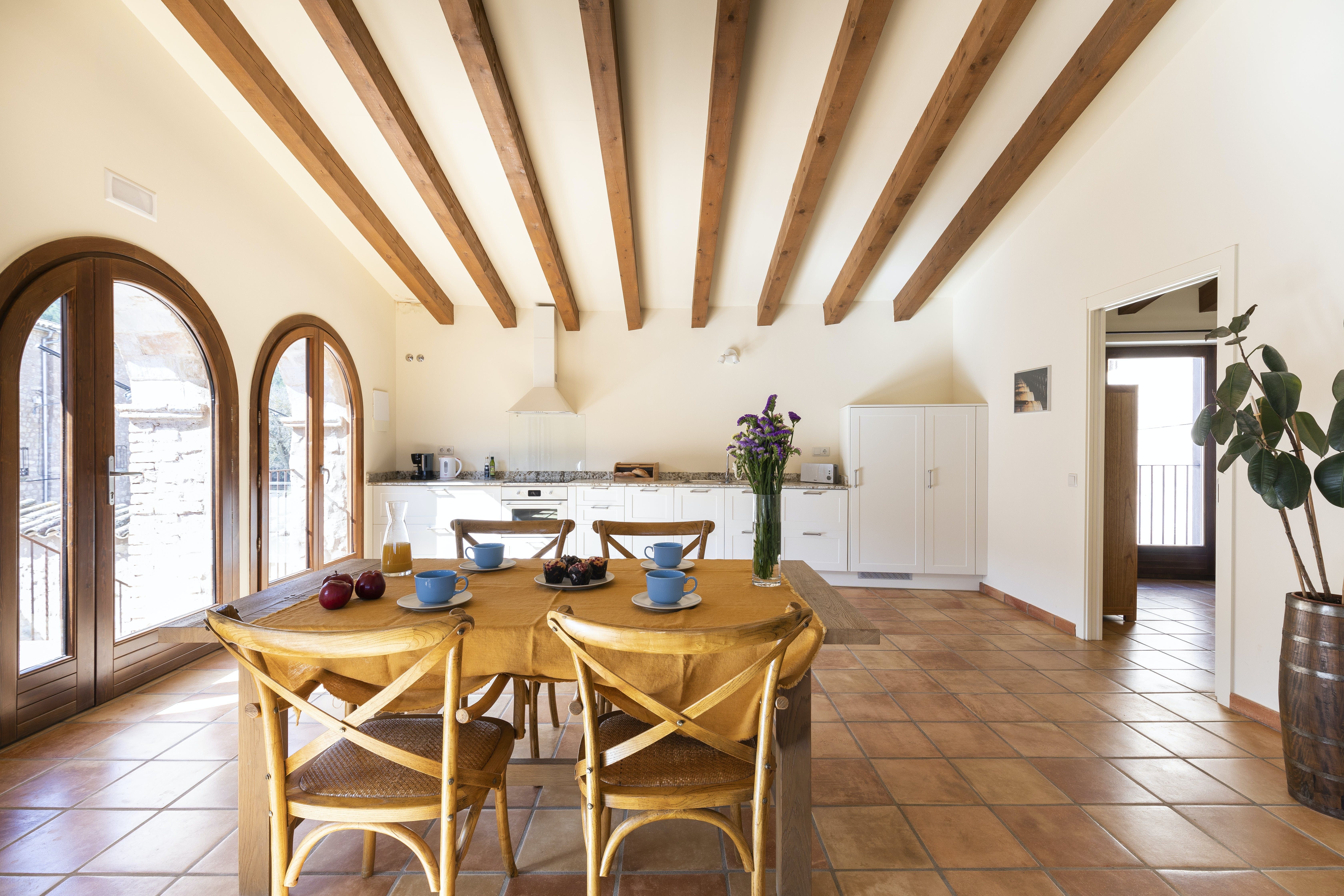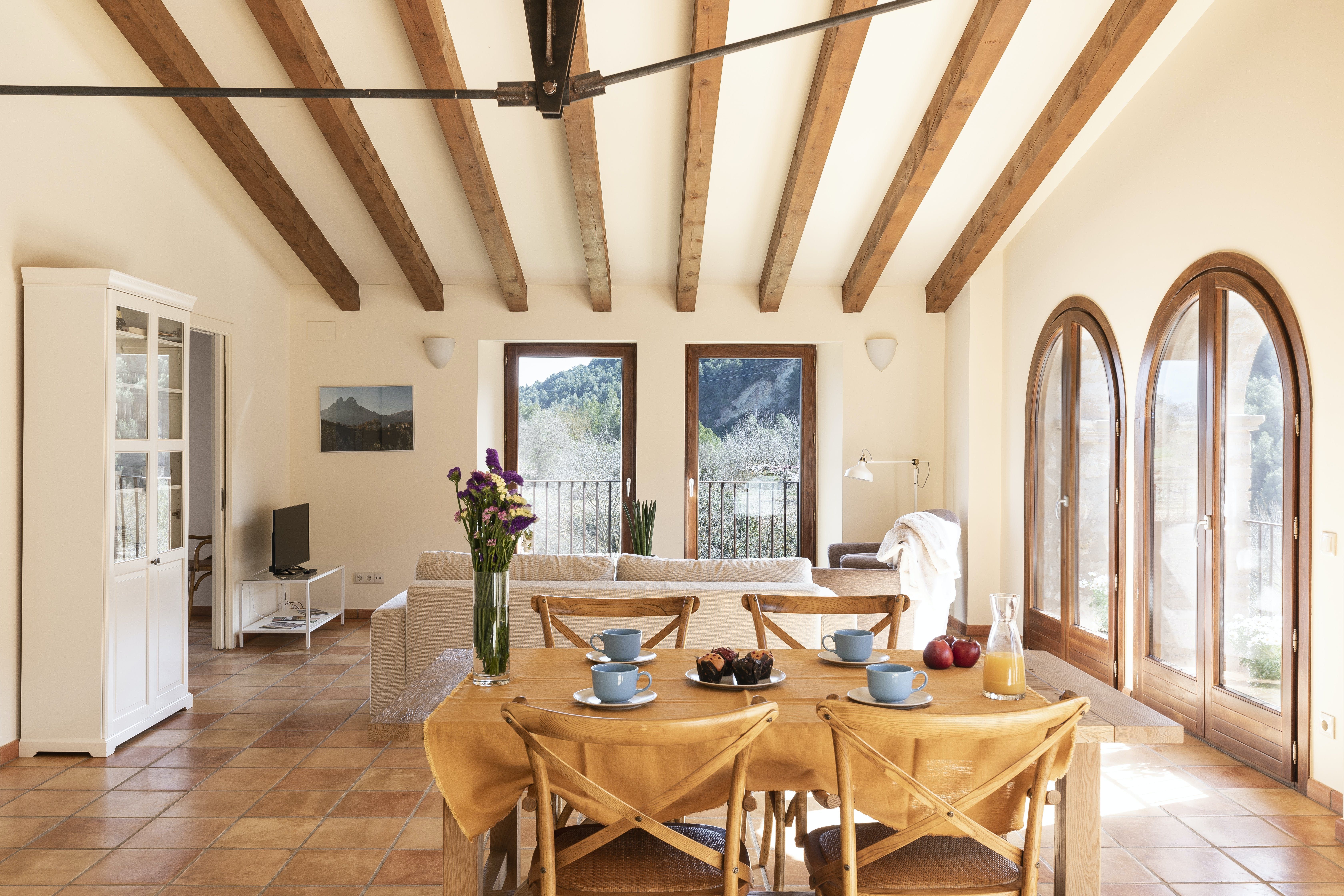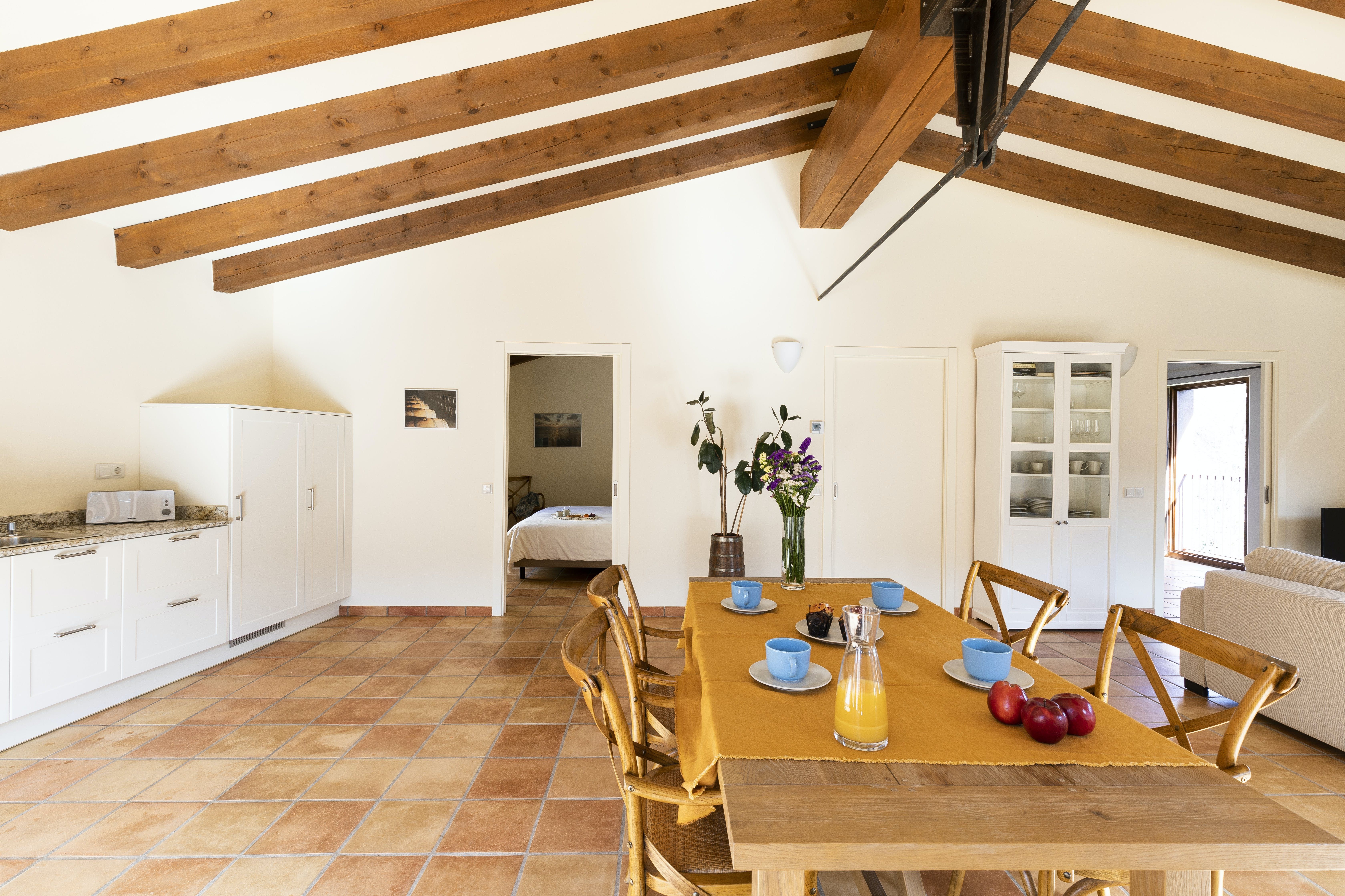 The apartment itself is sun-bright with old arched windows letting the light stream in, along with beautiful views of the green hills. Wooden beams line high ceilings and the living area is an open, breezy spot to unwind and socialise. Terracotta floor tiles keep things cool underfoot throughout, and bedrooms come with stunning country views from big, ancient windows. Should you want to make the most of your natural surroundings, enjoy long lazy lunches on the covered terrace with nothing but birdsong as your soundtrack.