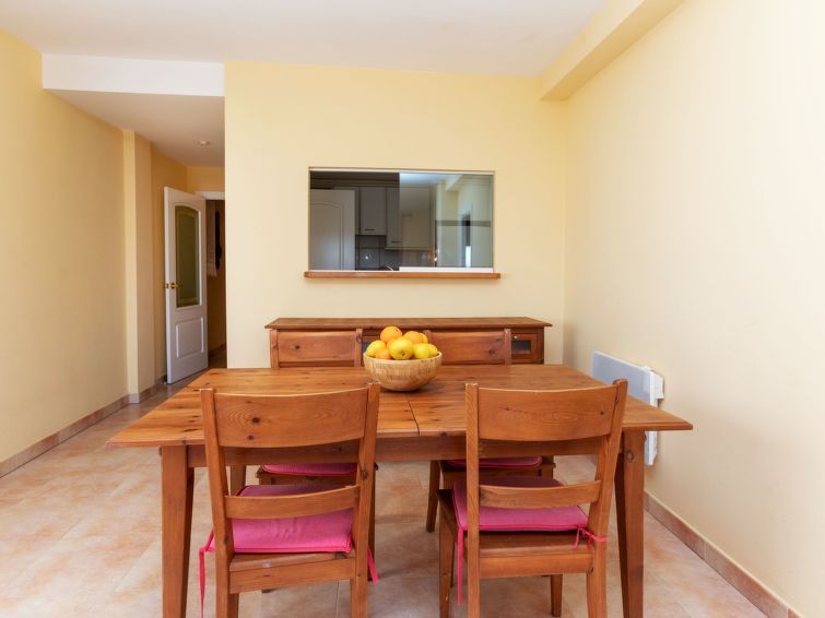 "Port Pals F", 4-room apartment 95 m2, on the ground floor. Practical furnishings: living/dining room with digital TV and electric heating. Exit to the patio. 1 room with 1 french bed (135 cm, length 190 cm). 1 room with 1 french bed (140 cm, length 200 cm), bath/WC. 1 room with 1 x 2 bunk beds (90 cm, length 190 cm).
