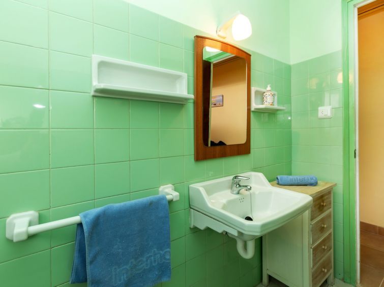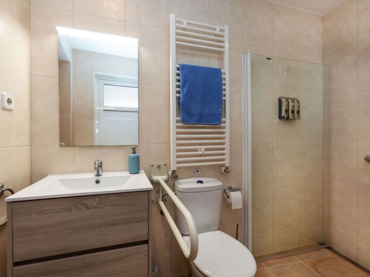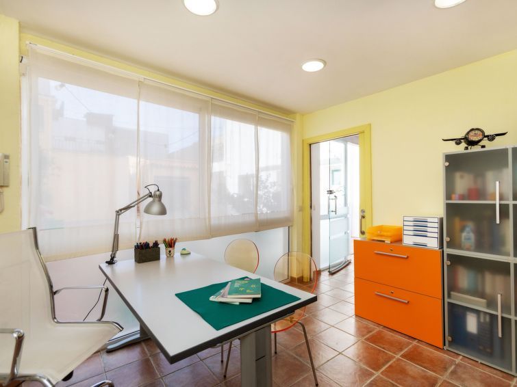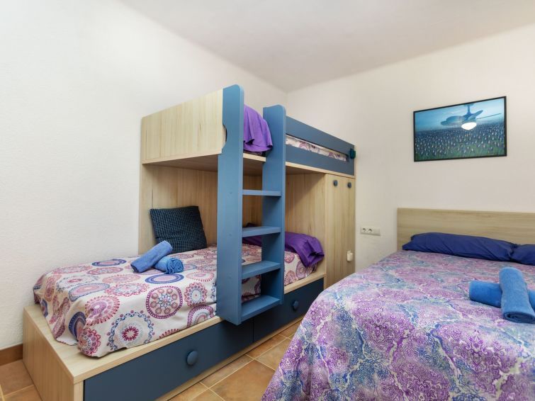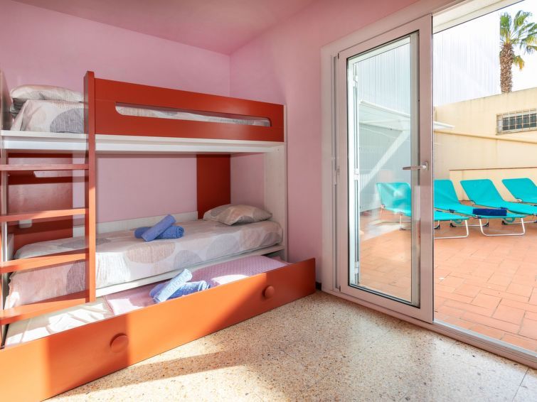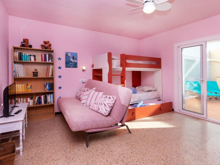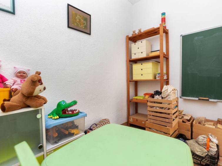 5-room house 180 m2 on 2 levels. Practical furnishings: living/dining room with digital TV. 1 room with 1 x 2 bunk beds (90 cm, length 190 cm), 1 french bed (1 x 150 cm, length 190 cm), shower/WC and fan. Exit to the terrace. Kitchen (4 hot plates, oven, dishwasher, toaster, kettle, electric coffee machine).
