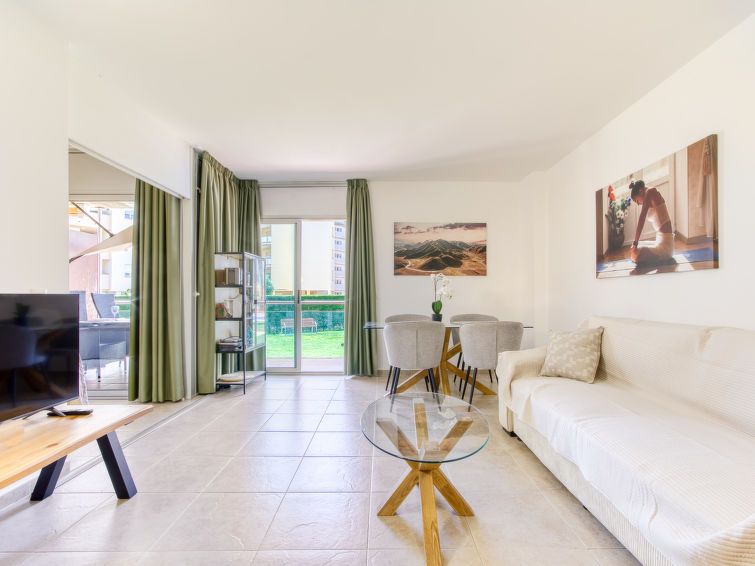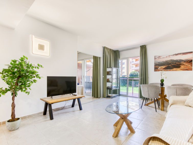 3-room apartment 56 m2, on the ground floor. Spacious and bright: living/dining room with dining table, TV, air conditioning and forced-air heating. Exit to the terrace, south facing position and west facing position. 1 room with 1 french bed (150 cm, length 190 cm), air conditioning and forced-air heating.