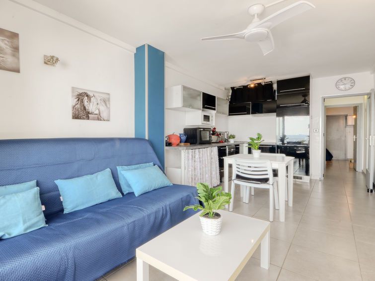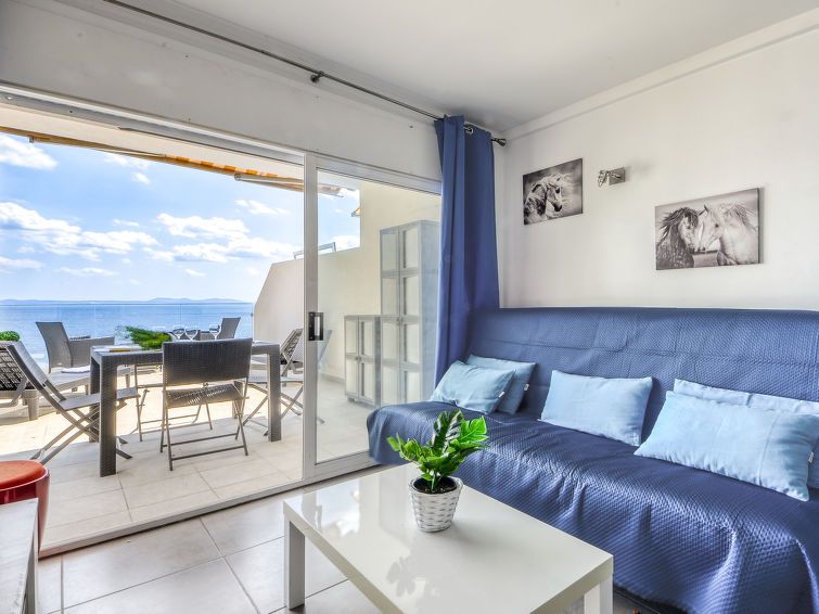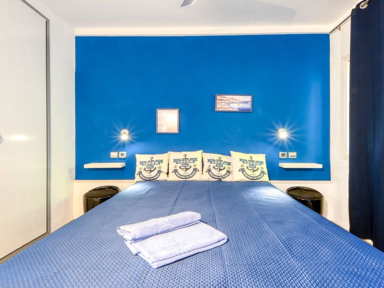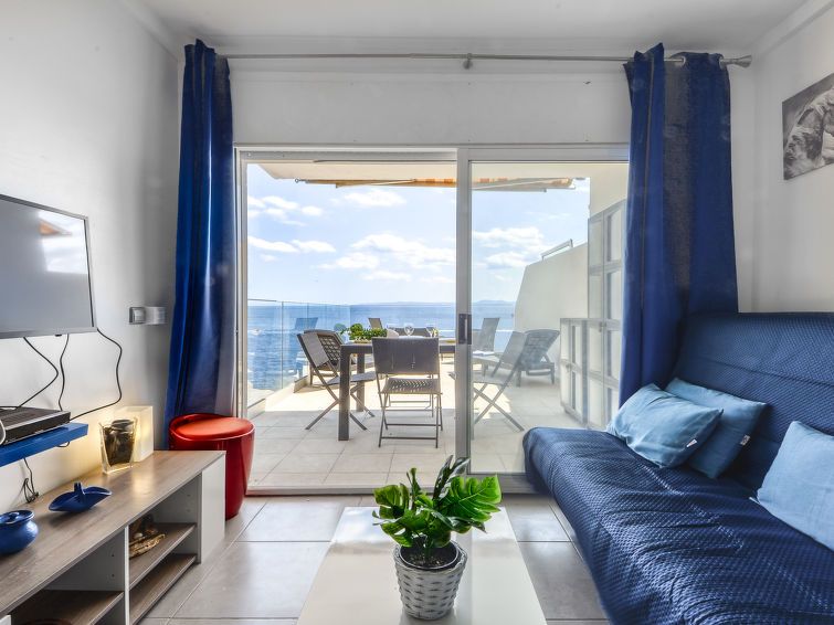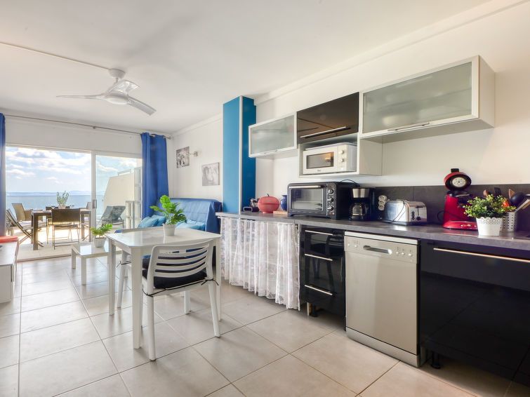 2-room apartment 33 m2, south-west facing position. Bright, practical and comfortable furnishings: living/dining room with 1 sofabed (135 cm, length 90 cm), dining table, satellite TV, digital TV and fan. Exit to the terrace, south facing position and west facing position. 1 open room with 1 french bed (140 cm, length 200 cm).