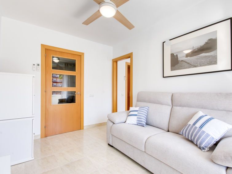 2-room apartment 41 m2. Bright, practical and cosy furnishings: living/sleeping room with 1 double sofabed (140 cm, length 190 cm), satellite TV, air conditioning and forced-air heating. Exit to the terrace. 1 room with 1 french bed (150 cm, length 190 cm). Exit to the terrace. Open kitchen in the entrance (4 ceramic glass hob hotplates, toaster, kettle, microwave, freezer).