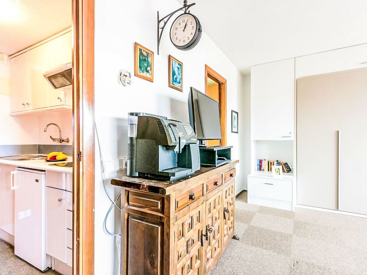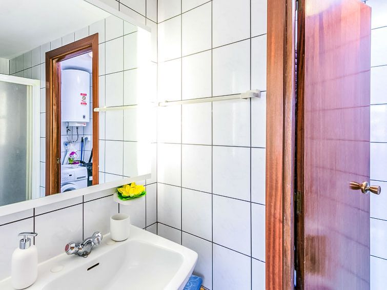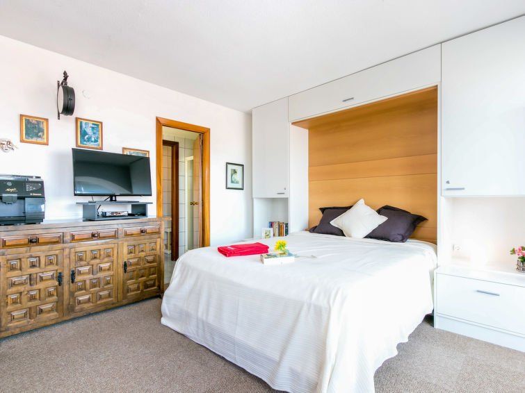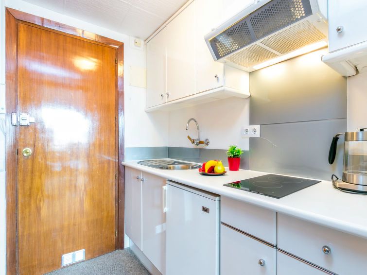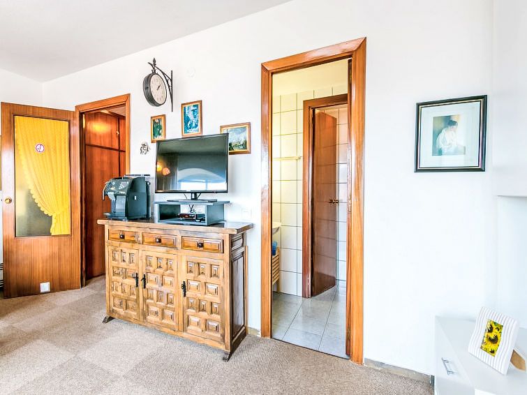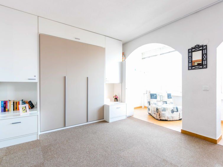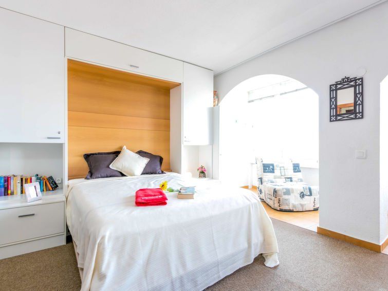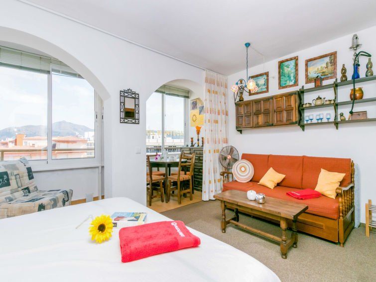 1-room studio 32 m2 on 7th floor. Very simple and rustic furnishings: living/dining room with 1 sofabed, 1 double fold-away bed and satellite TV. Exit to the veranda. Small, open kitchen in the entrance (2 ceramic glass hob hotplates). Shower/WC. No heating option. Terrace 7 m2. Side view of the sea.