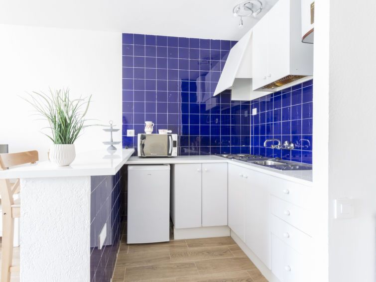 1-room studio 28 m2, on the ground floor. Practical furnishings: open living/sleeping room with 1 sofabed, dining table, kitchen corner, bar, TV, air conditioning and forced-air heating. Exit to the balcony, south facing position and west facing position. Kitchenette (4 hot plates, microwave, electric coffee machine).