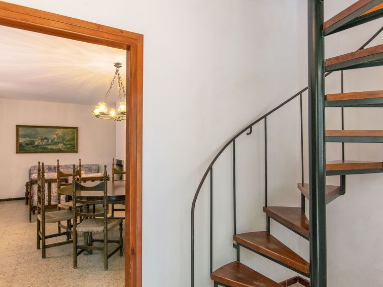 "S'Esquirol Nº4", 4-room apartment 110 m2 on 2 levels on 2nd floor. Very simple and rustic furnishings: living/dining room with open-hearth fireplace (only for decoration), dining table and digital TV. Exit to the terrace. Small kitchen (3 hot plates, oven, microwave). Sep. WC. Upper floor: 2 rooms, each room with 2 beds (80 cm, length 190 cm).