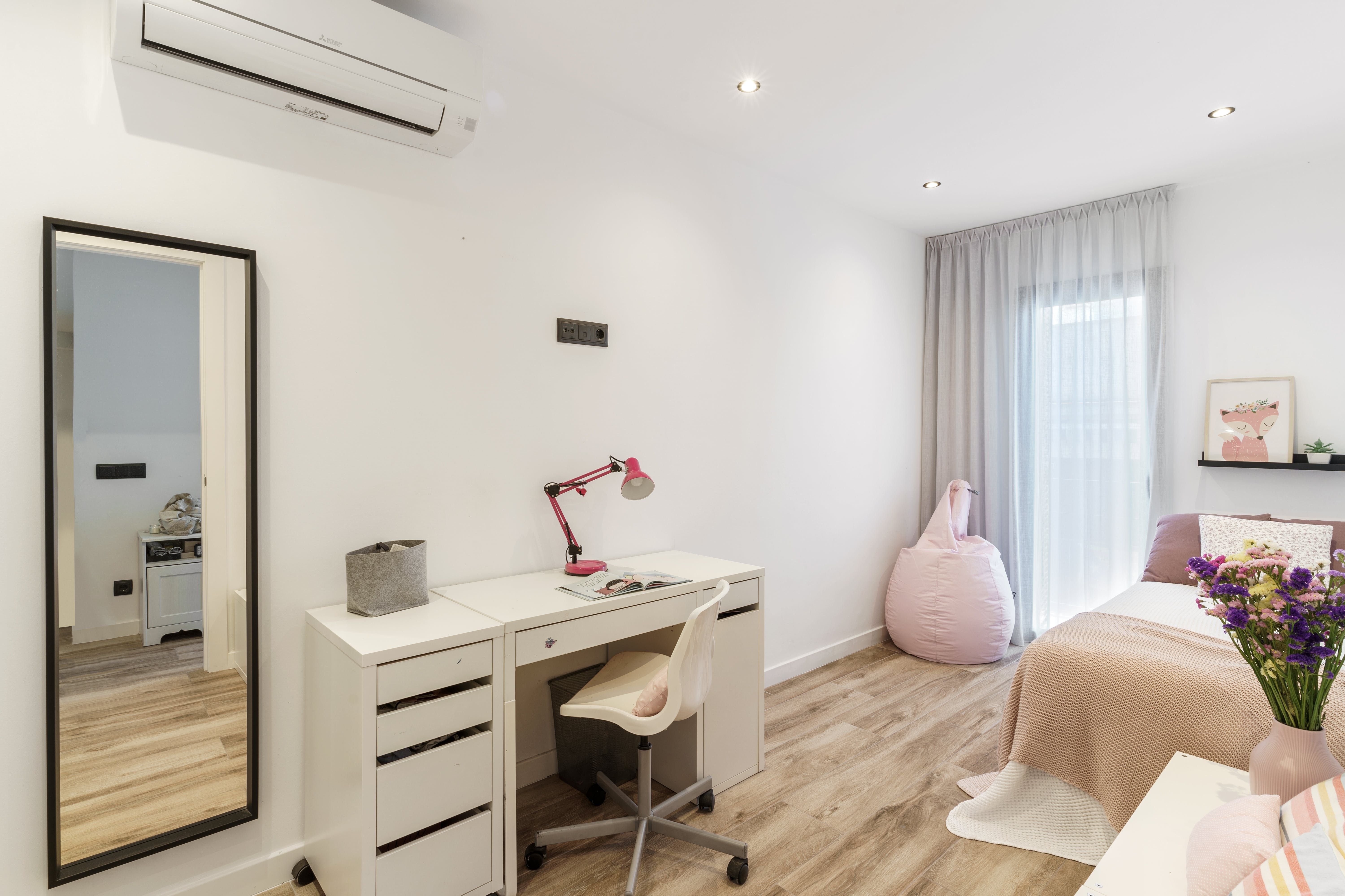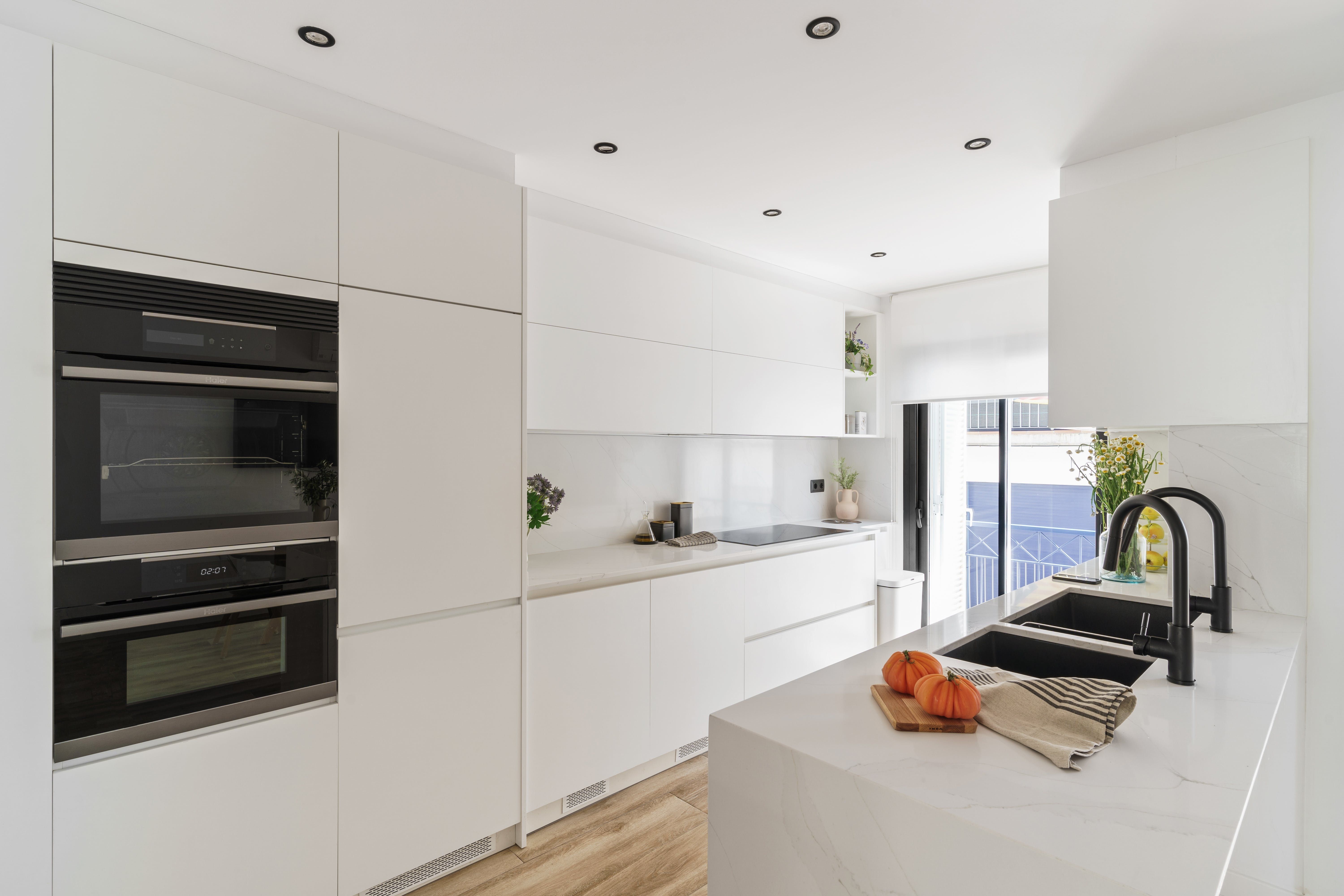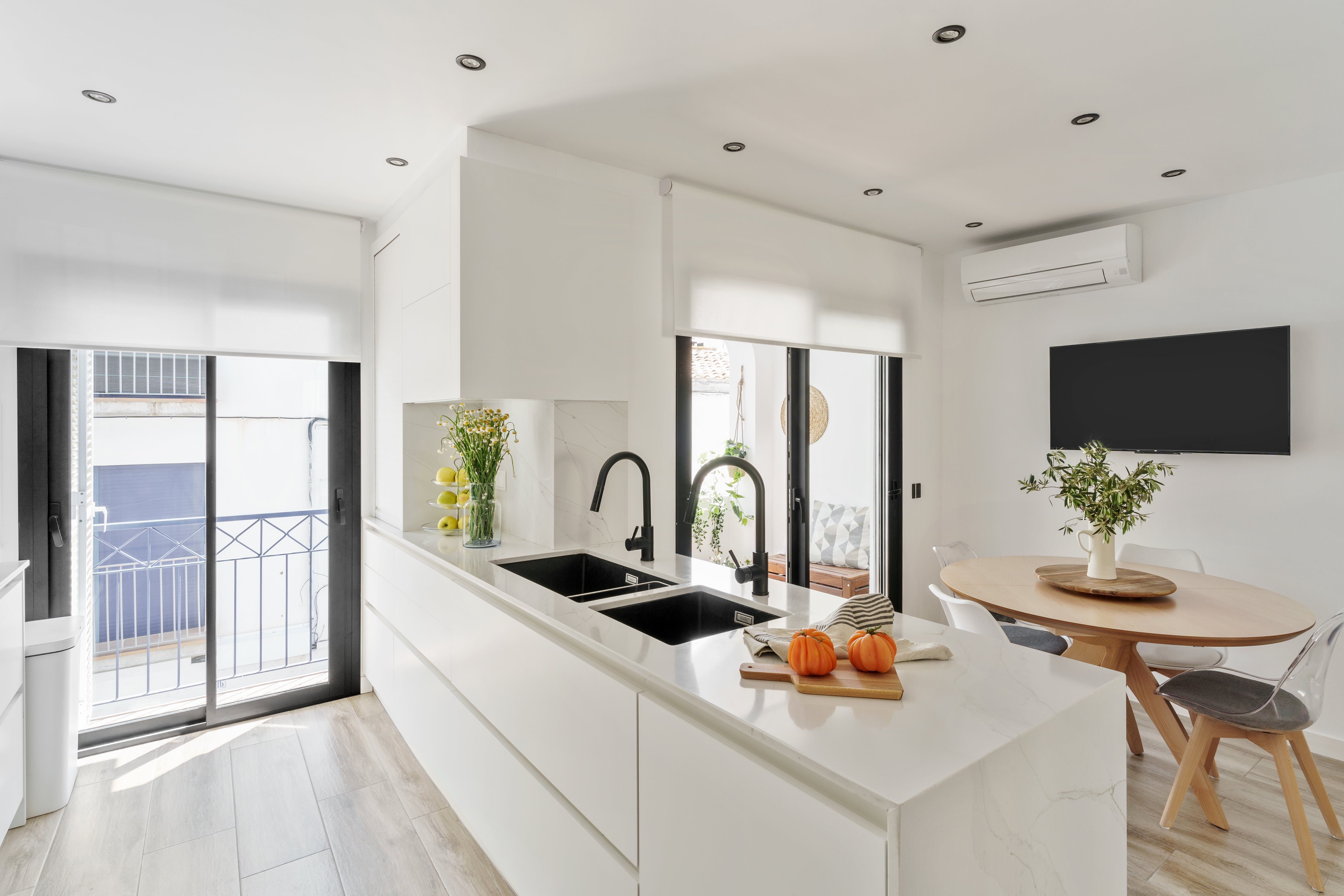 As you wander about, you can't fail to notice just how bright and welcoming the design is, something aided by the large windows and stark white walls that accentuate the bountiful amounts of natural light that stream inside. Cleansing colours seem to be a recurring theme here, whether in the sleek surfaces of the minimalist kitchen or the equally contemporary bathrooms, one with a hydromassage bathtub for good measure.