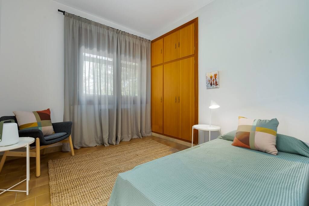 The interior offers plenty of ways to relax as well. The design is a modern take on Mediterranean rustic style, with white walls, wooden ceiling beams and tiled flooring making for a cooling place to escape the sunshine for a while. On the top floor, there's a large balcony, but down in the basement, you have a versatile space that has been used as a games room, meeting room and even a disco in the past.