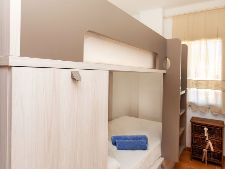 "Gemma", 4-room apartment 70 m2 on 3rd floor. Practical furnishings: living/dining room with satellite TV, international TV channels and air conditioning. Exit to the terrace. 1 room with 1 french bed (150 cm, length 190 cm), shower/WC. Exit to the terrace. 2 rooms, each room with 1 x 2 bunk beds (90 cm, length 190 cm).