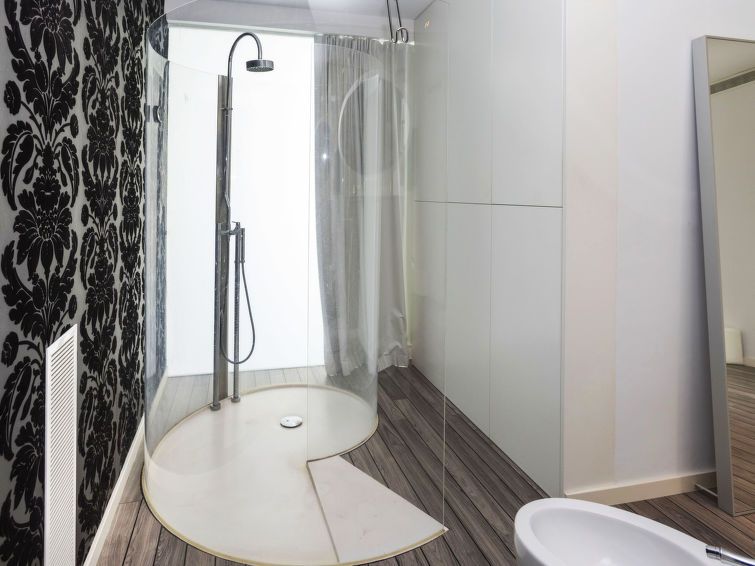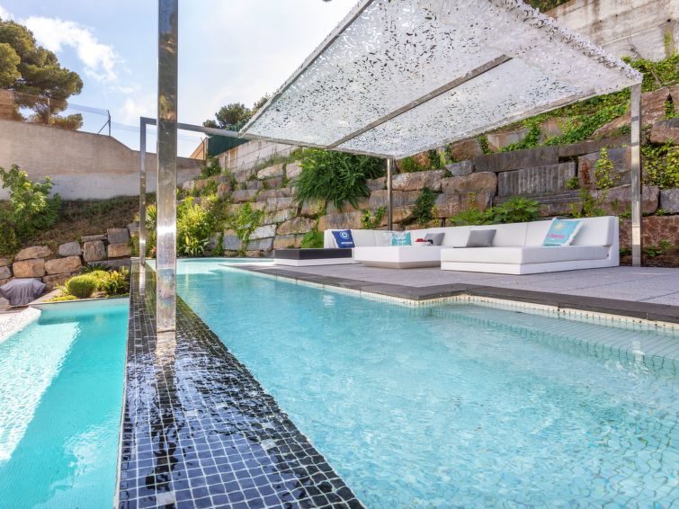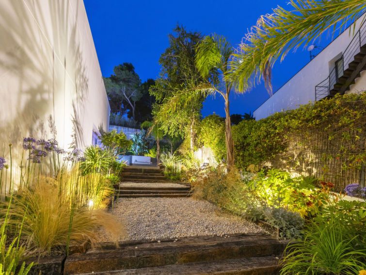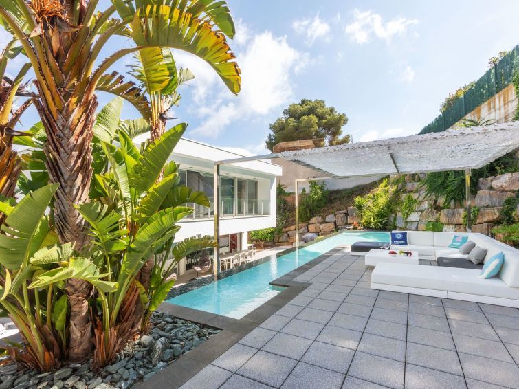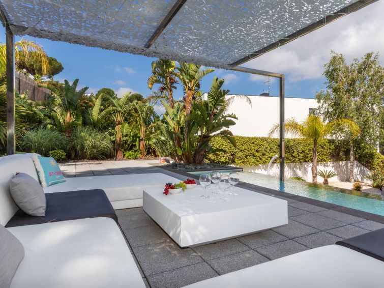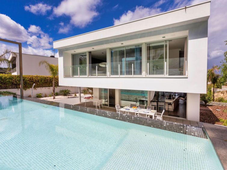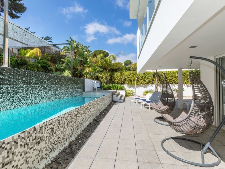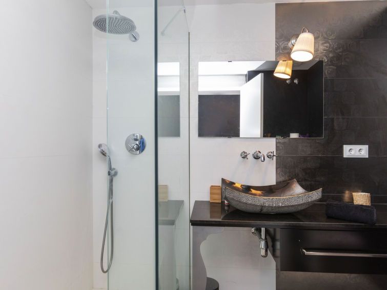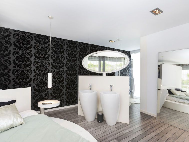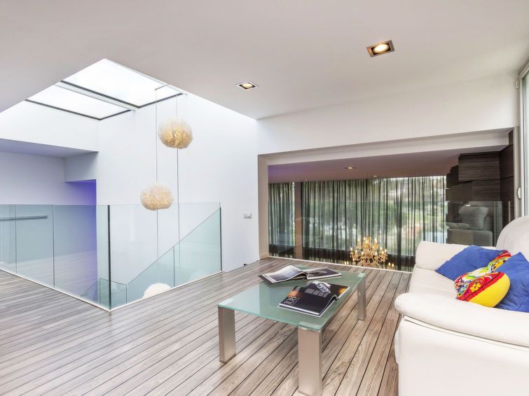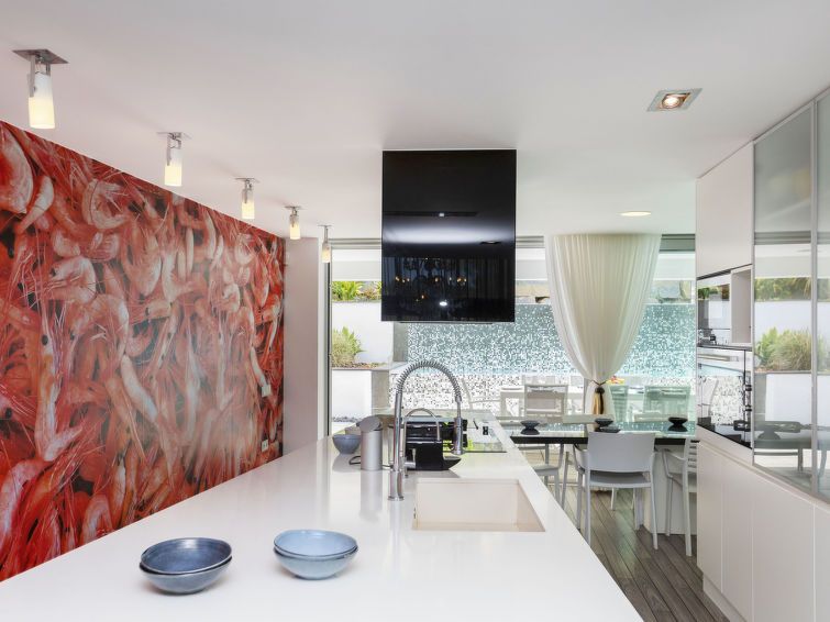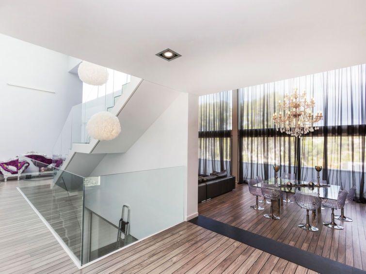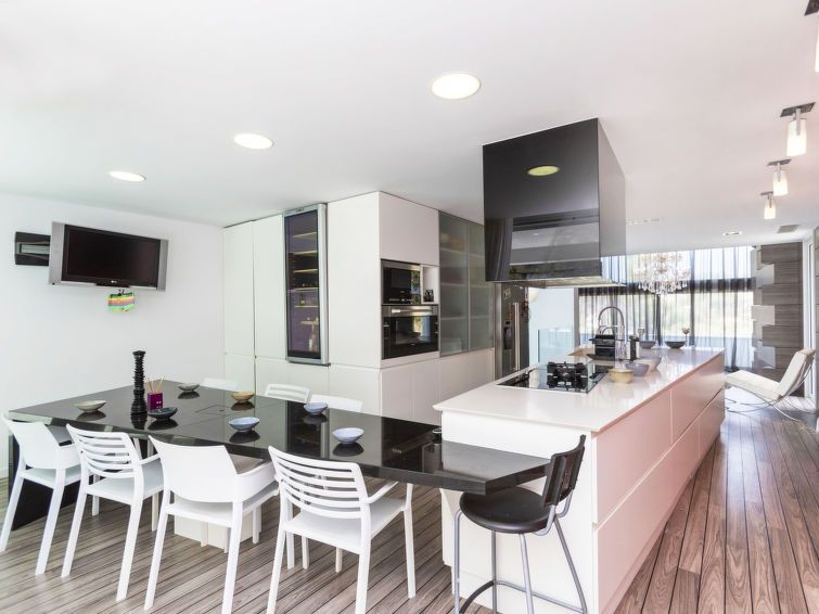 "Nathalie", 5-room villa 450 m2 on 3 levels. Modern and tasteful furnishings: upper floor: living/dining room, on 2 levels with satellite TV and air conditioning. Exit to the terrace. 1 room with 1 french bed (160 cm, length 200 cm), satellite TV. Exit to the terrace. Large, open kitchen (dishwasher, 2 ceramic glass hob hotplates, toaster, kettle, microwave, freezer, cooking island).
