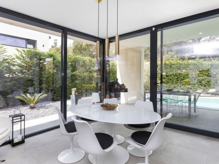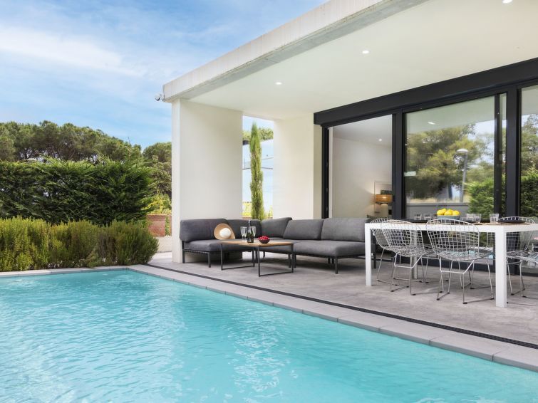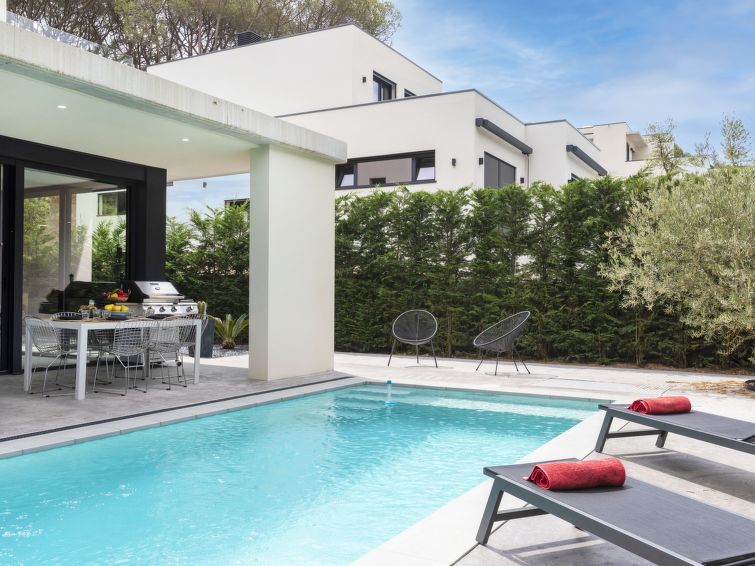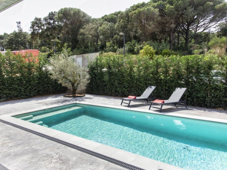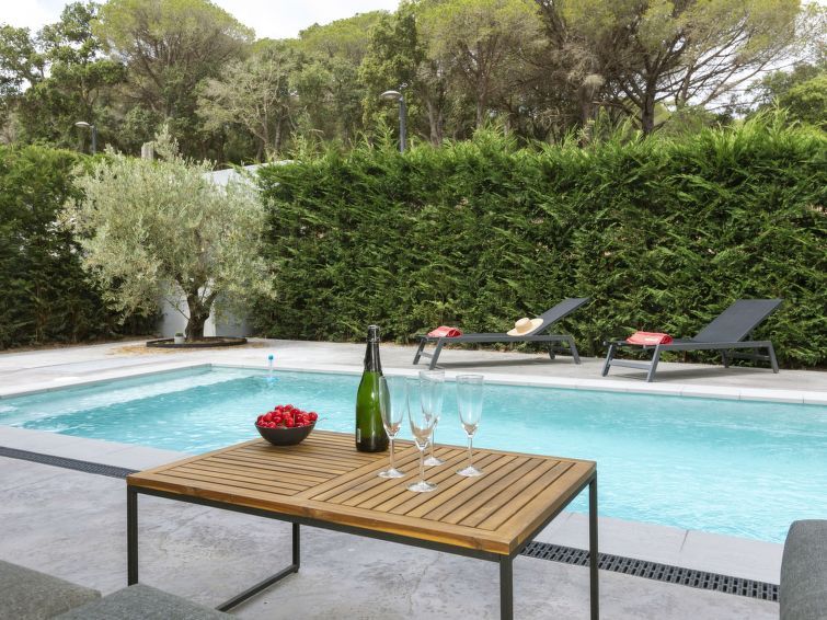 Beautiful villa with 3 air-conditioned bedrooms, 3 shower rooms and a large air-conditioned living room/kitchen. Quiet location, surrounded by forest, 10 minutes' walk from the shops/beach via a slightly difficult forest path. Beautiful small pool with 4 deckchairs. Special mention for the barbecue/plancha.