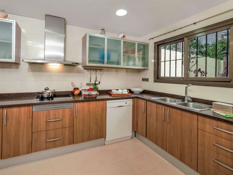"Cala Llorell", 4-room house 100 m2 on 2 levels. Very comfortable and beautiful furnishings: living/dining room with 1 sofabed (150 cm, length 190 cm), satellite TV, digital TV and air conditioning. Exit to the patio. Large kitchen (oven, dishwasher, 4 ceramic glass hob hotplates, microwave, freezer, grill, electric coffee machine).