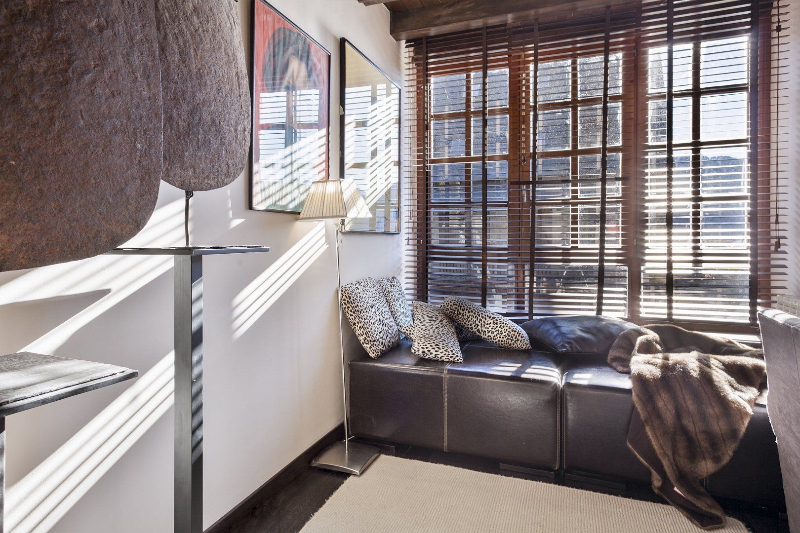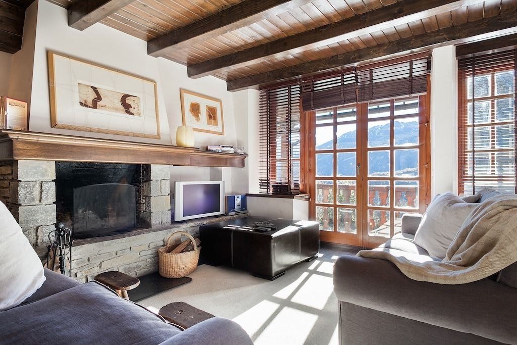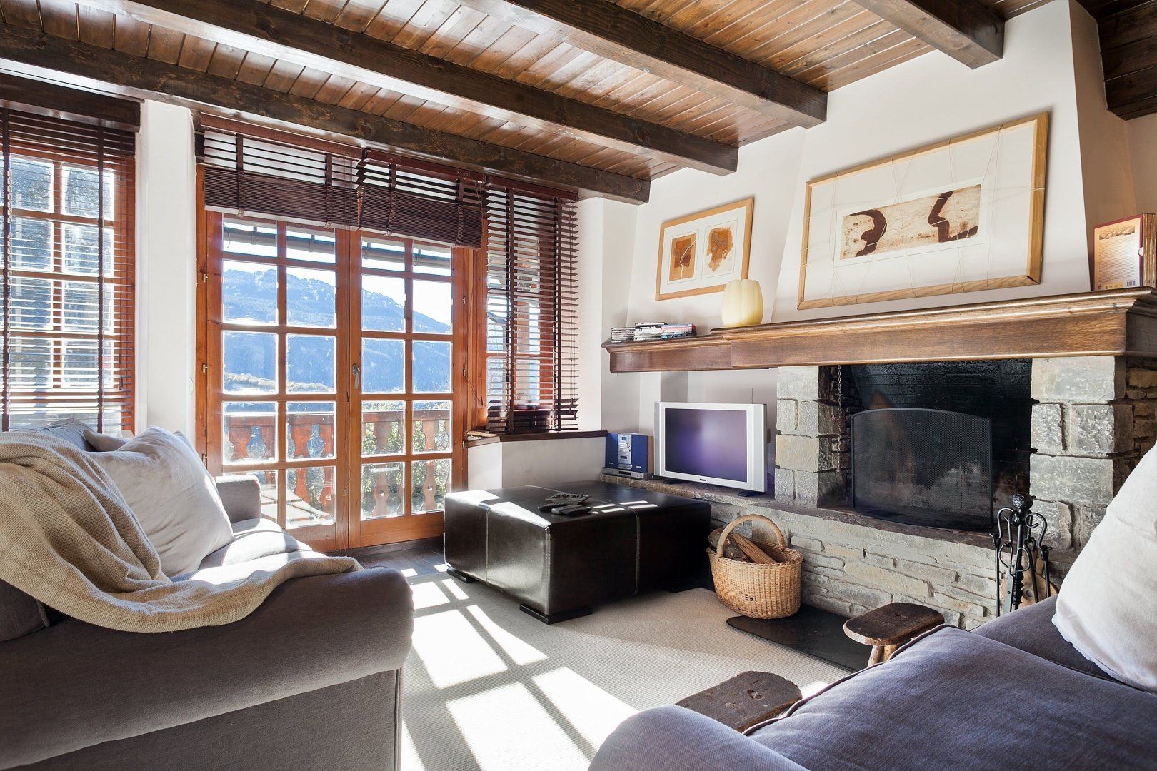 Inside the home, you'll find a snug living room flooded with natural light pouring in from the floor-to-ceiling doors. The room radiates in the summer and soothes in the winter, warmed by the gentle embers of the fireplace.