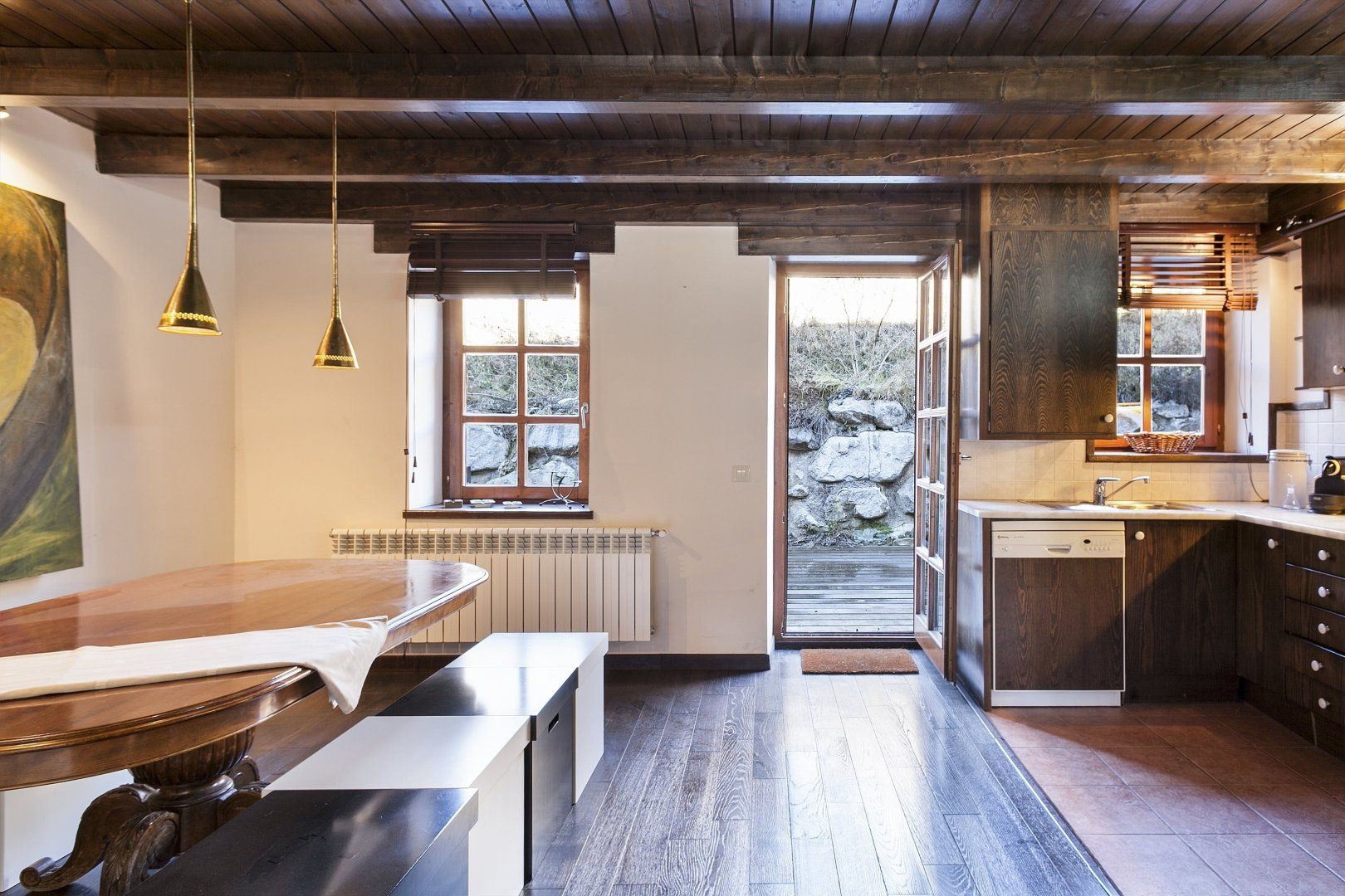 Deep brown, wooden fittings comprise the kitchen, accompanied by a stylish wooden table. Quaint and homespun, it's the type of decor that makes you feel instantly at home.